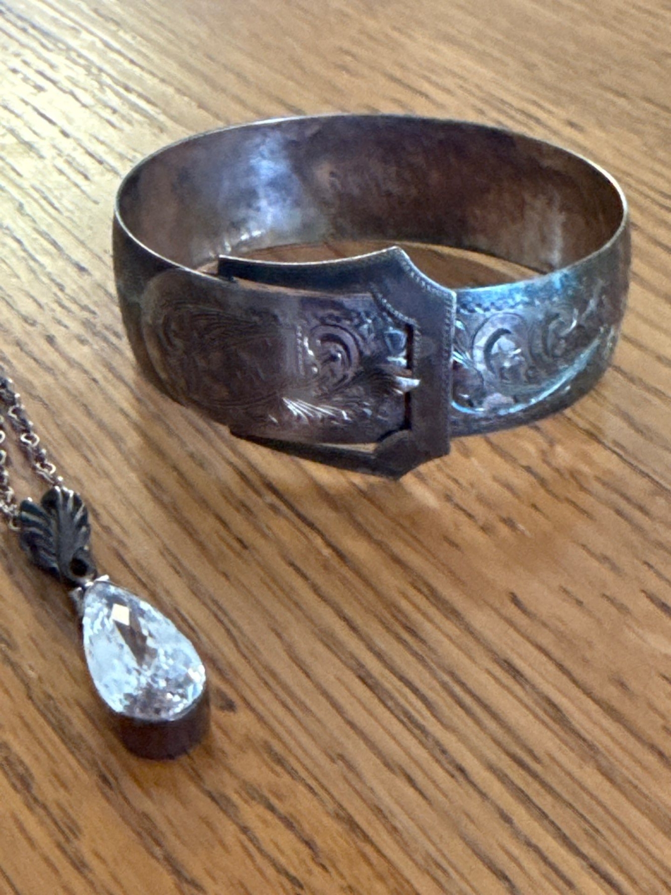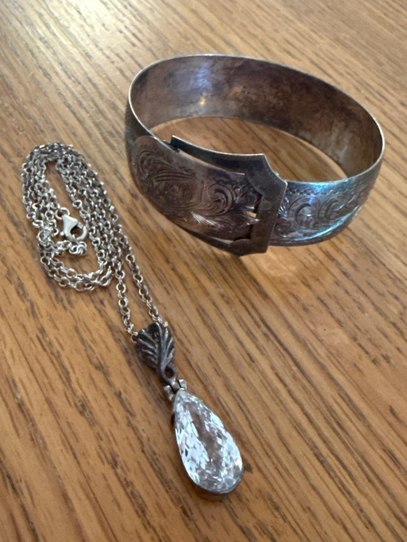 Sterling Belt Bangle w/ Sterling Pendant on Chain w/ Colorless Stone