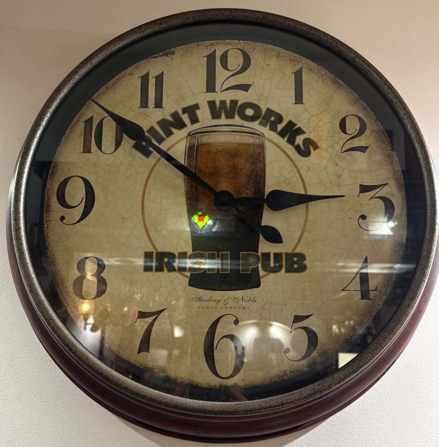 Sterling & Nobles "Pint Works Irish Pub" Wall Clock 19"diameter