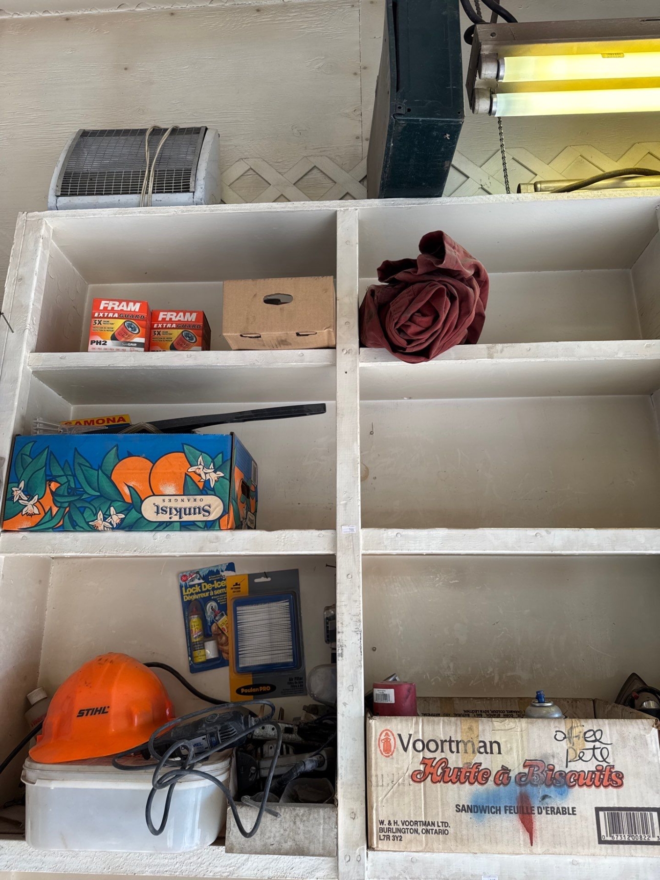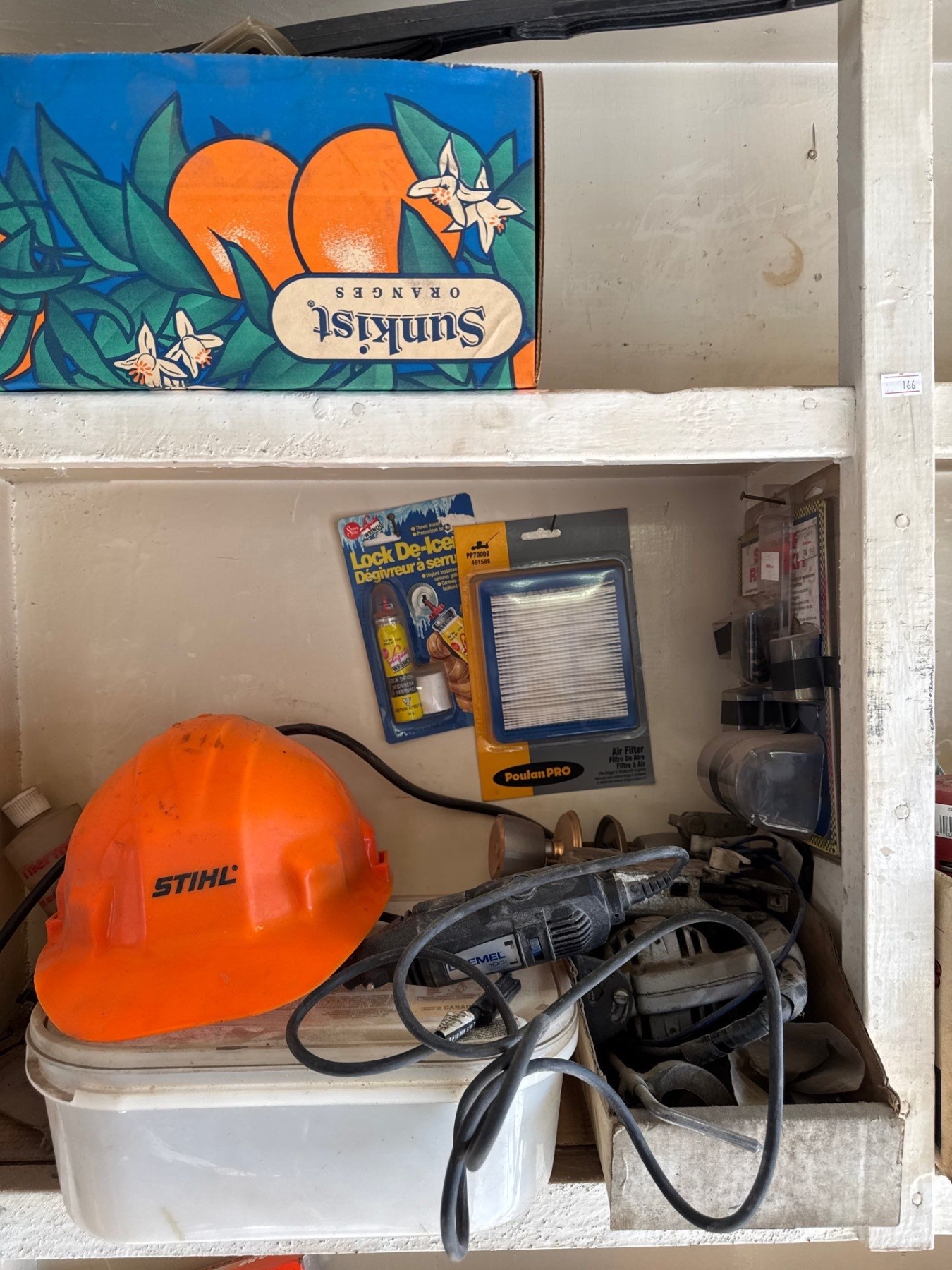 Still hardhat Dremel model 100 miscellaneous Skil saw boxes of paint cans and miscellaneous items all items on upper half of shelf, including box on top and space heater included