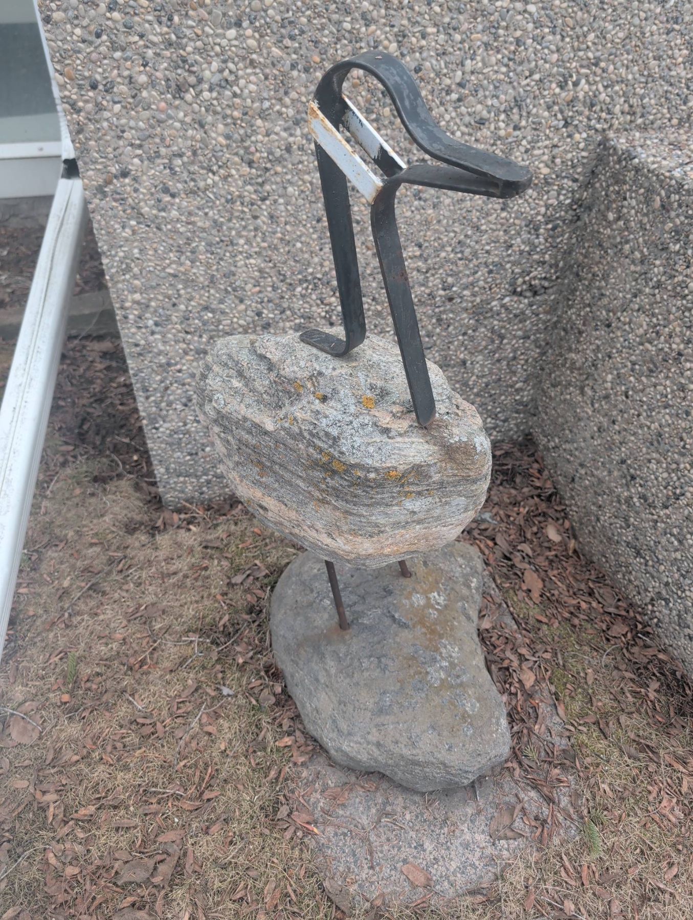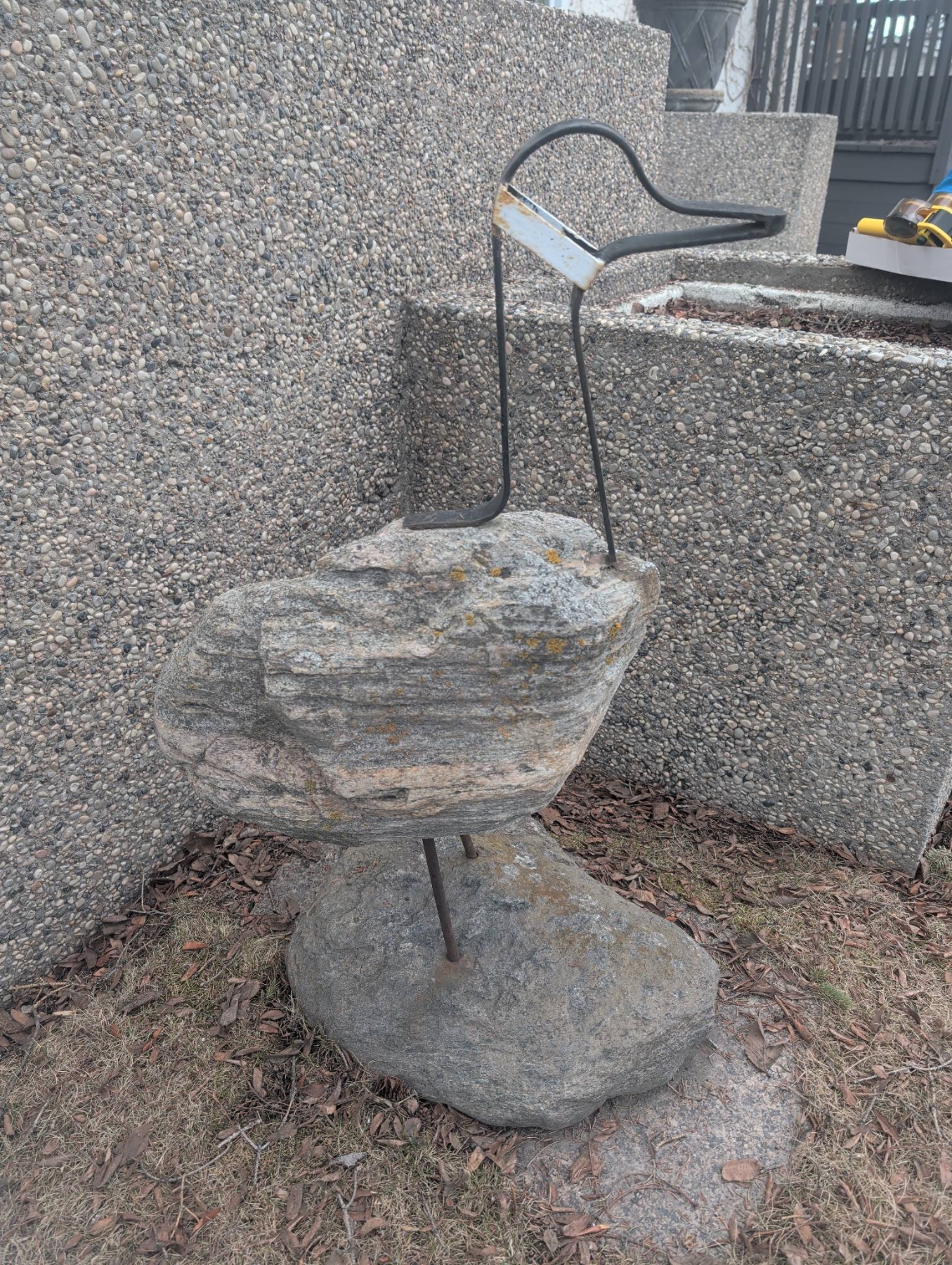 Stone and metal sculpture depicting a bird, with a sturdy stone base for stability. The piece features natural granite stones complemented by a metal framework for the neck and head, giving it a rustic, handcrafted aesthetic. Dimensions and weight are unspecified but appear suitable for indoor or outdoor decorative use.