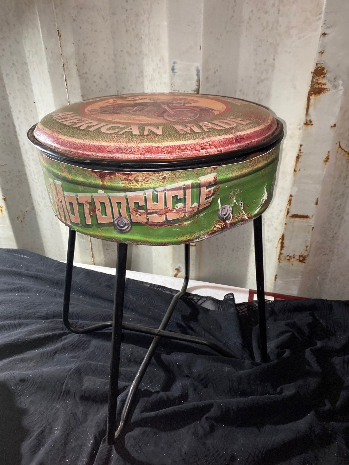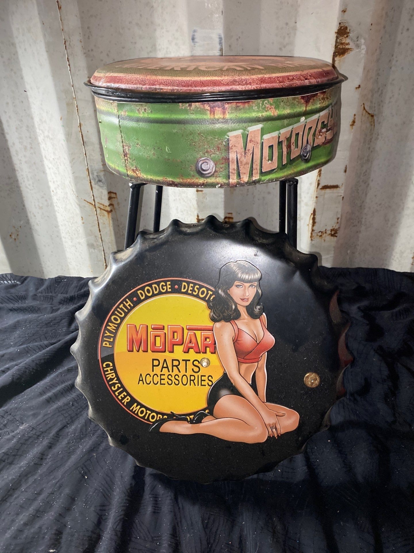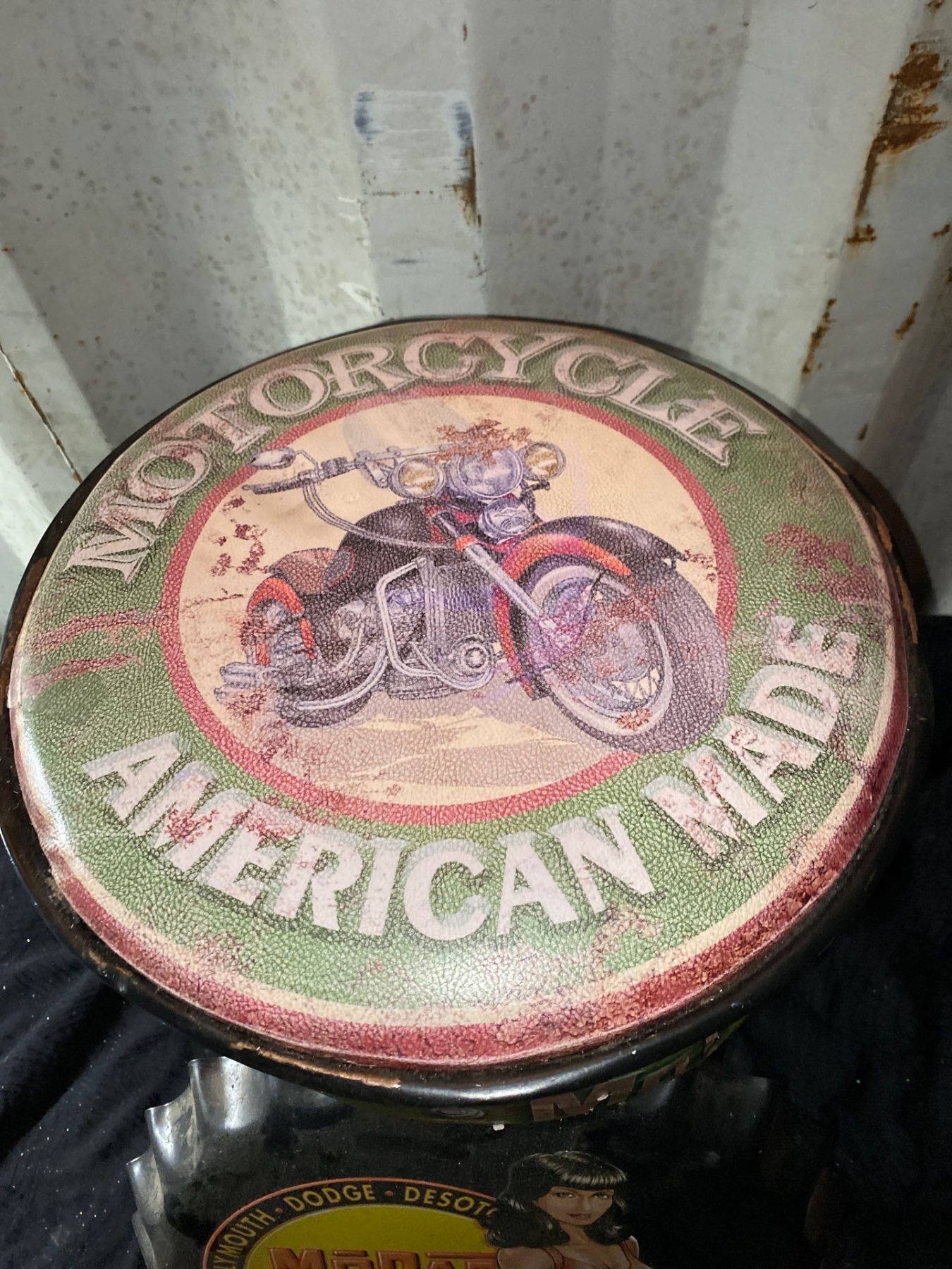 Storage  American Made Motorcycle  Stool and Tin Dodge Sign