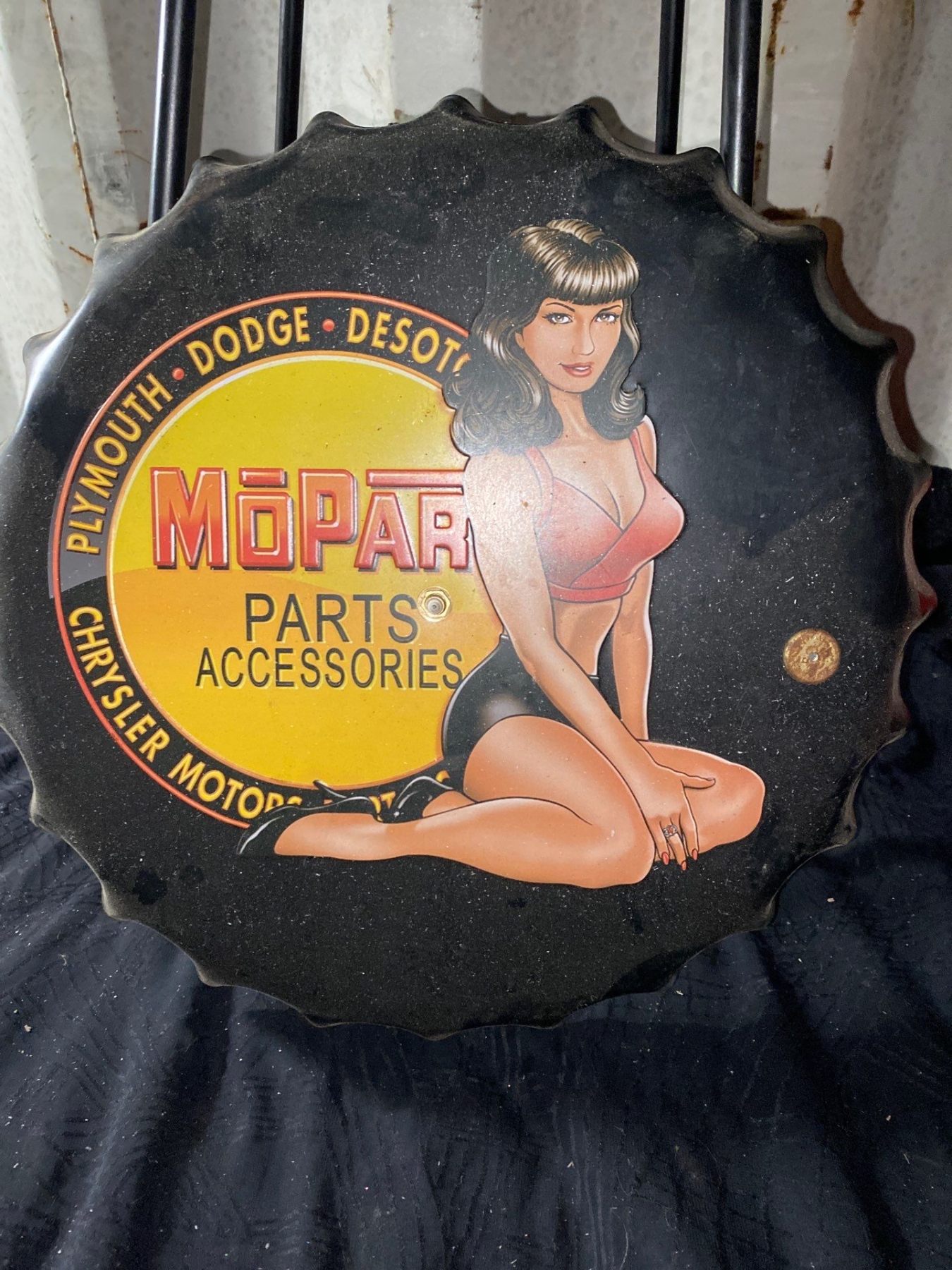 Storage "American Made Motorcycle" Stool and Tin Dodge Sign