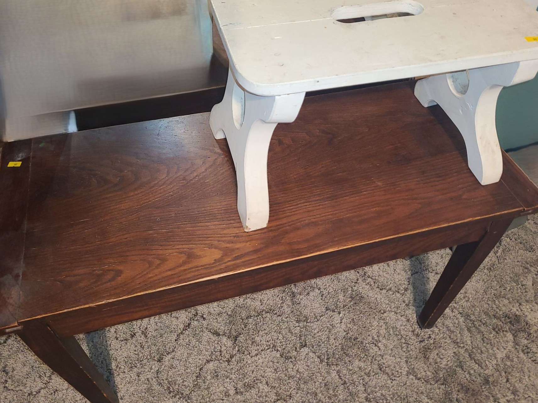 Storage Cabinet 30 W, 16 D, 60 T, Vintage Piano Bench 36 W, 15 D, 21 T, Stool, Mirror 17 X 23