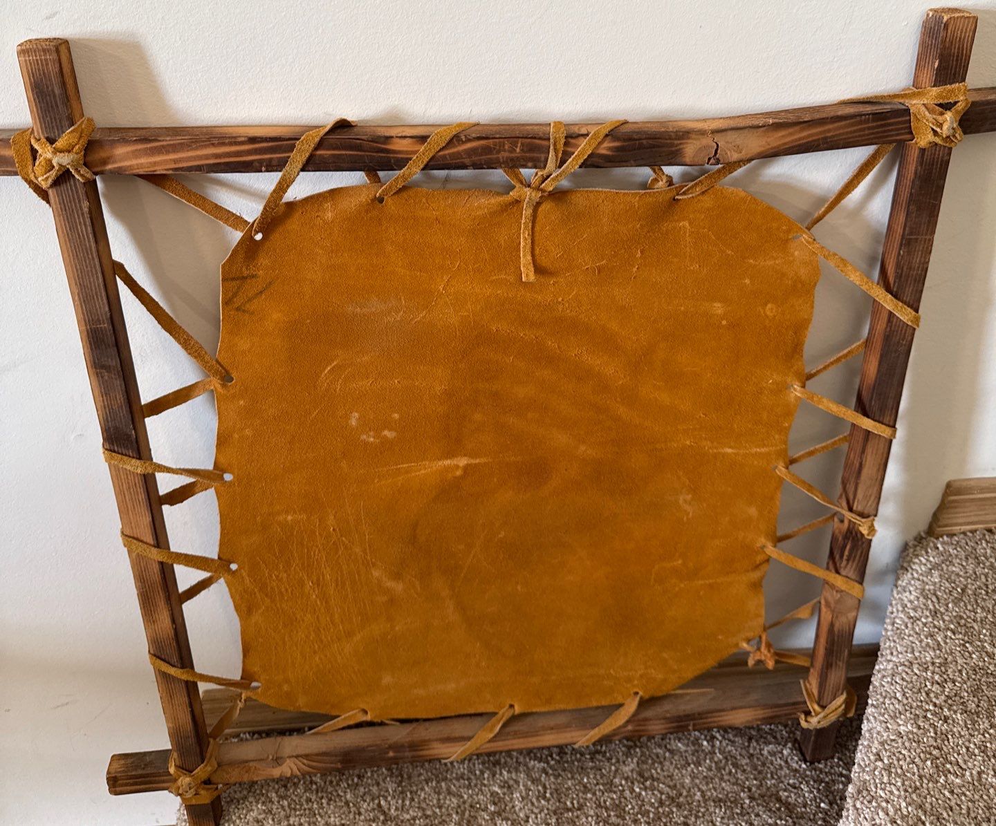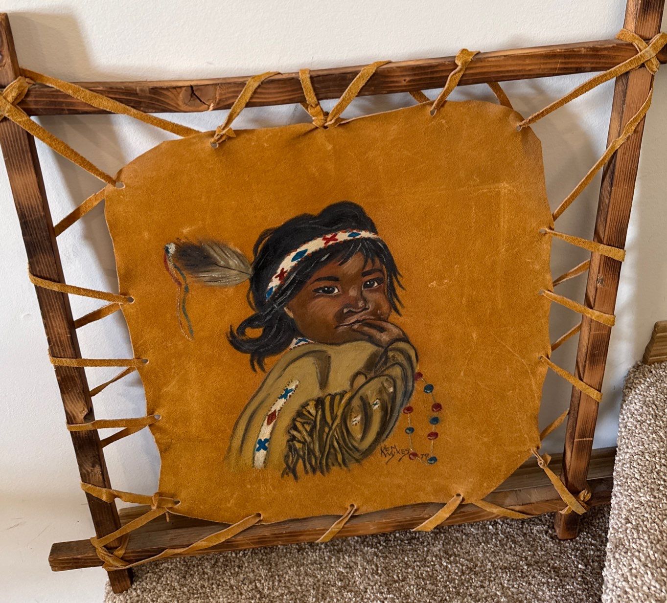 Stretched Leather Indigenous Art Of A Native American Girl Framed w/ Wood & Leather
