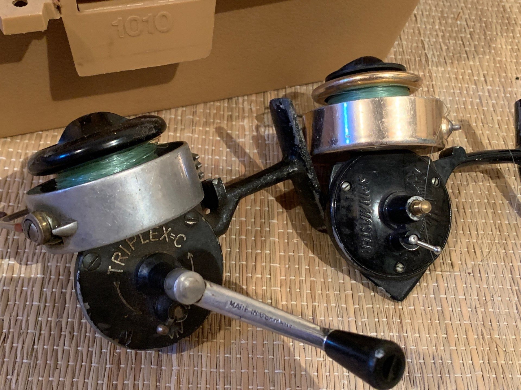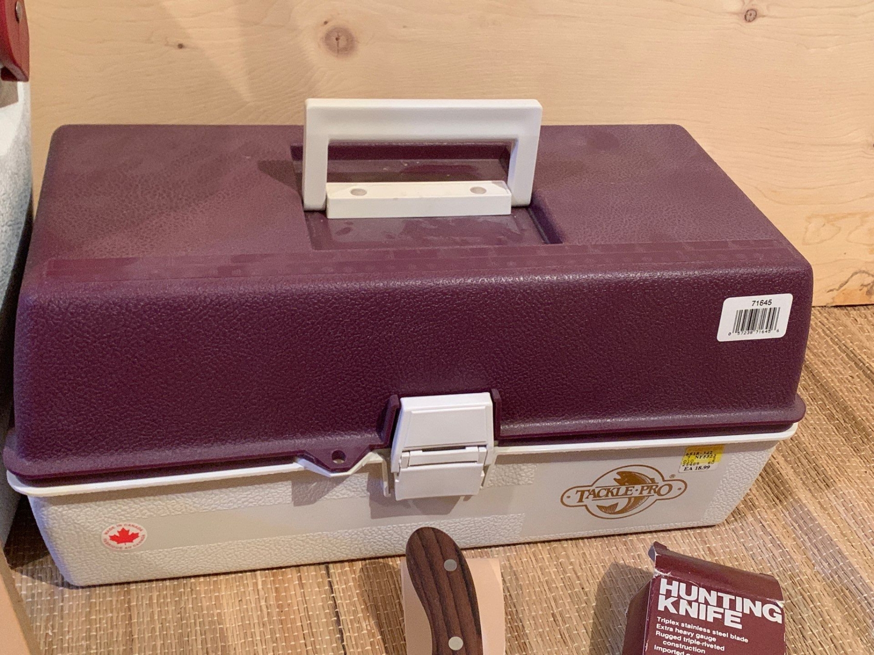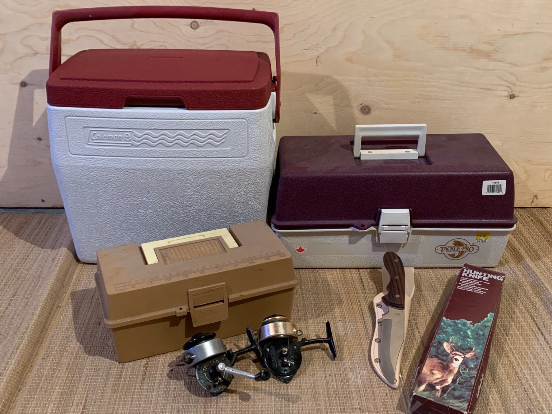 Summer Set, Cooler, Two Tackle Boxes, Vintage Fishing Reels, New in Box Vintage Hunting Knife