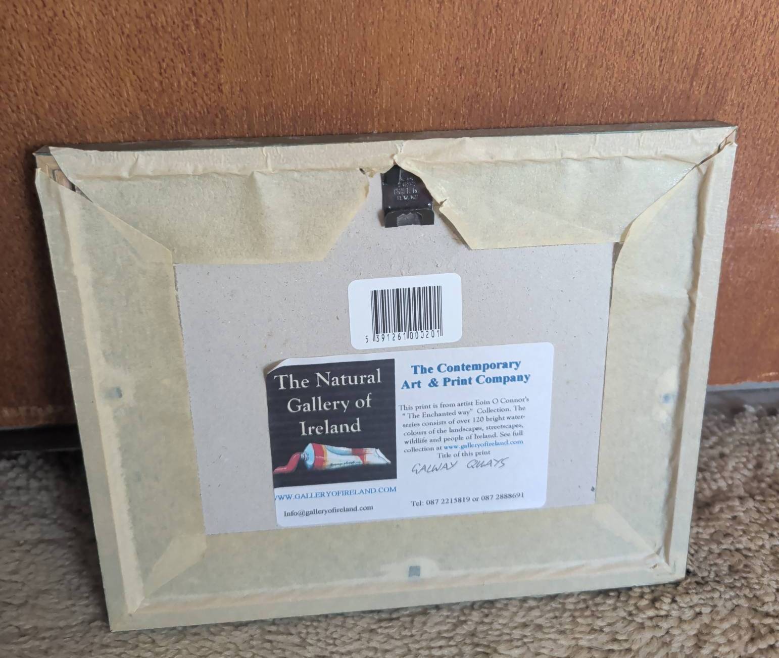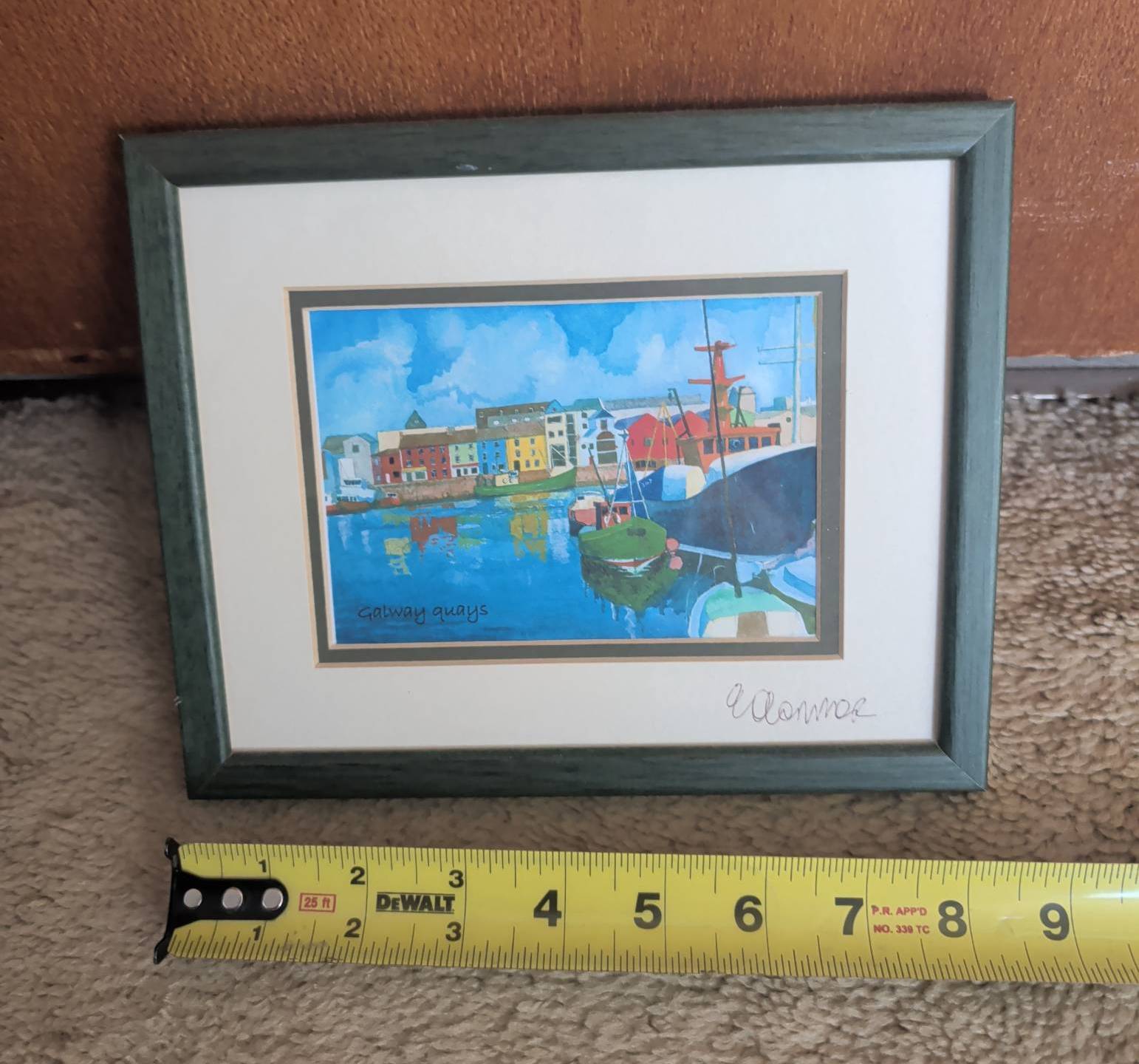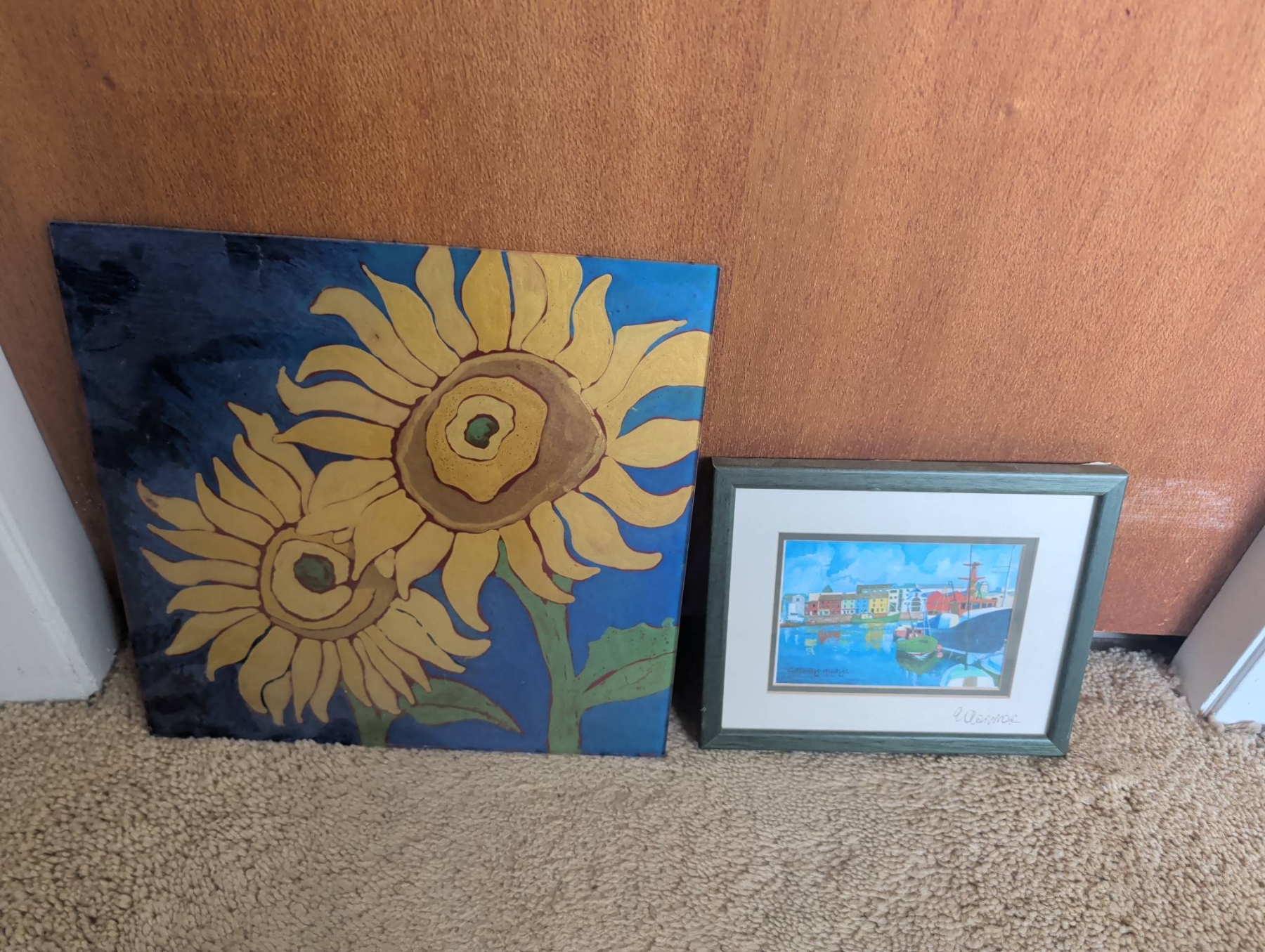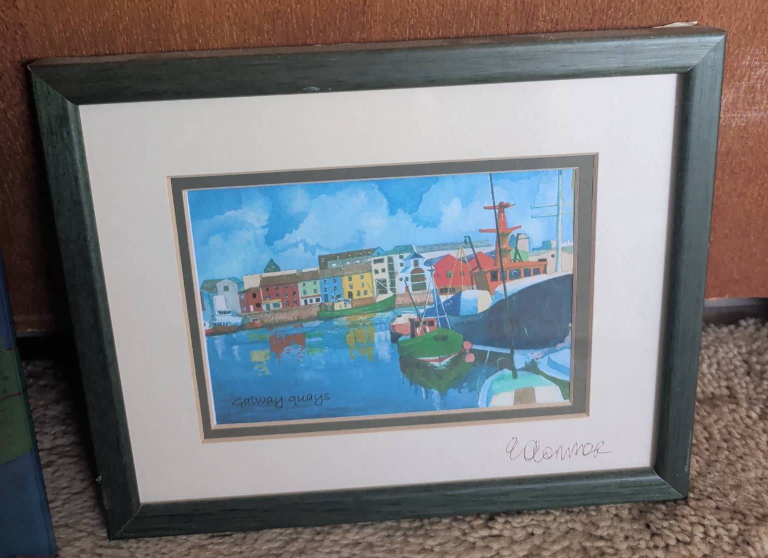 A charming pair of artworks. The first is an approximately 12″ x 12″ painting featuring sunflowers on a bold blue background, signed “Lindey†on the back. The second is a framed print titled “Galway Quays†by the National Gallery of Ireland, measuring approximately 7″ x 9″ (frame included) and signed “O’Connor†on the lower right. Both pieces offer vibrant and timeless themes.