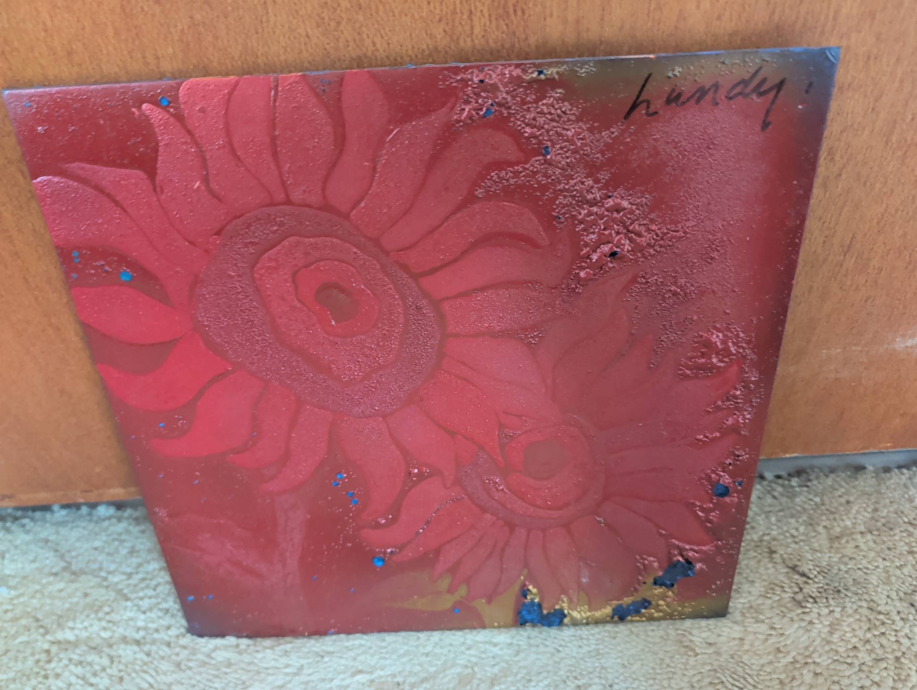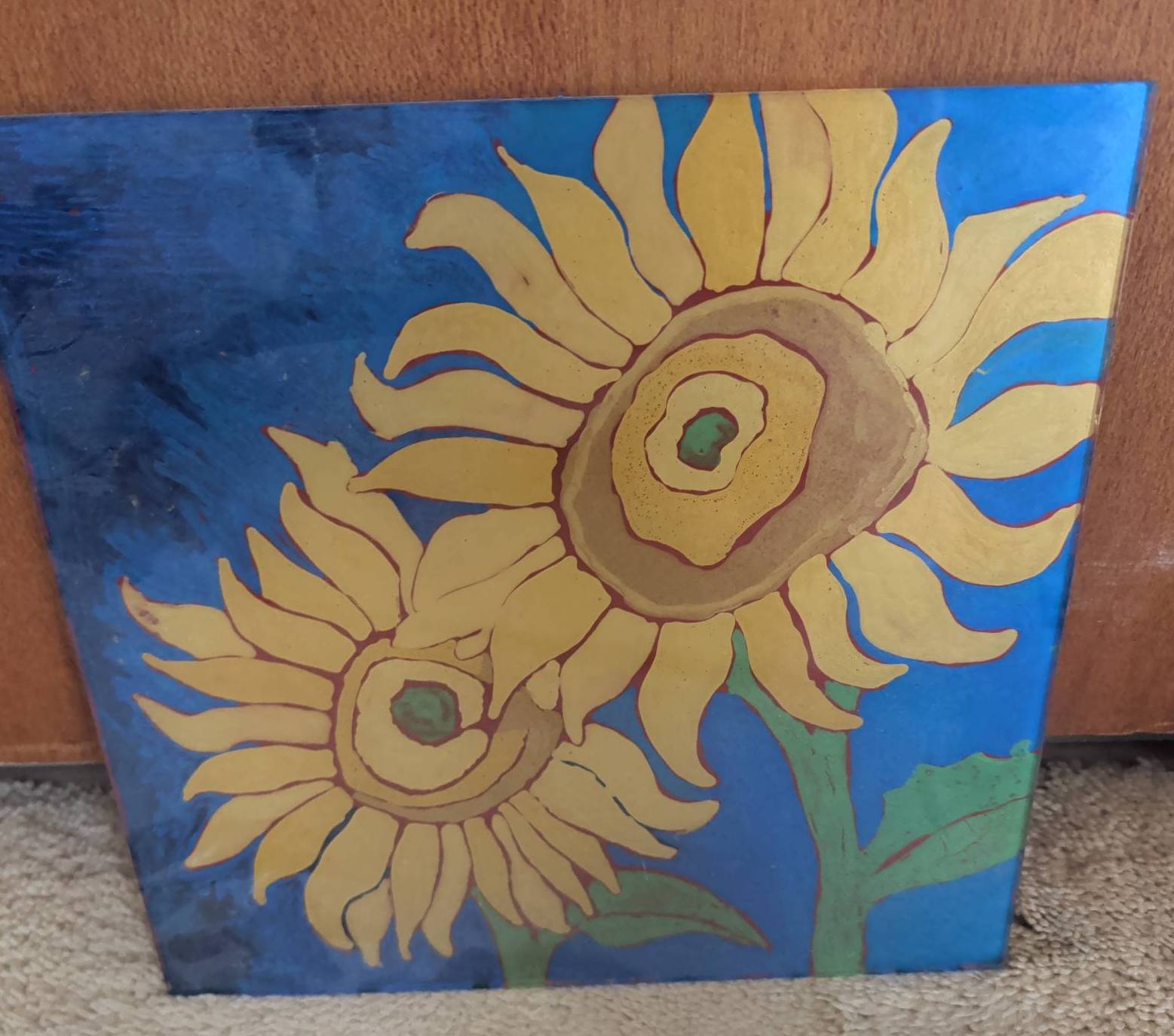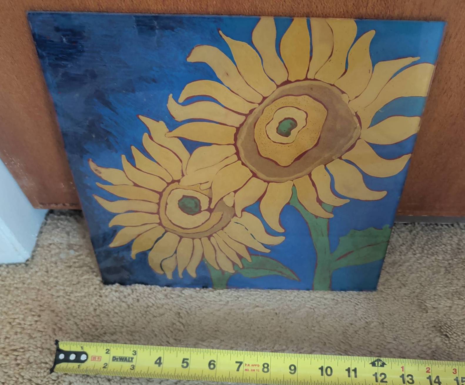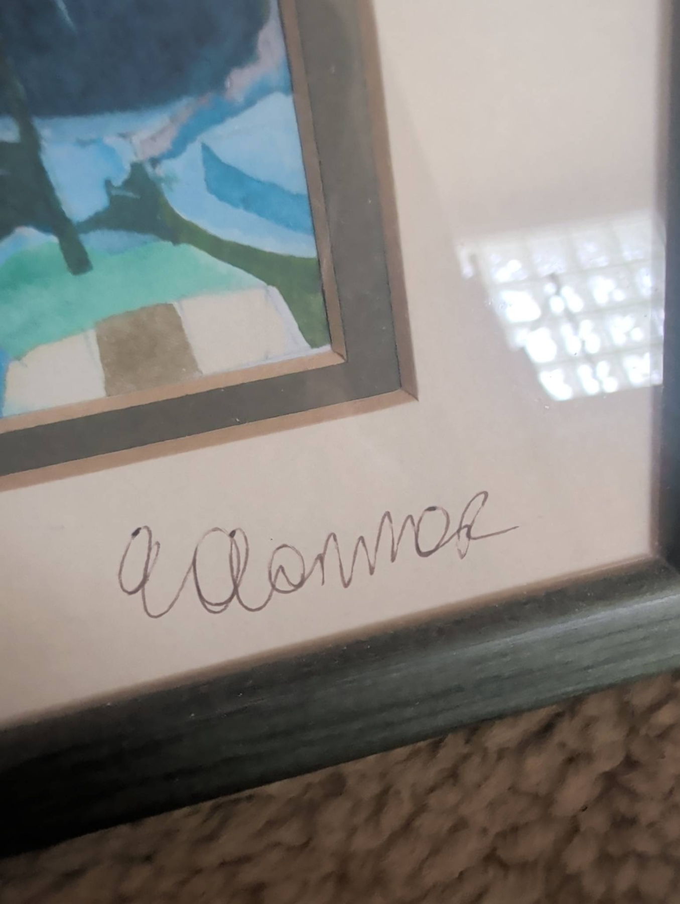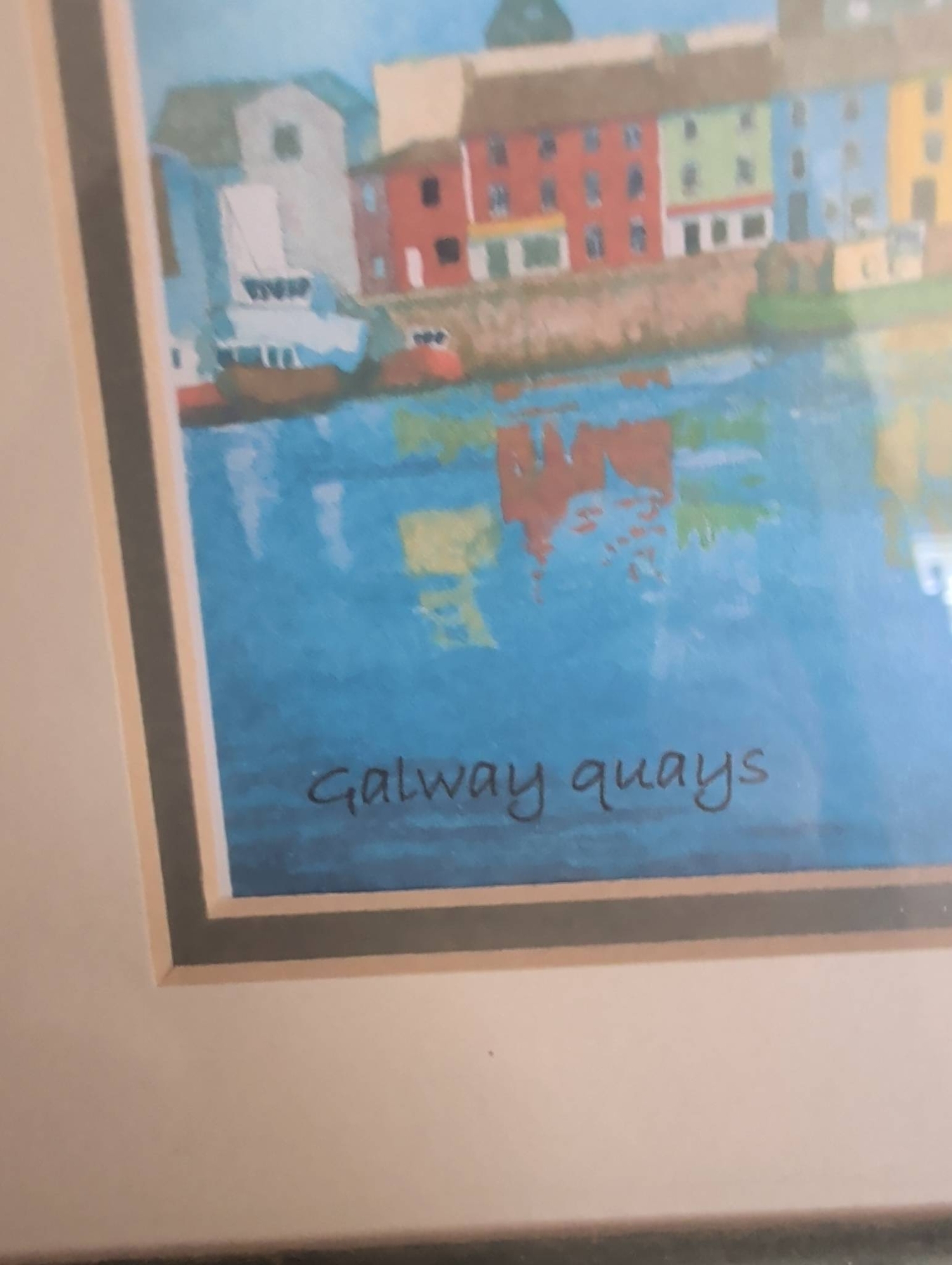 A charming pair of artworks. The first is an approximately 12″ x 12″ painting featuring sunflowers on a bold blue background, signed “Lindey†on the back. The second is a framed print titled “Galway Quays†by the National Gallery of Ireland, measuring approximately 7″ x 9″ (frame included) and signed “O’Connor†on the lower right. Both pieces offer vibrant and timeless themes.