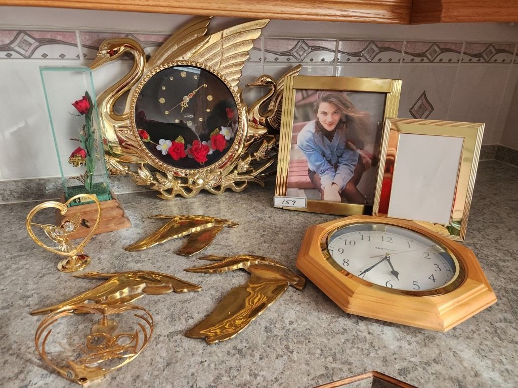 Swan Clock, Wood Clock, Photo Frames, 3 Brass Geese , Chesterseal Lifesake Flowers Real Rose Music Box
