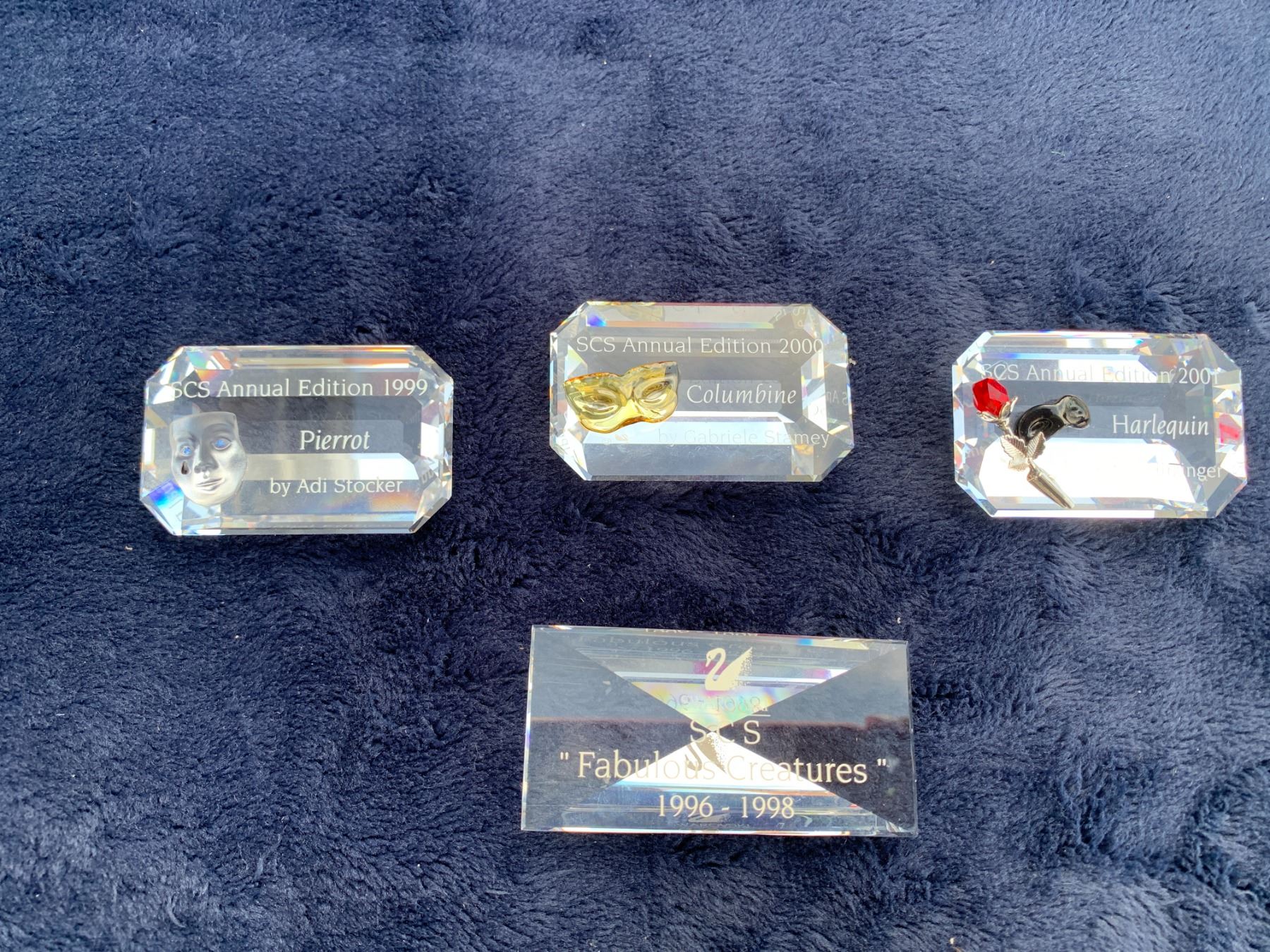 Swarovski Yellow, Green & Red Daisies, SCS 1999 Pierrot, 2000 Columbine & Harlequin Crystal Plaques &1996-1998 Fabulous Creatures Plaque & Apple Photo Locket