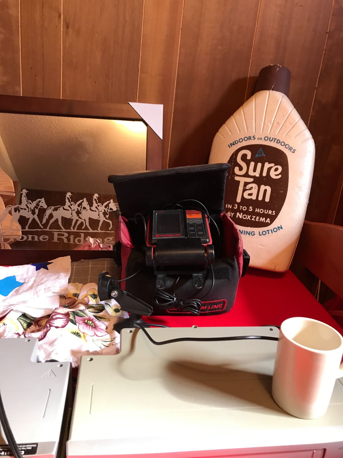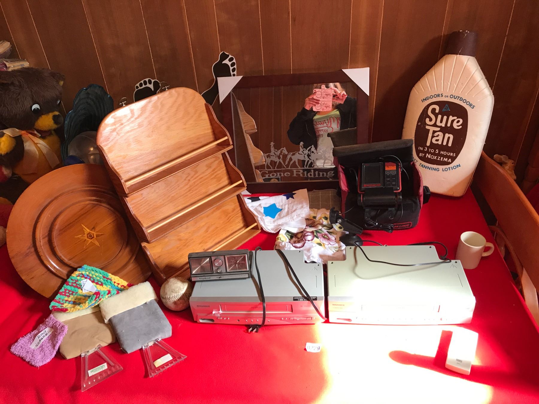 Sylvania & Magnavox VHS Recorders, Vagabond Travel-Mate Clock, Gone Riding Mirror, Wood Plate, Spice Rack, Huge Sure Tan Bottle & Bottom Line Computer Sonar