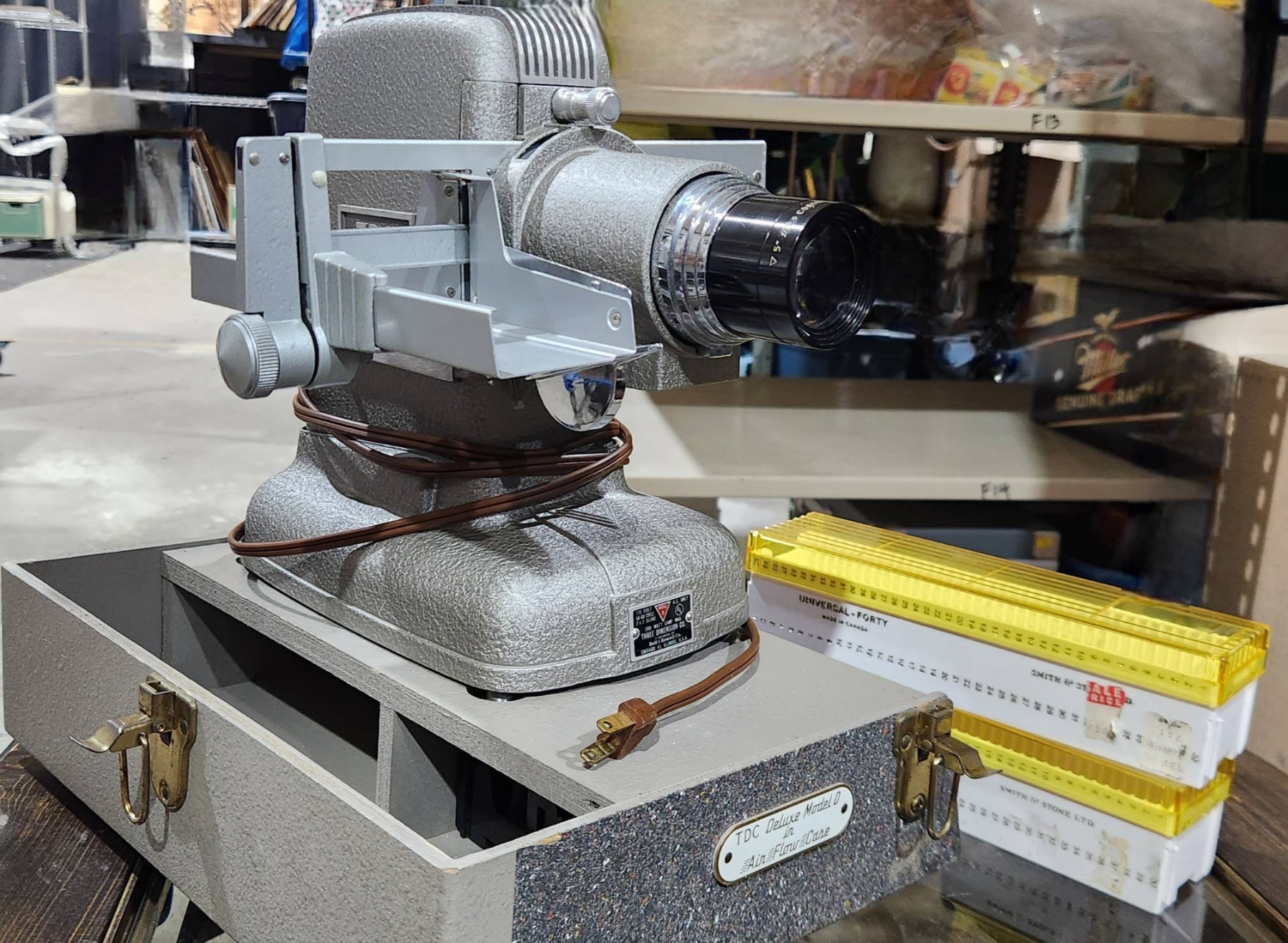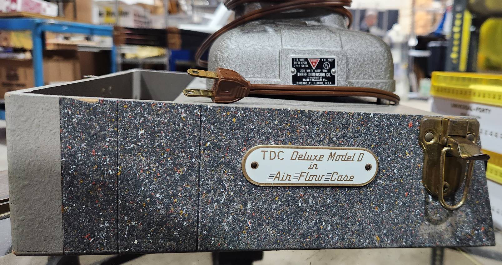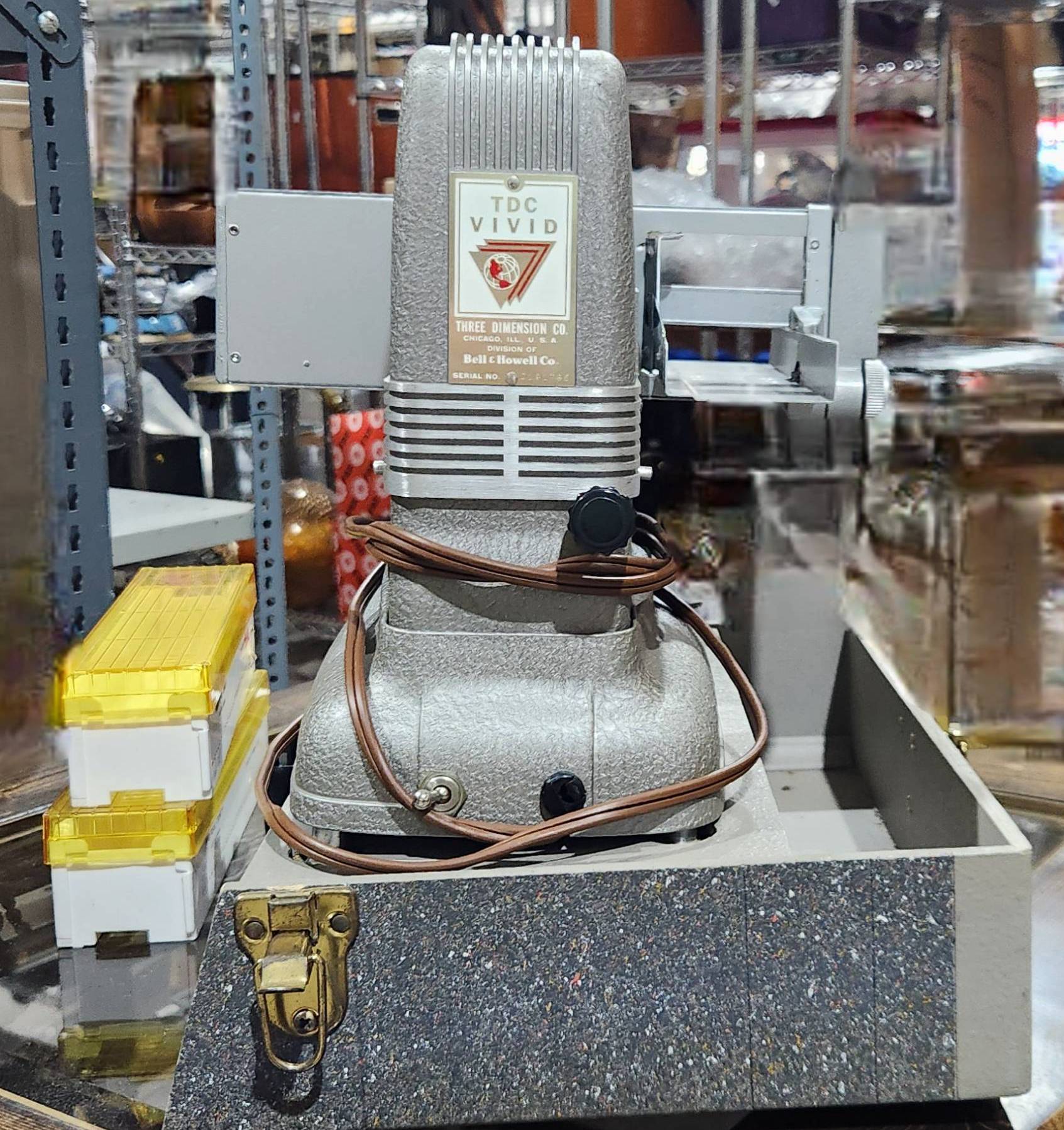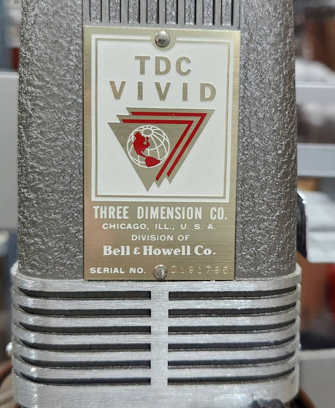 TDC Vivid Slide Projector Model II by Three Dimension Co., a division of Bell & Howell. Includes a built-in carrying case and tested projection functionality. | | | Comes with a portable projection screen. | | | Unit shows a metallic finish and vintage design with secure latches and storage compartments for accessories. | | | Dimensions: Projector case approximately 12" H x 10" W x 10" D; projection screen approximately 40†wide (when unfolded). Tested and working.