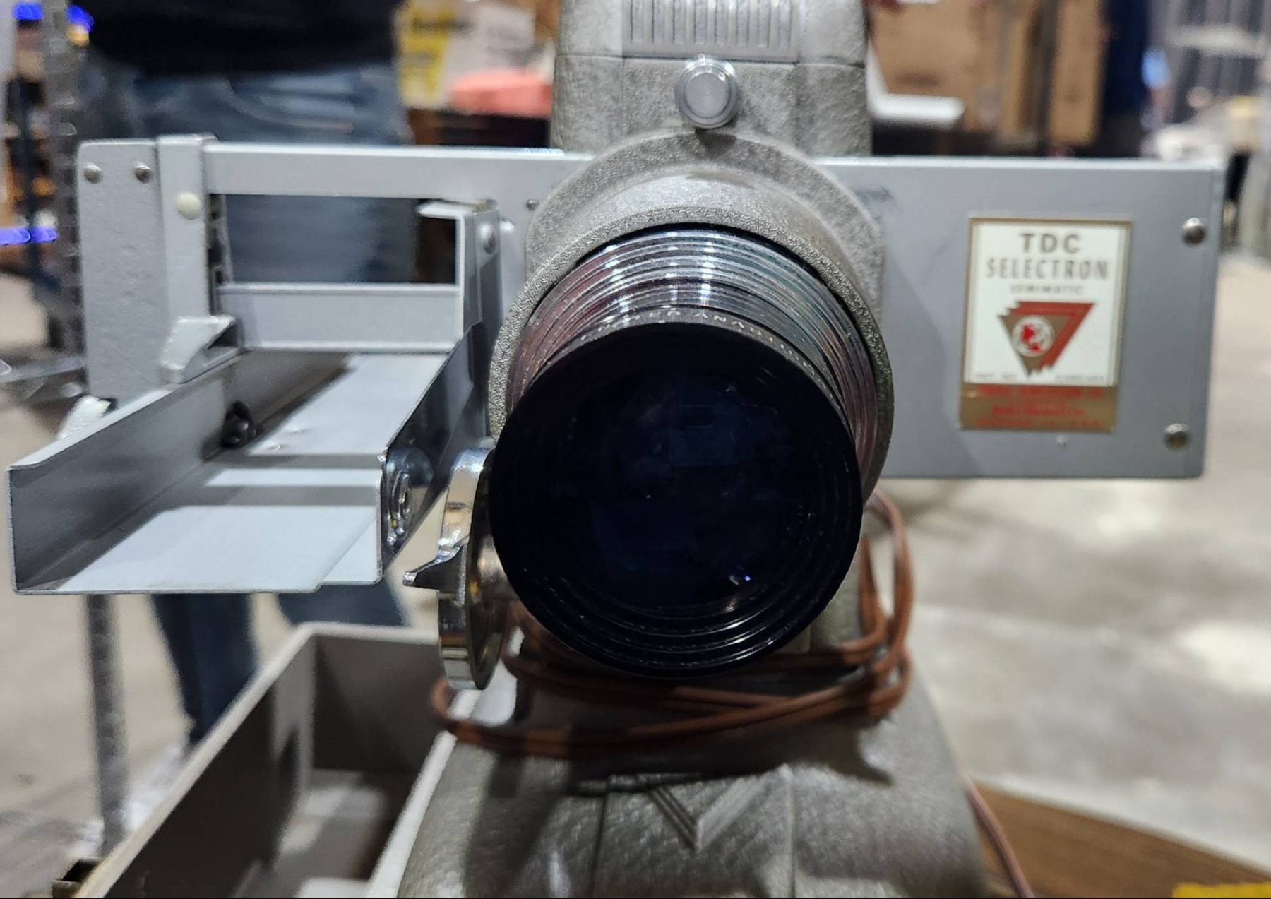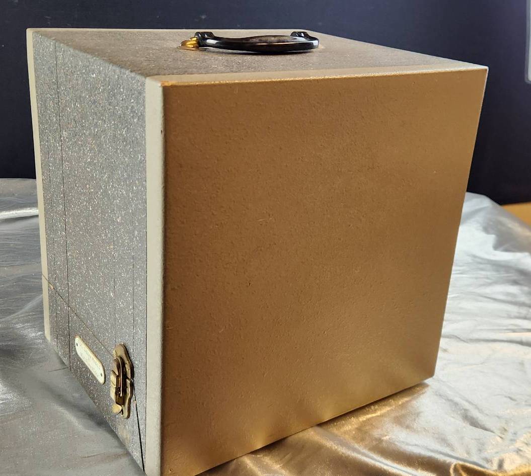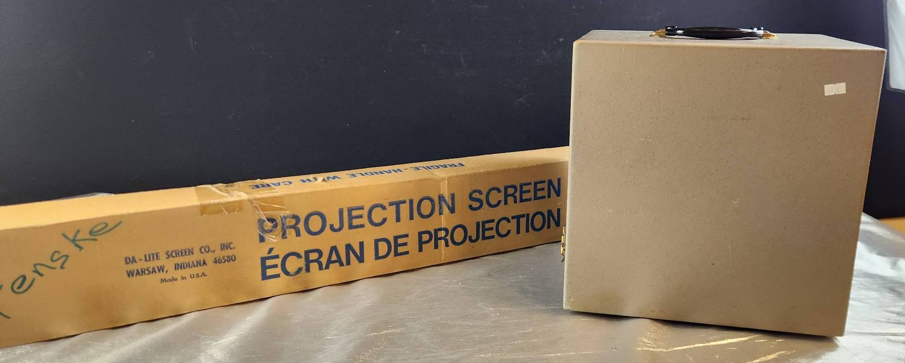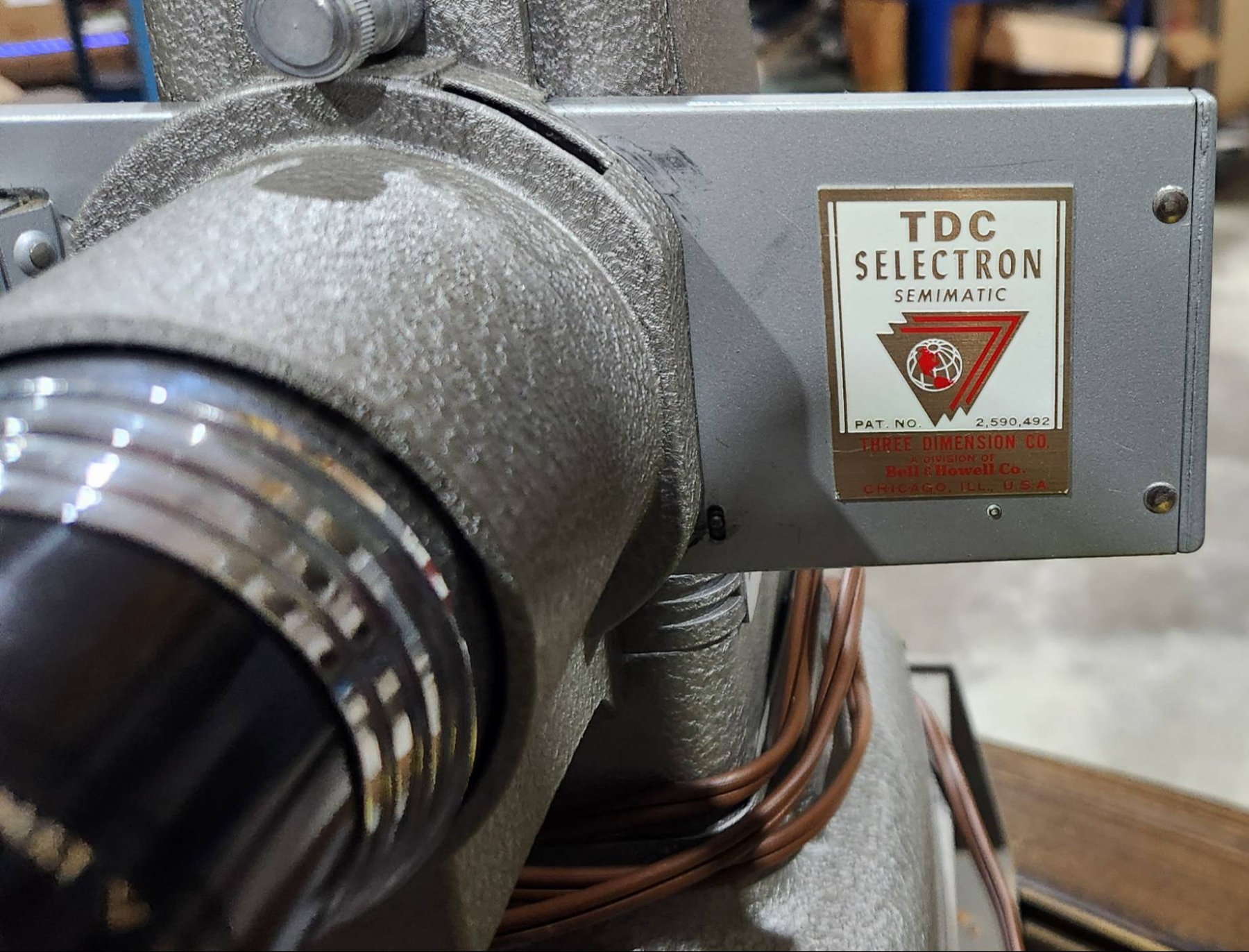TDC Vivid Slide Projector Model II by Three Dimension Co., a division of Bell & Howell. Includes a built-in carrying case and tested projection functionality. | | | Comes with a portable projection screen. | | | Unit shows a metallic finish and vintage design with secure latches and storage compartments for accessories. | | | Dimensions: Projector case approximately 12" H x 10" W x 10" D; projection screen approximately 40†wide (when unfolded). Tested and working.