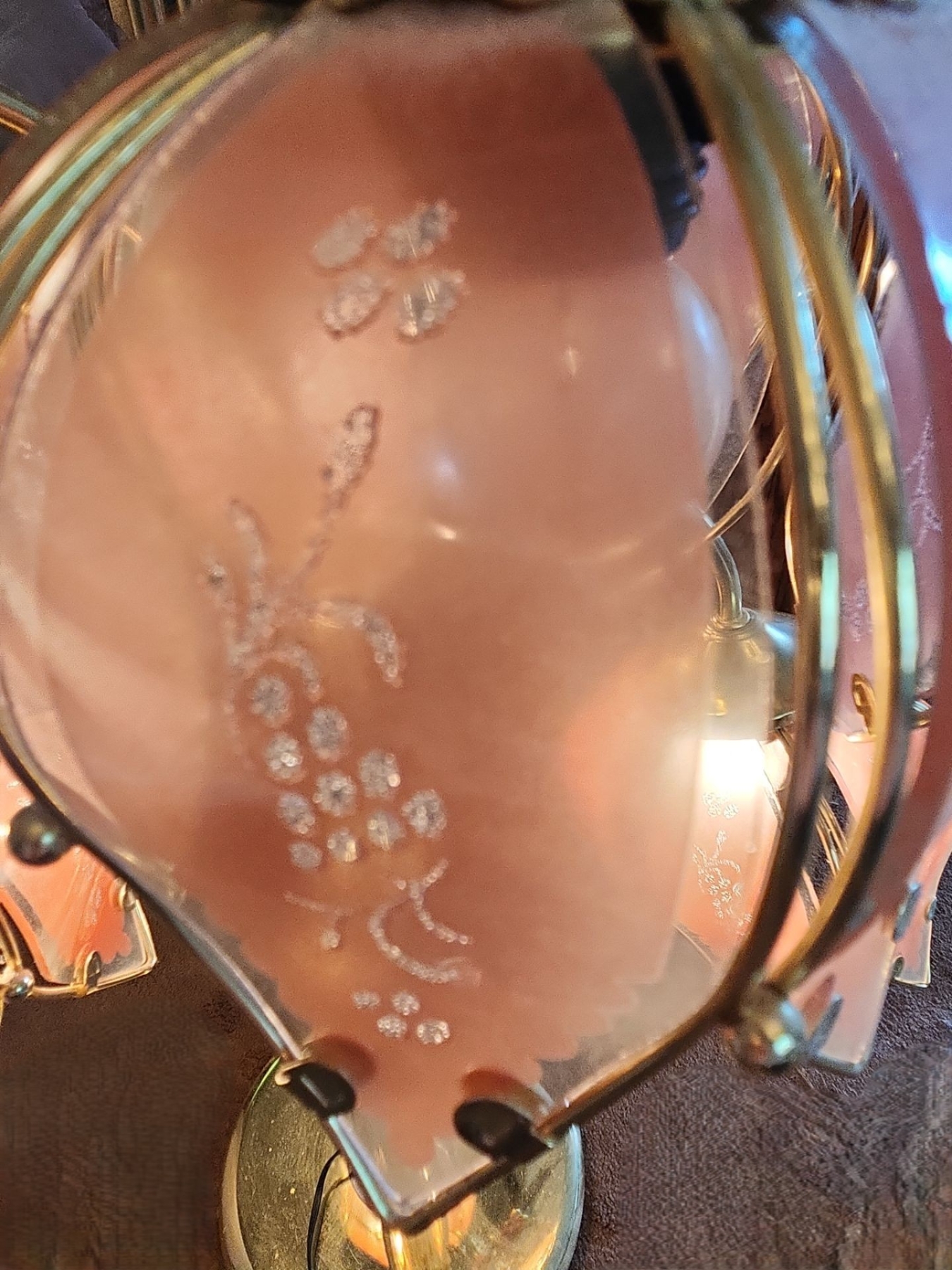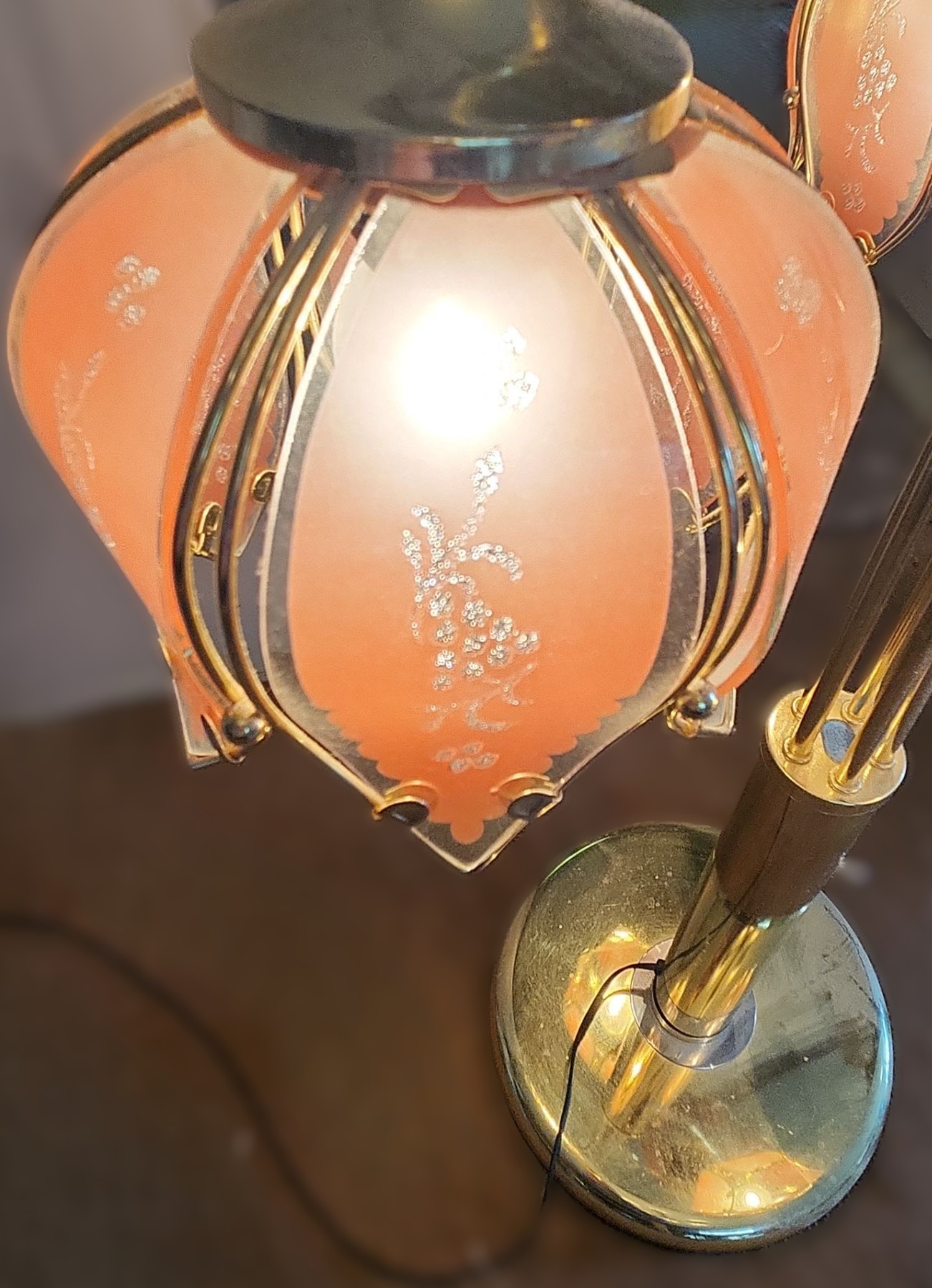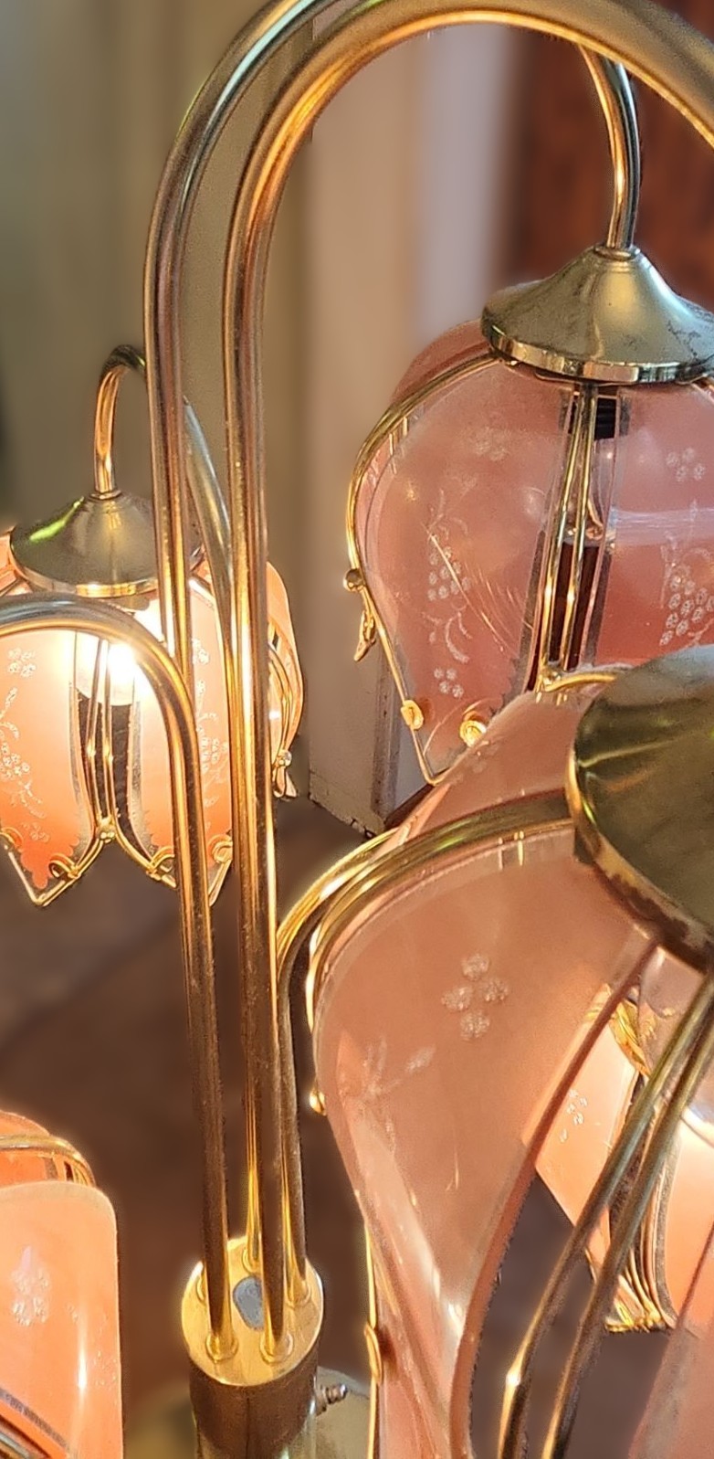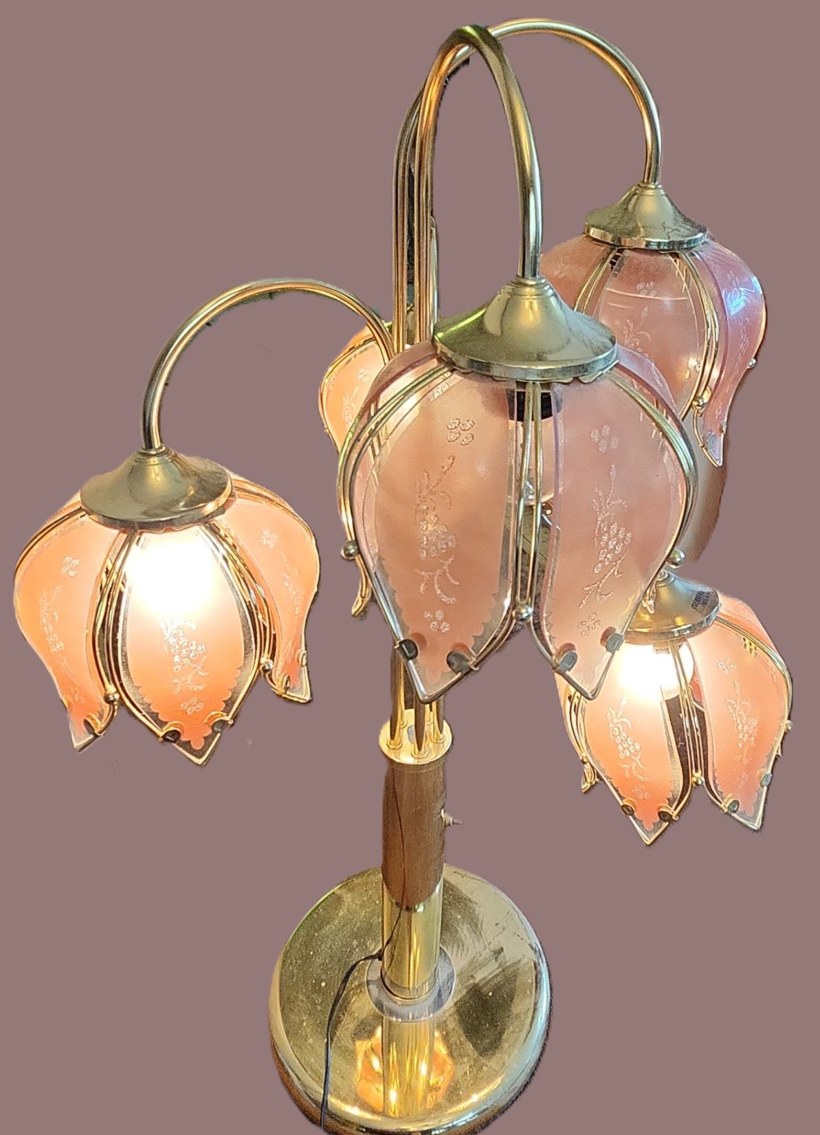 Table Lamp w/ 5 Pink Glass Flower Bud Heads and Brass Base 12  Diameter, 37 T