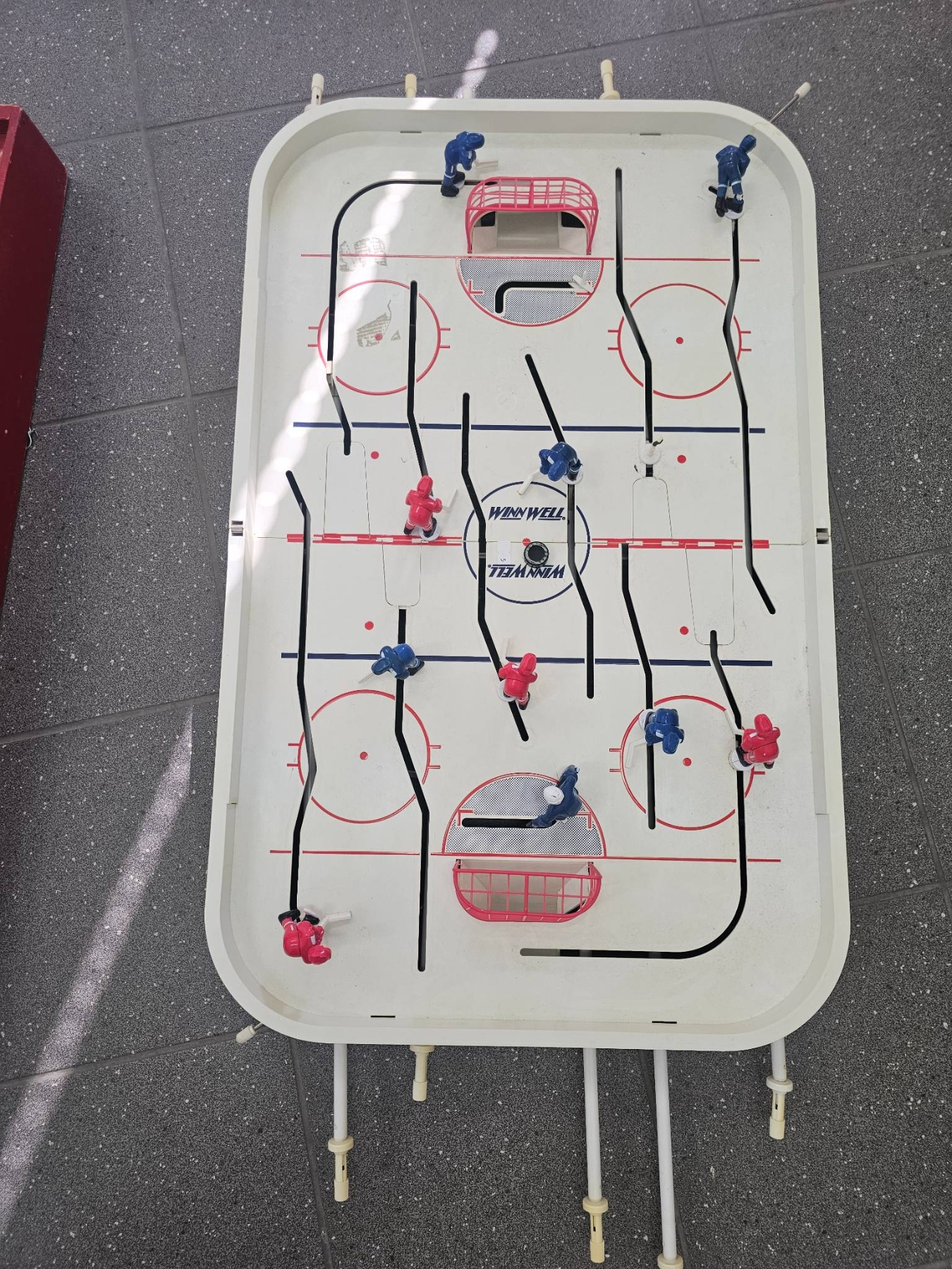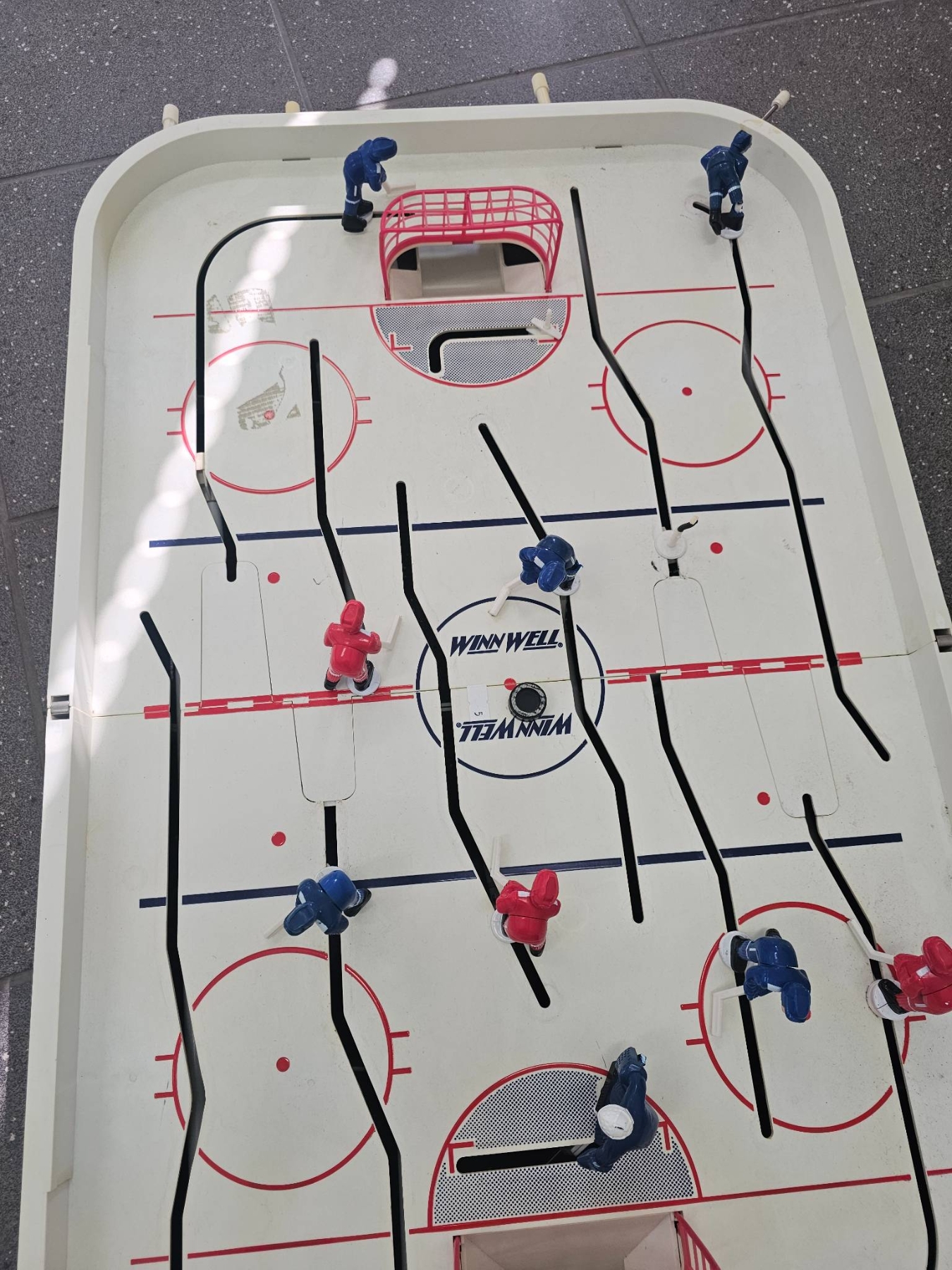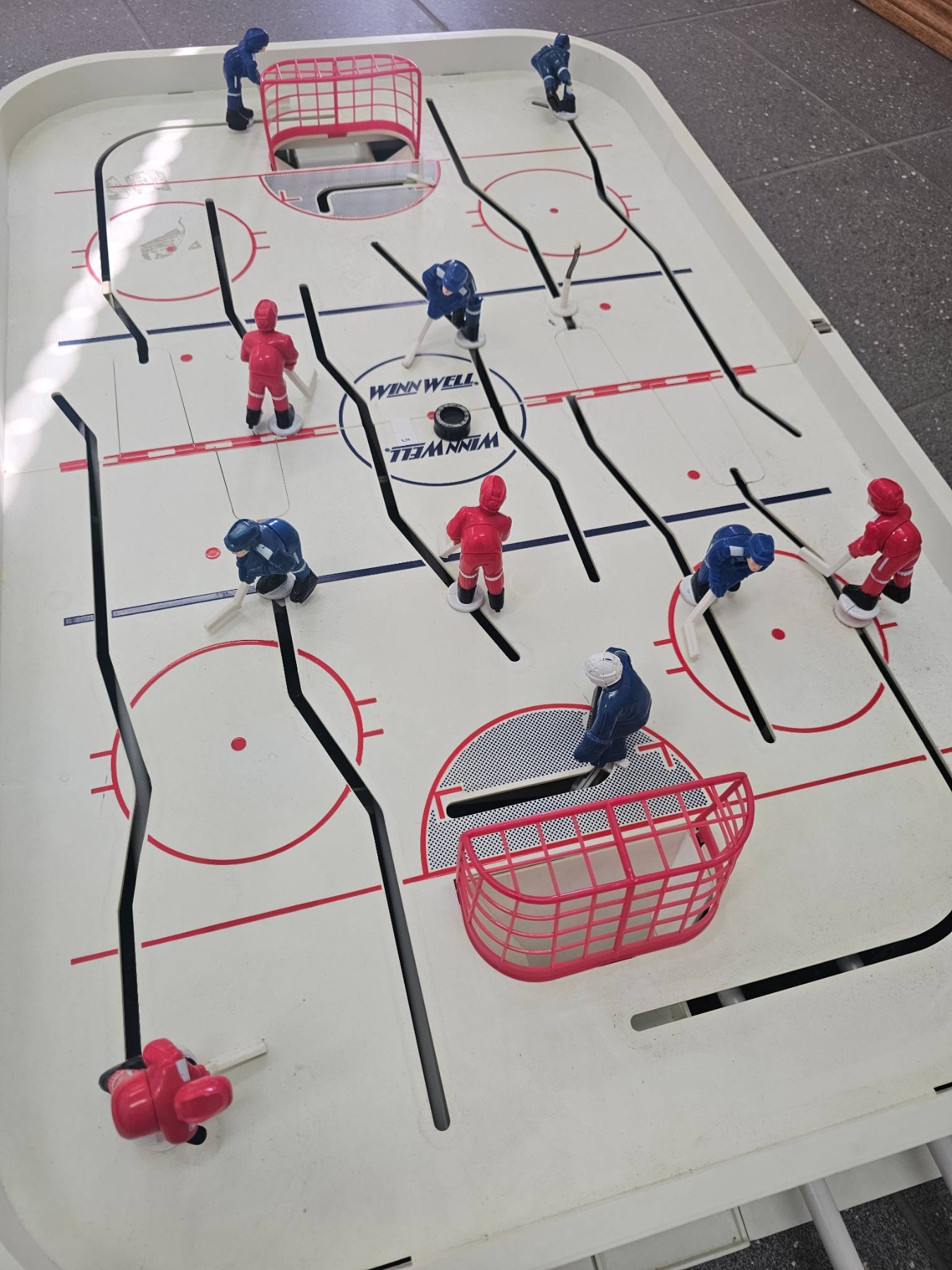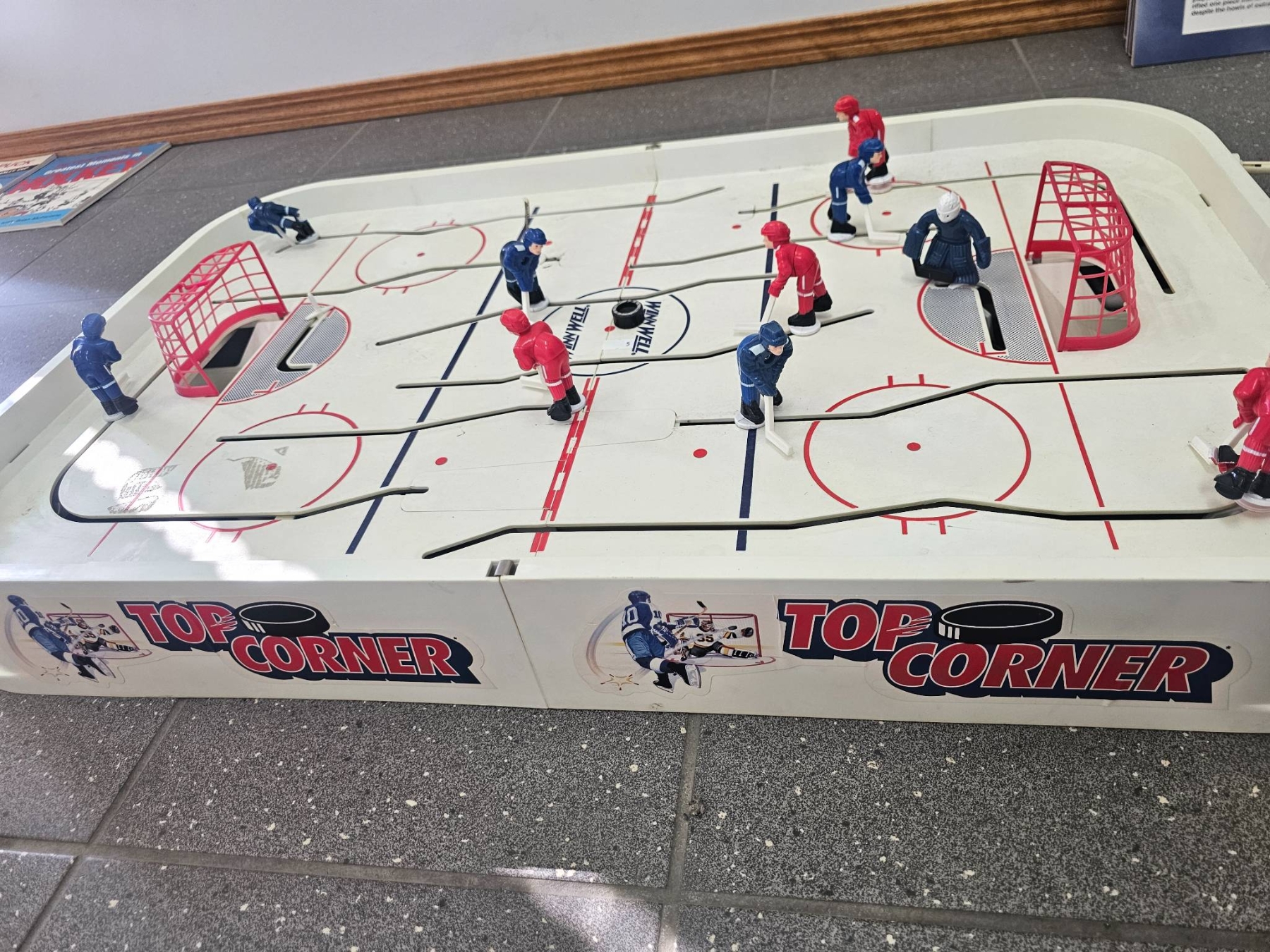 A tabletop hockey game featuring two teams (red and blue) with movable player figures on rods, designed for interactive gameplay. Includes two nets with a plastic rink surface marked with rink details and team zones. Sideboards are labeled 'Top Corner.' Shows signs of use with minor wear on the rink and components, but appears functional. Great for recreational use.