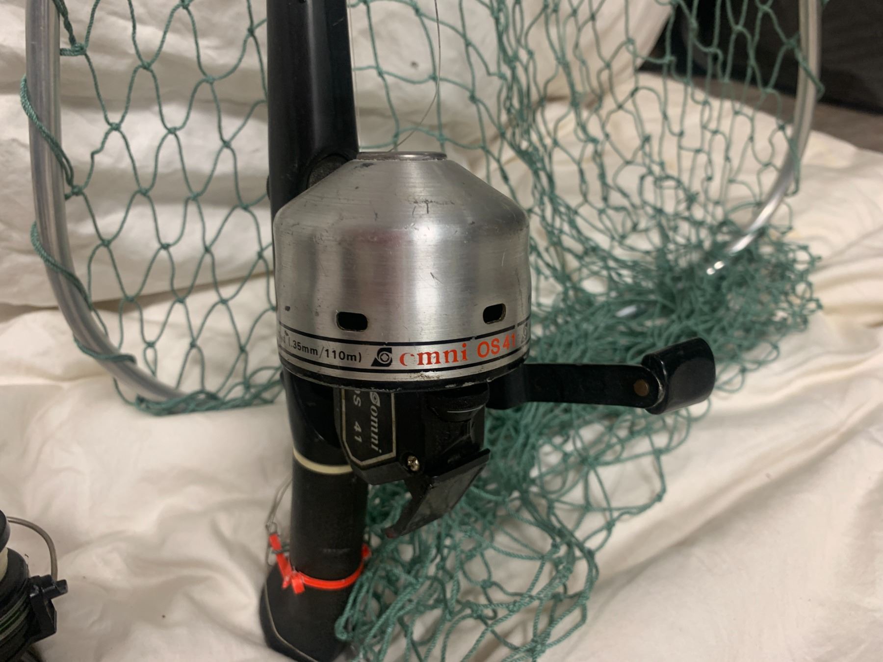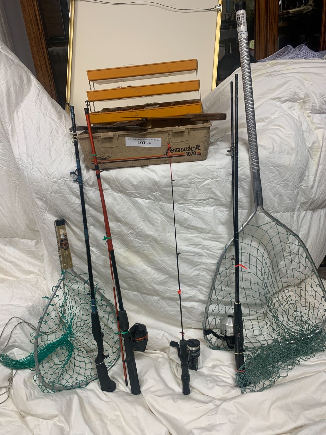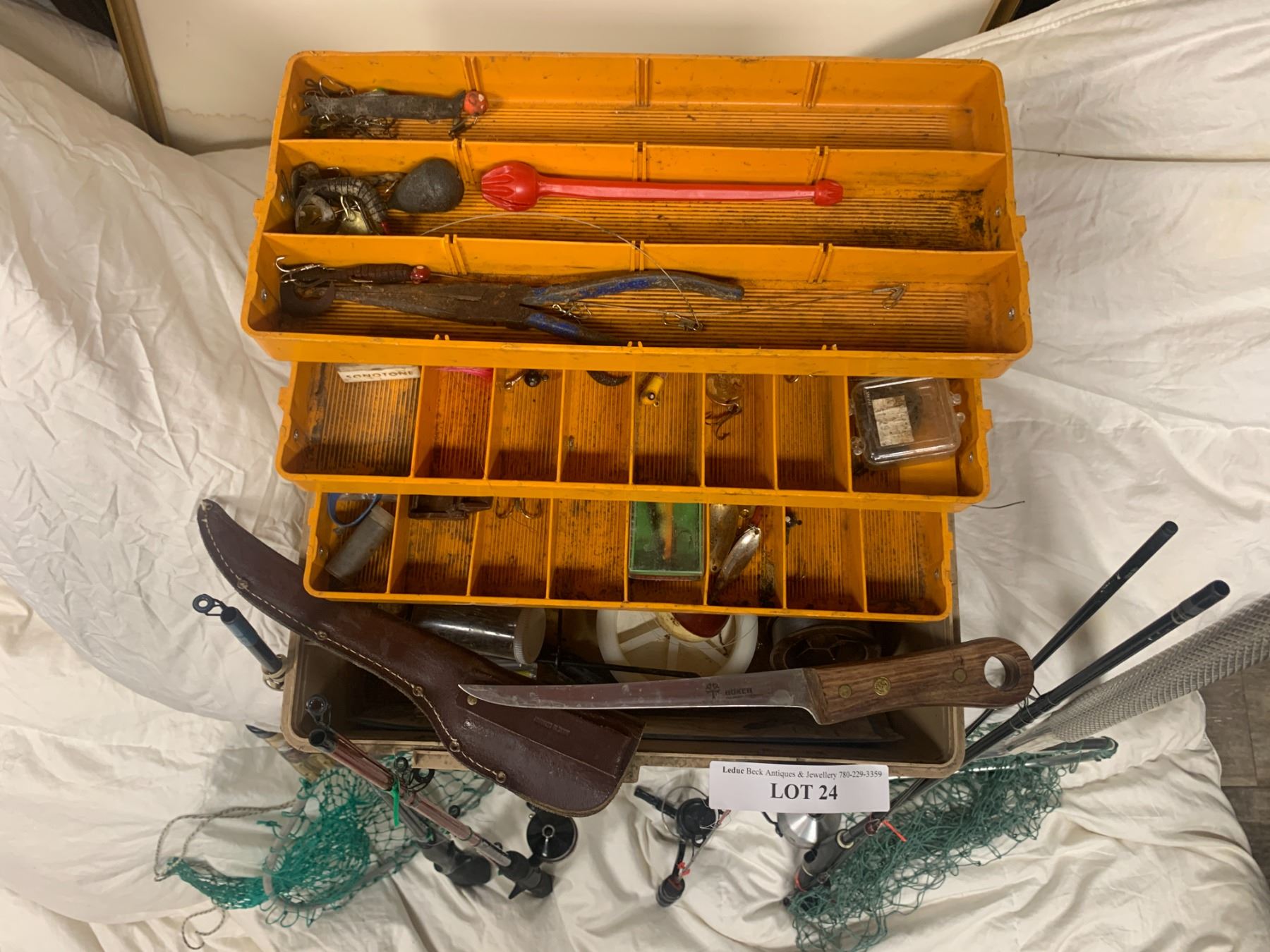 Tackle Box w Fishing Gear, Lead Weights, Crimps, Pliers, Fish Bopper, Vintage Filet Knife, Various Fishing Rods and Hand Nets