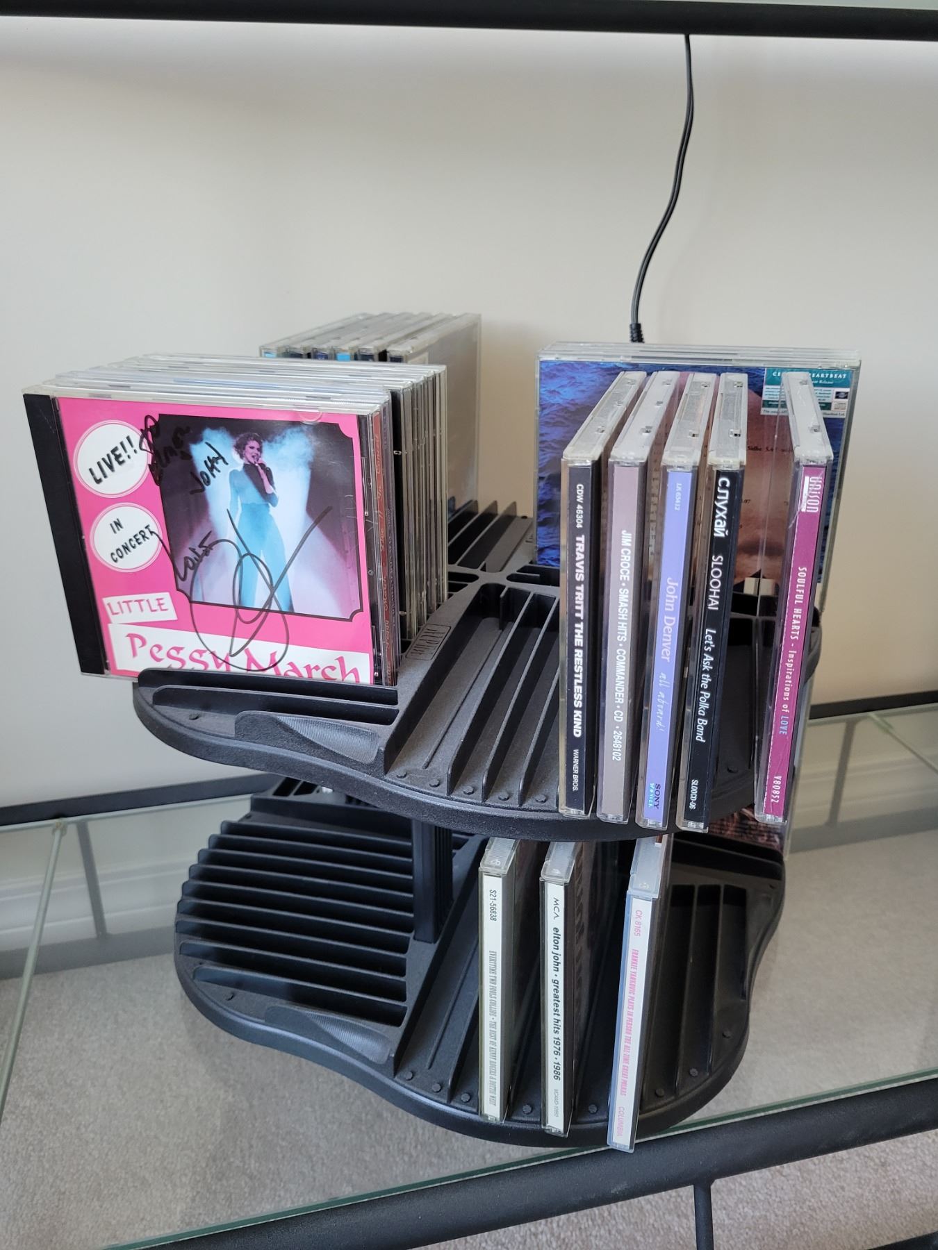Tall Black Shelf with CD's & Sharp Stereo with Speakers