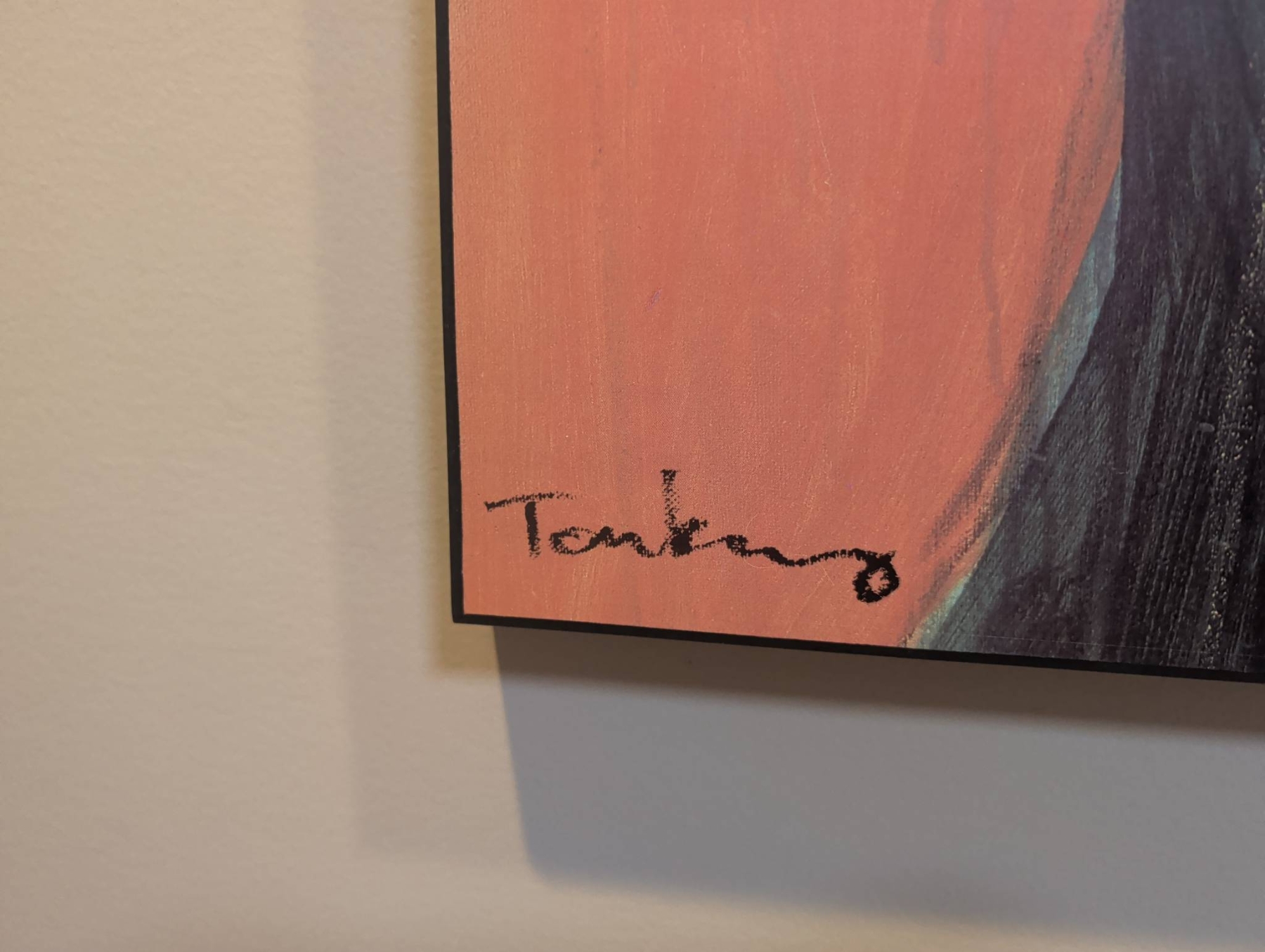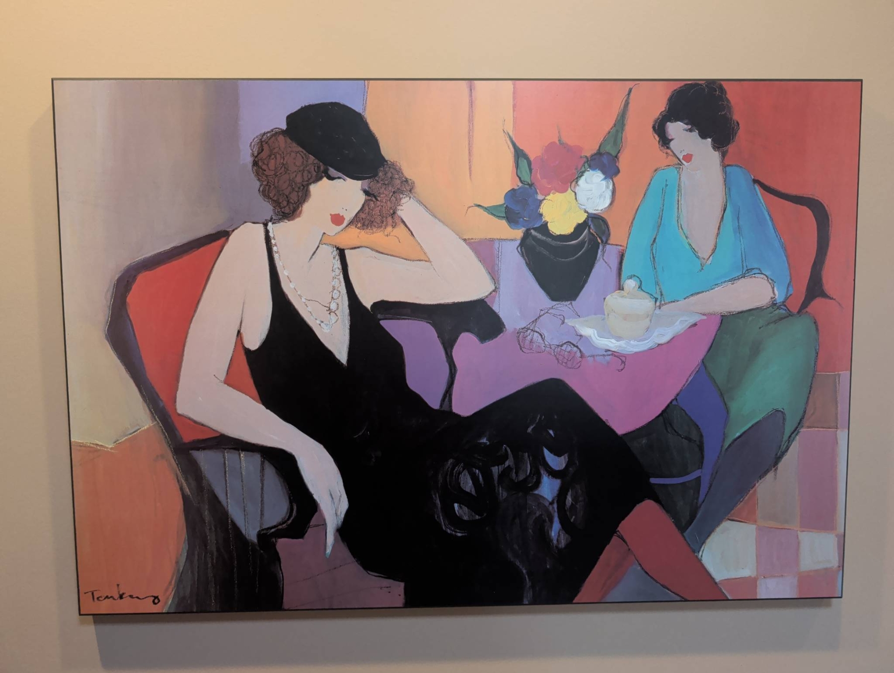 Vibrant painting signed by artist Tarkay, showcasing two elegantly dressed women seated with a floral centerpiece. The artwork features a bold color palette and fine detail capturing a moment of refined leisure. Presented in an elegant black frame, ready for display. A great addition for collectors or admirers of expressive modern compositions.