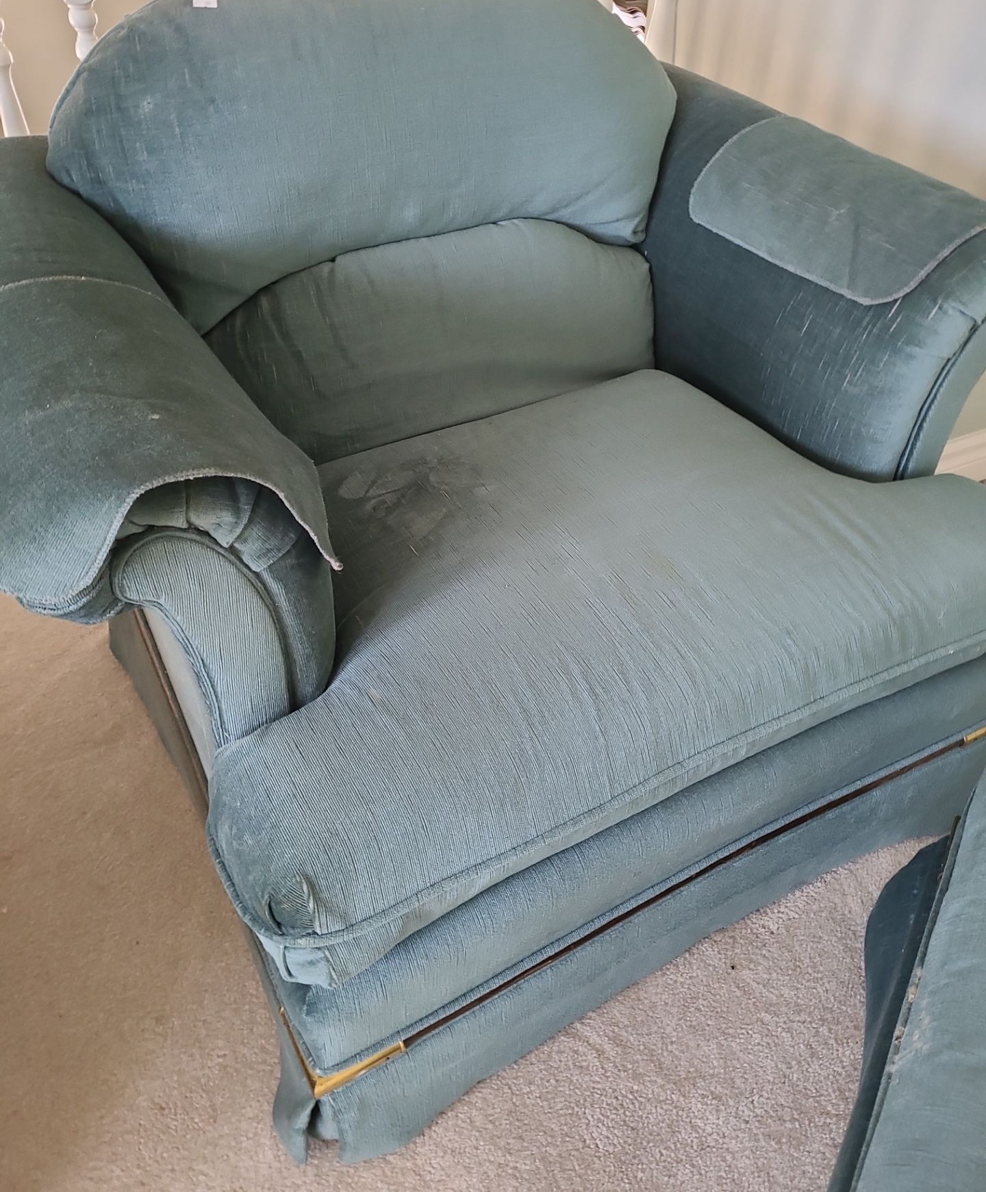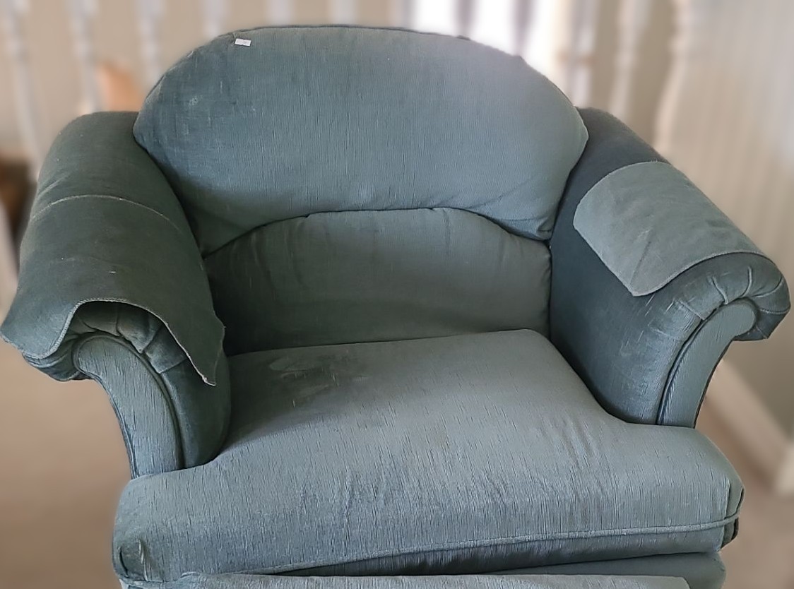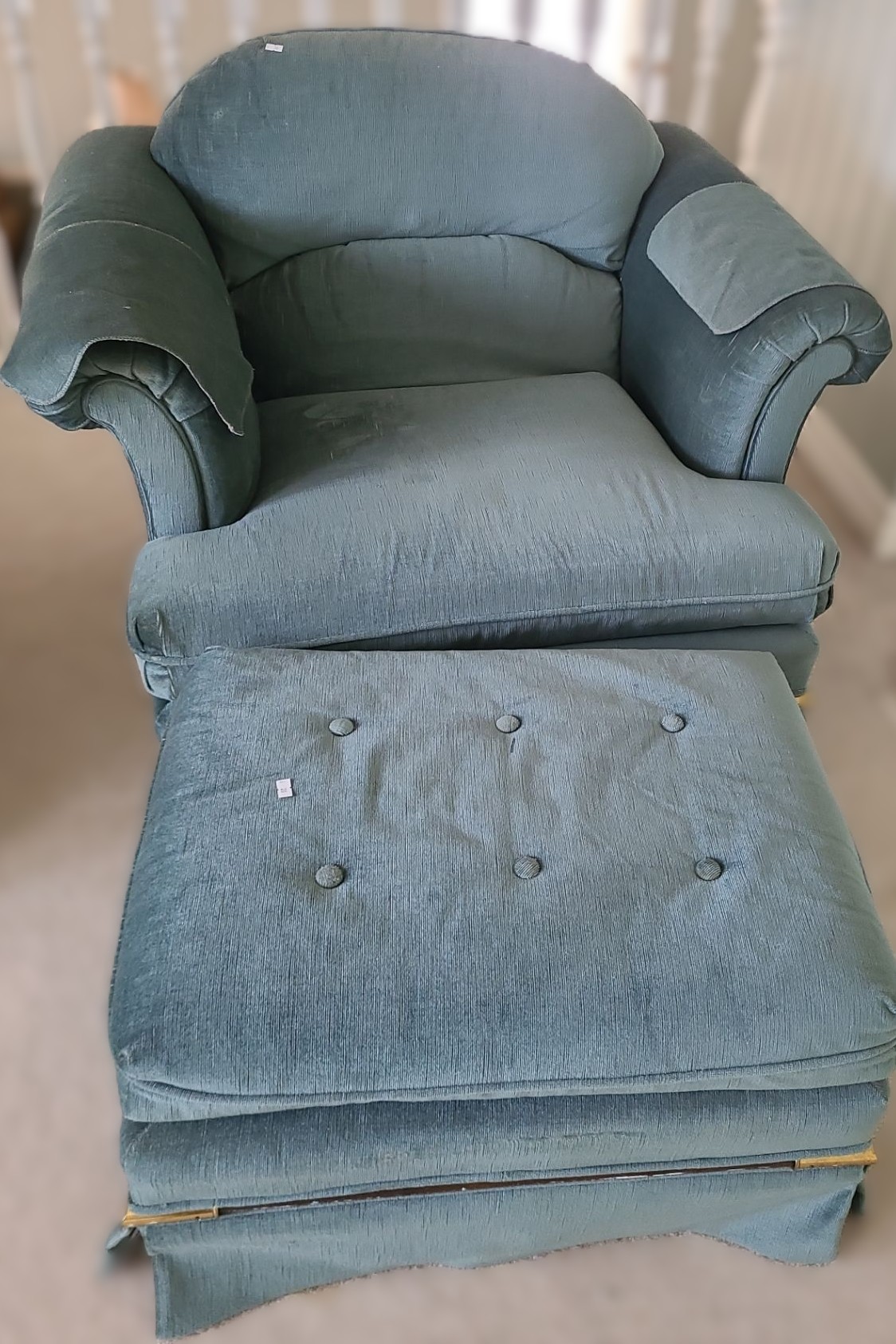 Teal Fabric Chair 39 W, 31 D, 30 T w/ Footstool 26 W, 18 D, 15 T