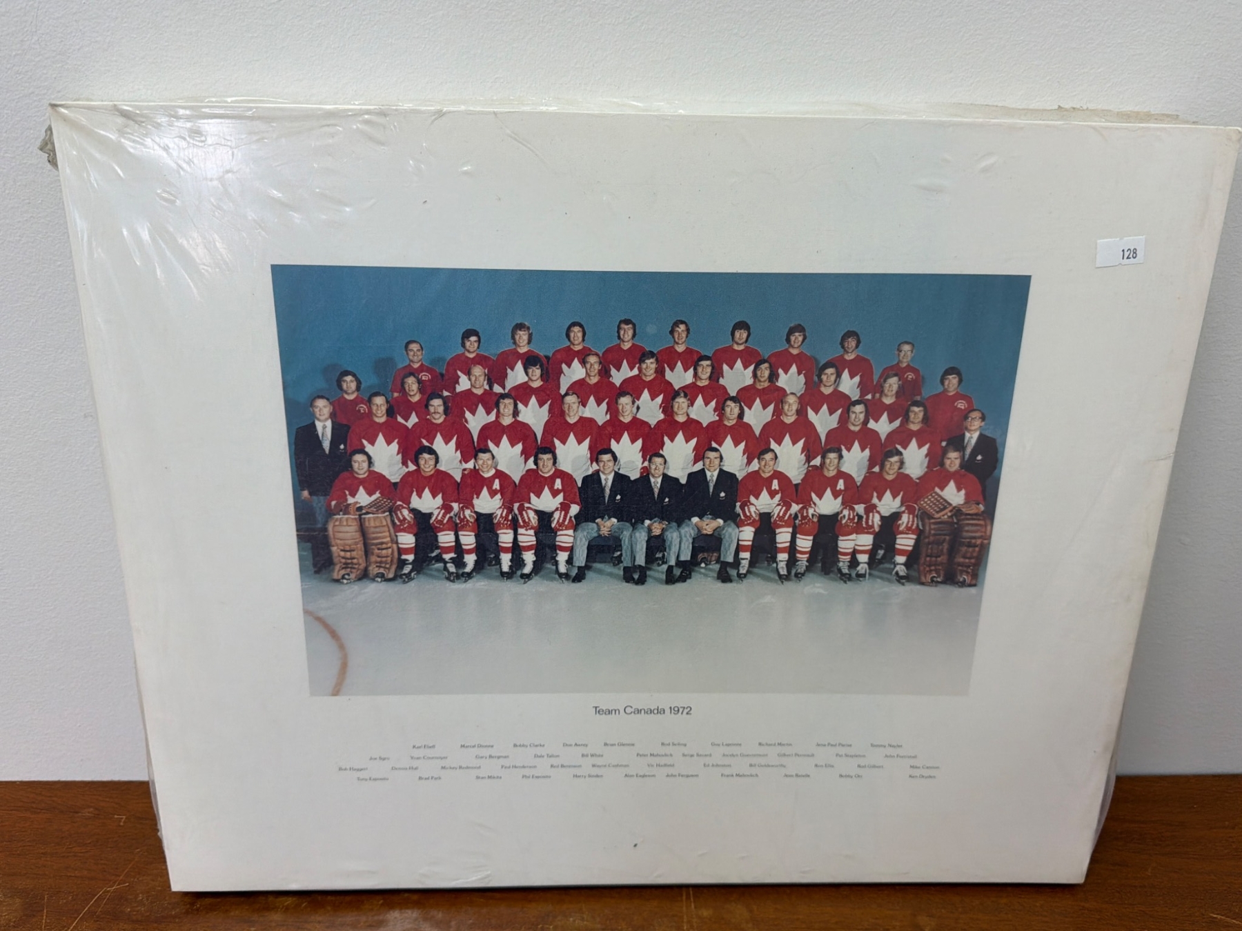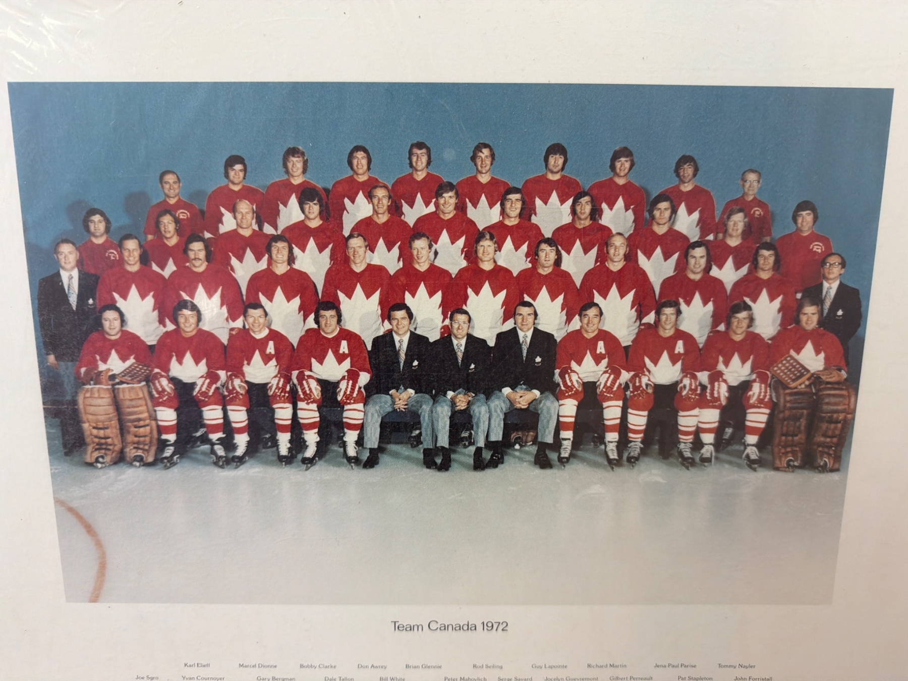 Framed photographic print of Team Canada 1972, featuring players and staff in red and white uniforms with maple leaf designs. The names of players and staff are listed below the photograph. The item is framed under protective plastic. Overall good condition with no visible major flaws.