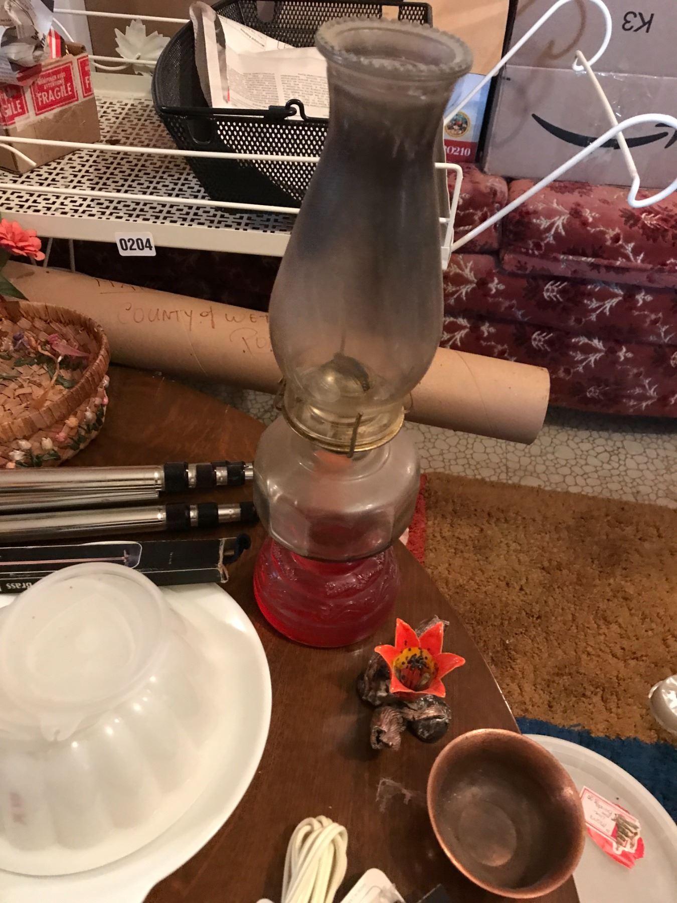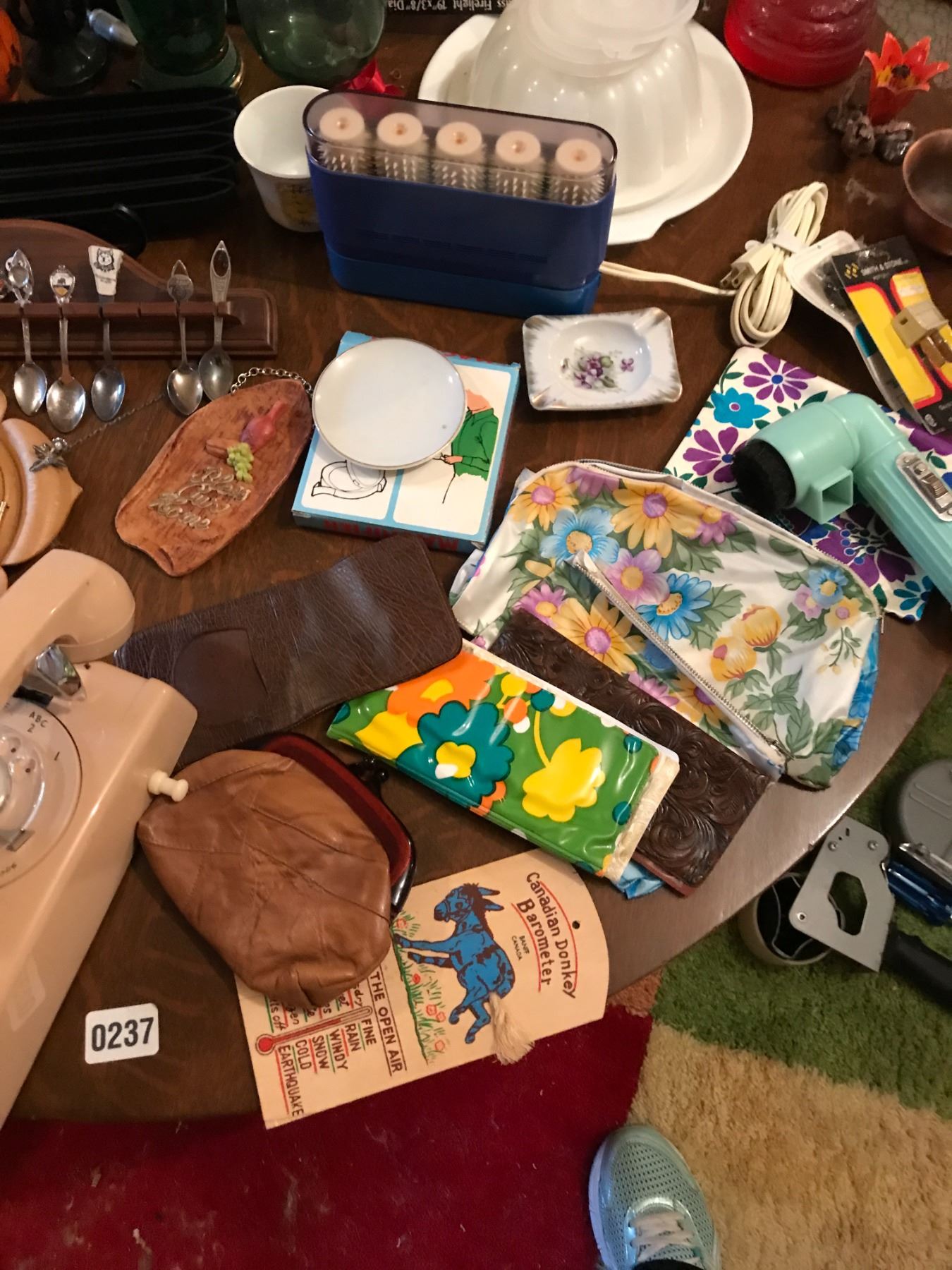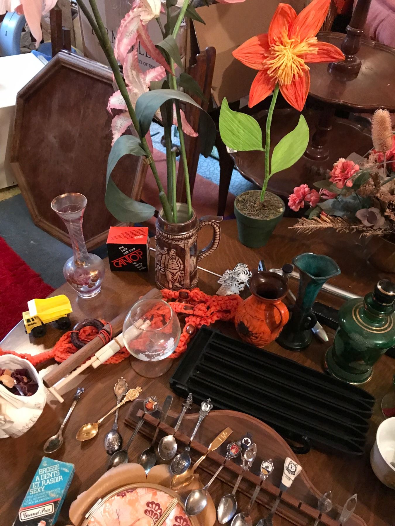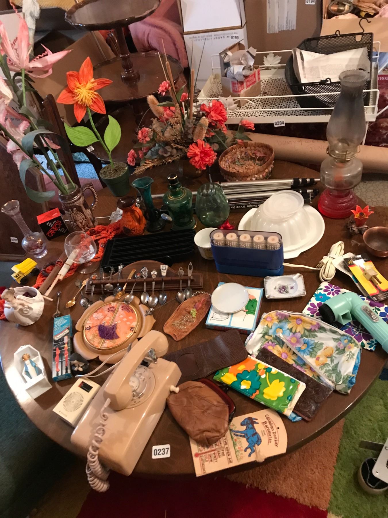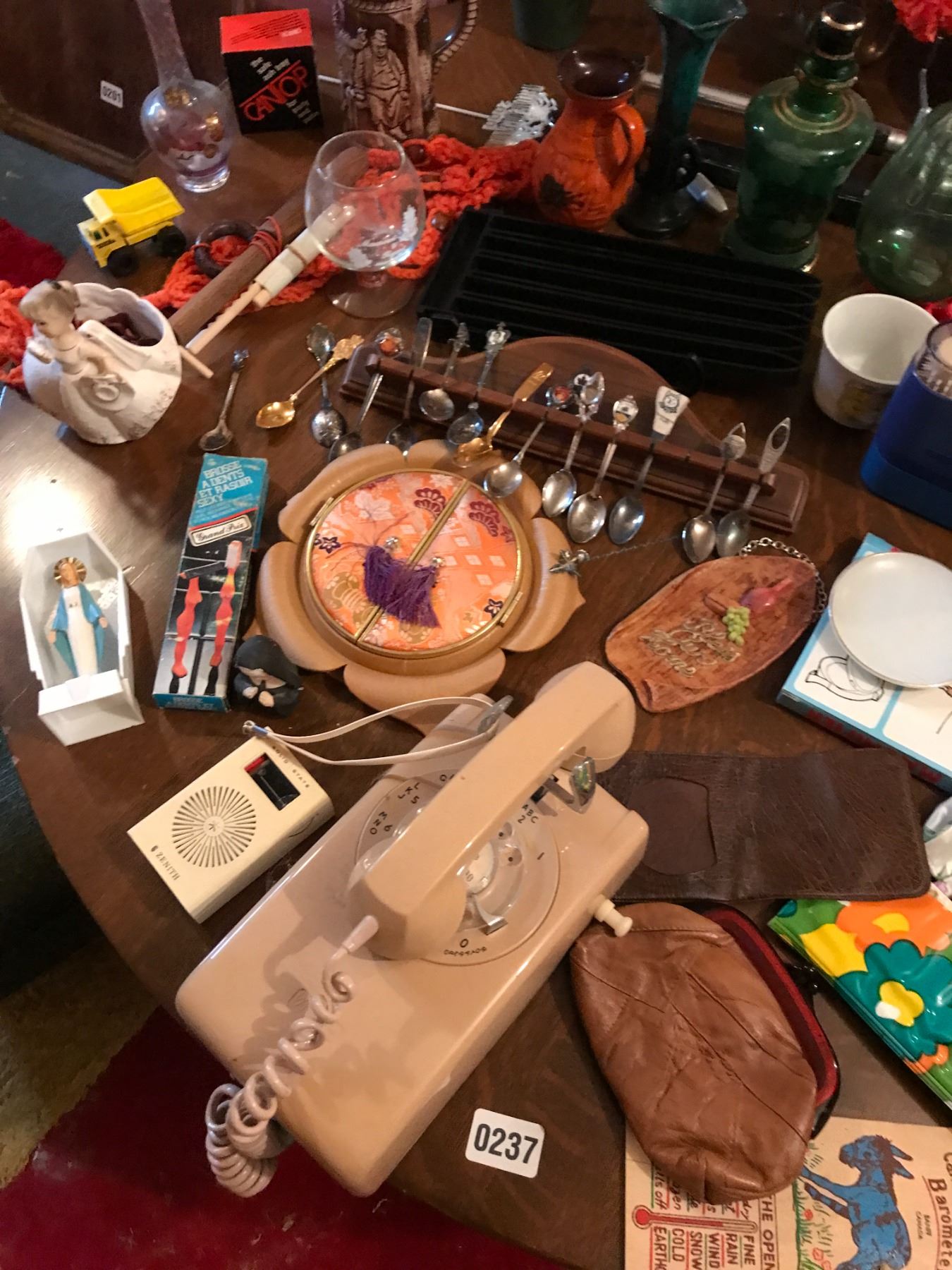 Teaspoons, Vintage Wall Phone , Oil Lamp, Blue Mountain Vase, Beer Stein, 1961 Ruben's Figurine & As