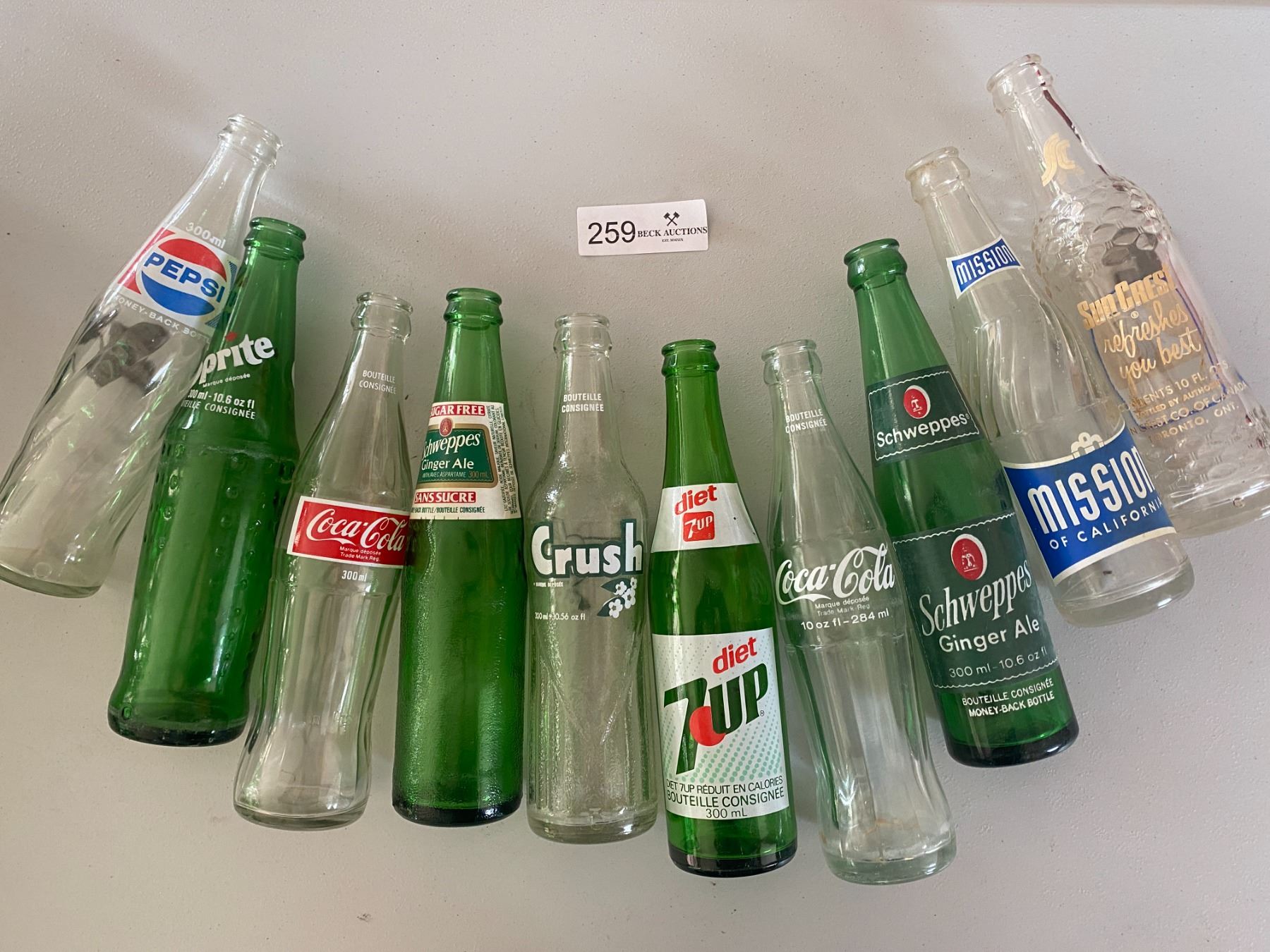 Ten Collectible Pop Bottles Pepsi, Sprite, Coca-Cola, Schwepes, Crush, Diet 7-Up, Mission, Suncrest