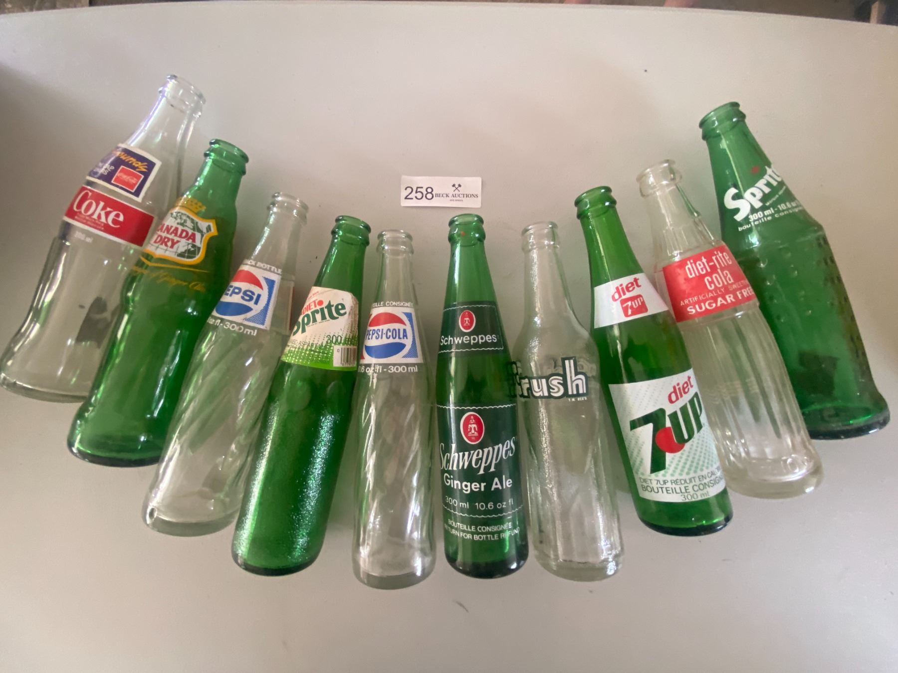 Ten Various Collectible Bottles Sprite, 7up, Crush, Pepsi, Canada Dry, Coke