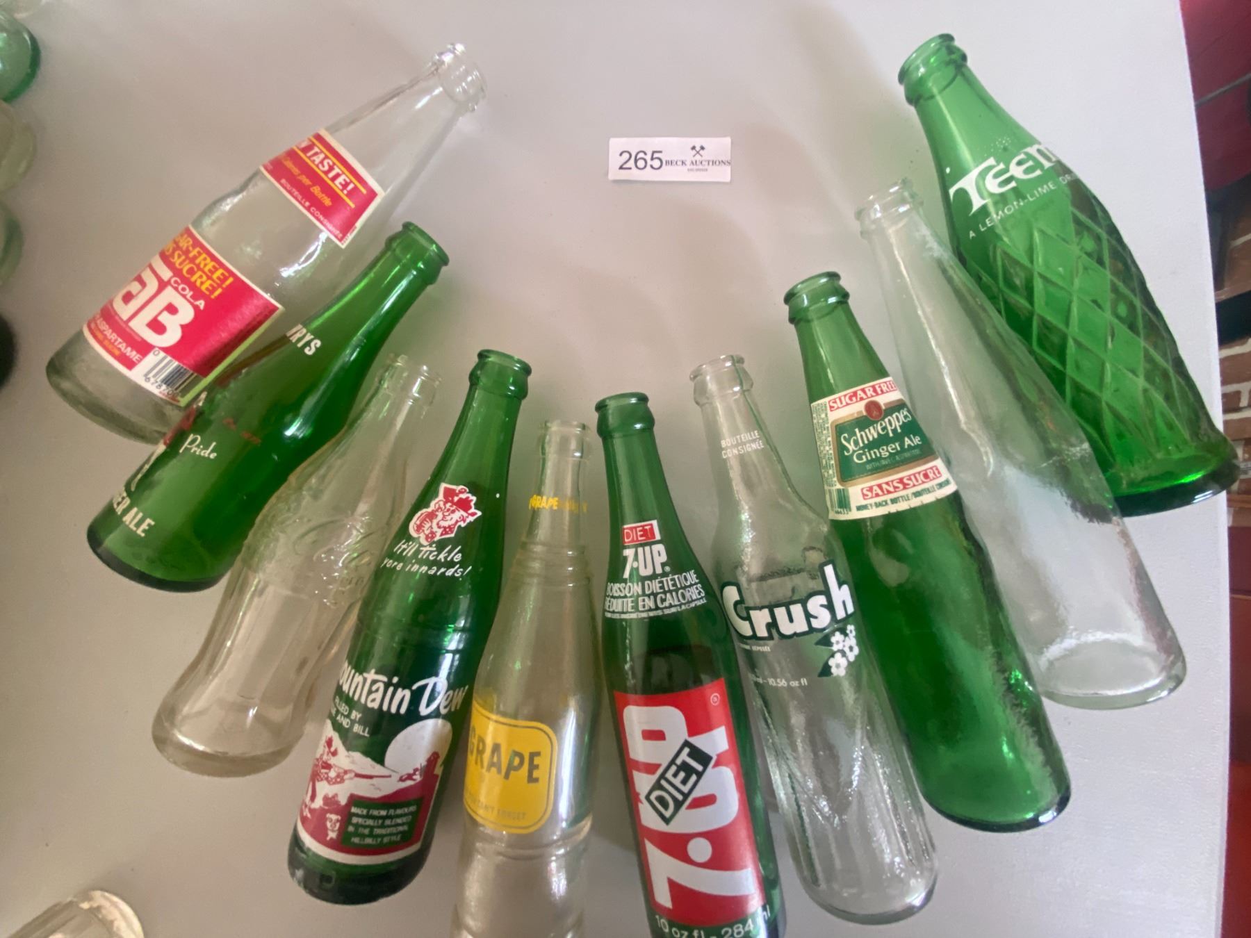Ten various pop bottles collection Tab, Mountain Dew, Grape, Diet 7-up, Crush, Schweppes, Teem