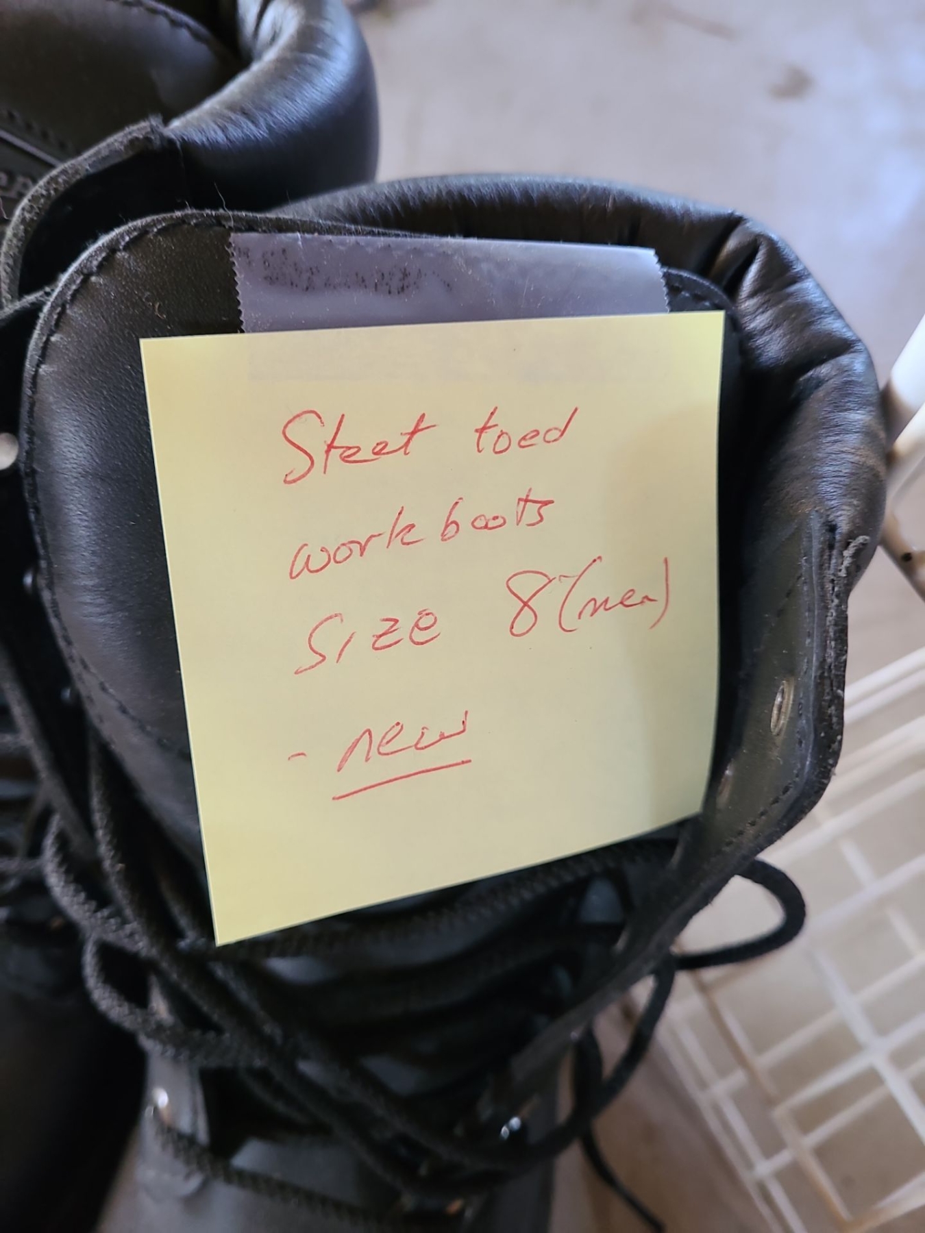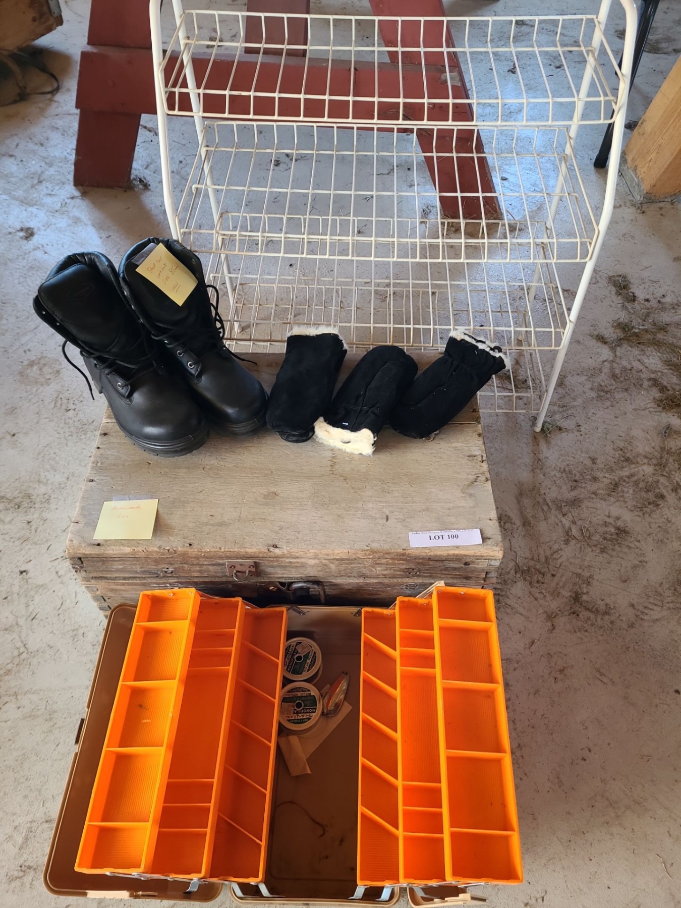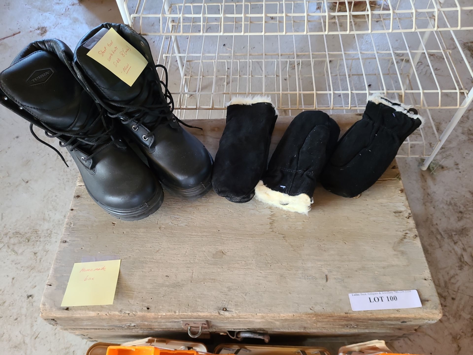 Terra Men's sz 8 Steel Toed Boots.  Antique Wood Storage Box 24w, 16 l , 9h, Shoe Rack & more