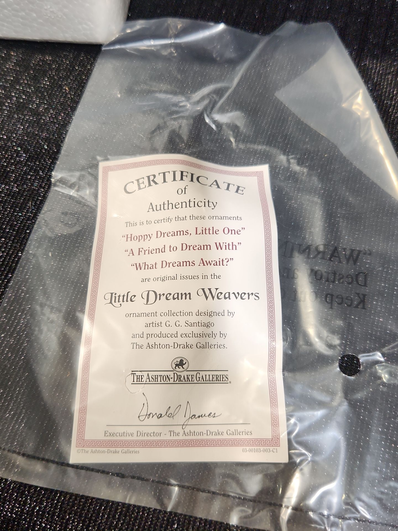 A charming selection from The Ashton-Drake Galleries’ “Little Dream Weavers” ornament series, featuring finely crafted collectible figures known for their delicate detail and warm, nostalgic design. These ornaments are beautifully finished with the quality Ashton-Drake is recognized for, making them appealing additions for collectors of limited-edition keepsakes. A lovely estate grouping ideal for display or completing an existing collection.