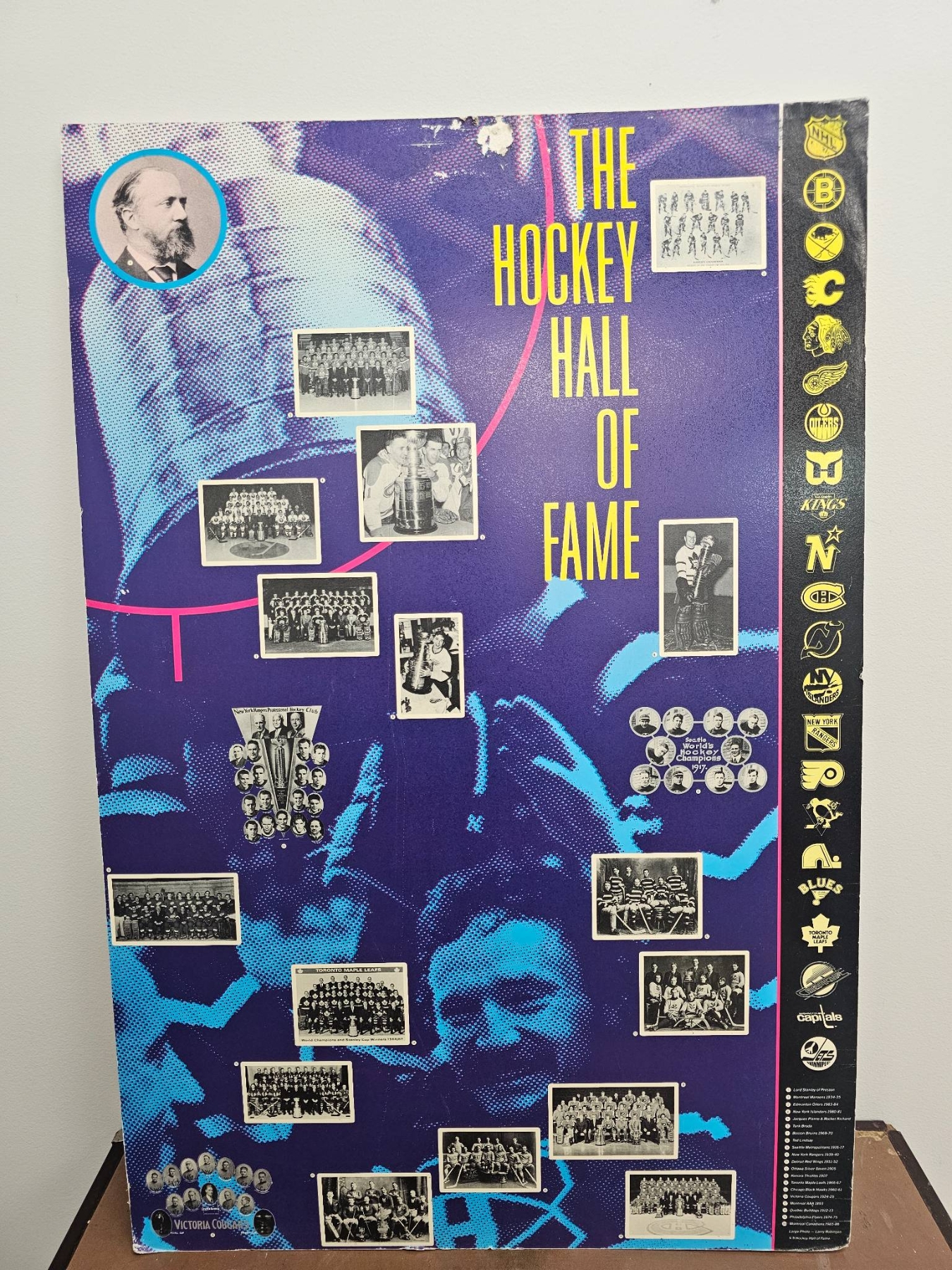 Colorful poster celebrating the Hockey Hall of Fame, featuring historical team photographs, key hockey figures, and vibrant graphics. Measures 22 inches in width by 33 inches in height, making it an excellent option for display in sports-themed spaces. A must-have for hockey fans and collectors highlighting a legacy of the sport.