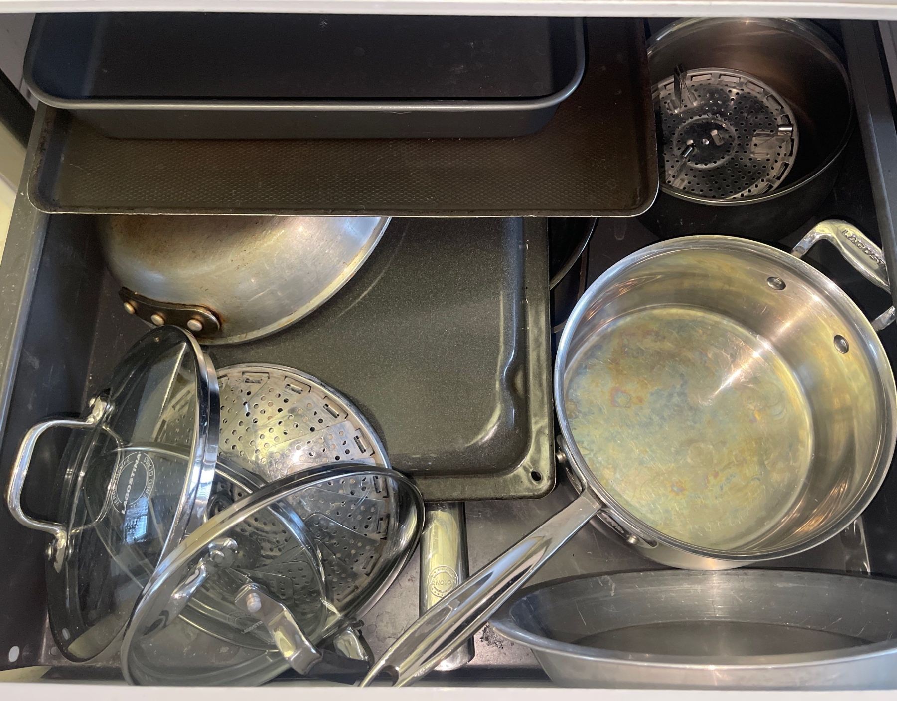 The Pots & Pan Drawer Full Of Great Cooking Items Frying Pans Baking Sheets, Cake Pans & More
