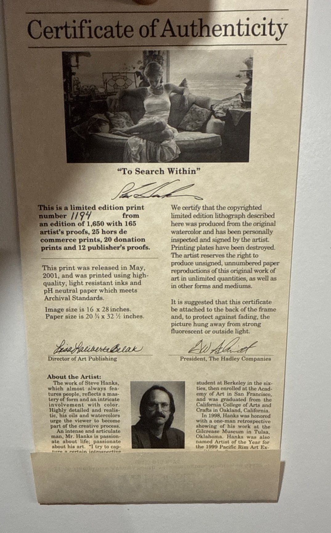 'The Search Within' Ltd Edition Print By Steve Hanks 1194/1650, w/ CoA, 39x27