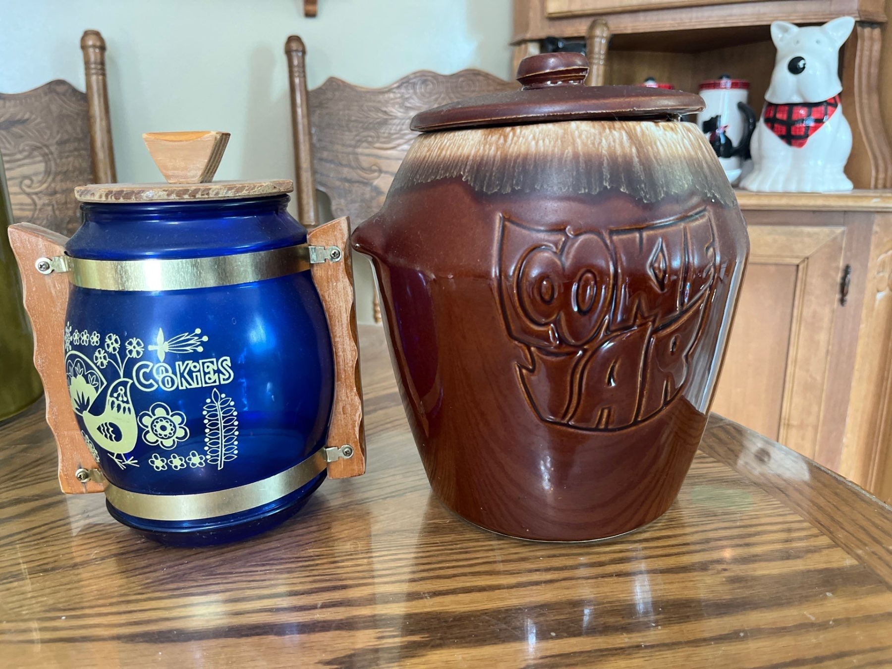 This Is A Vintage McCoy Brown Drip Cookie Jar with Lid and Small Blue Vintage Cookie Jar