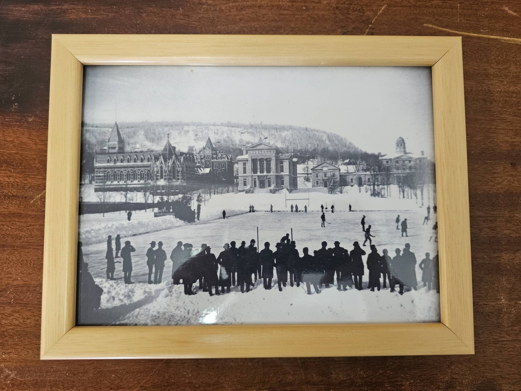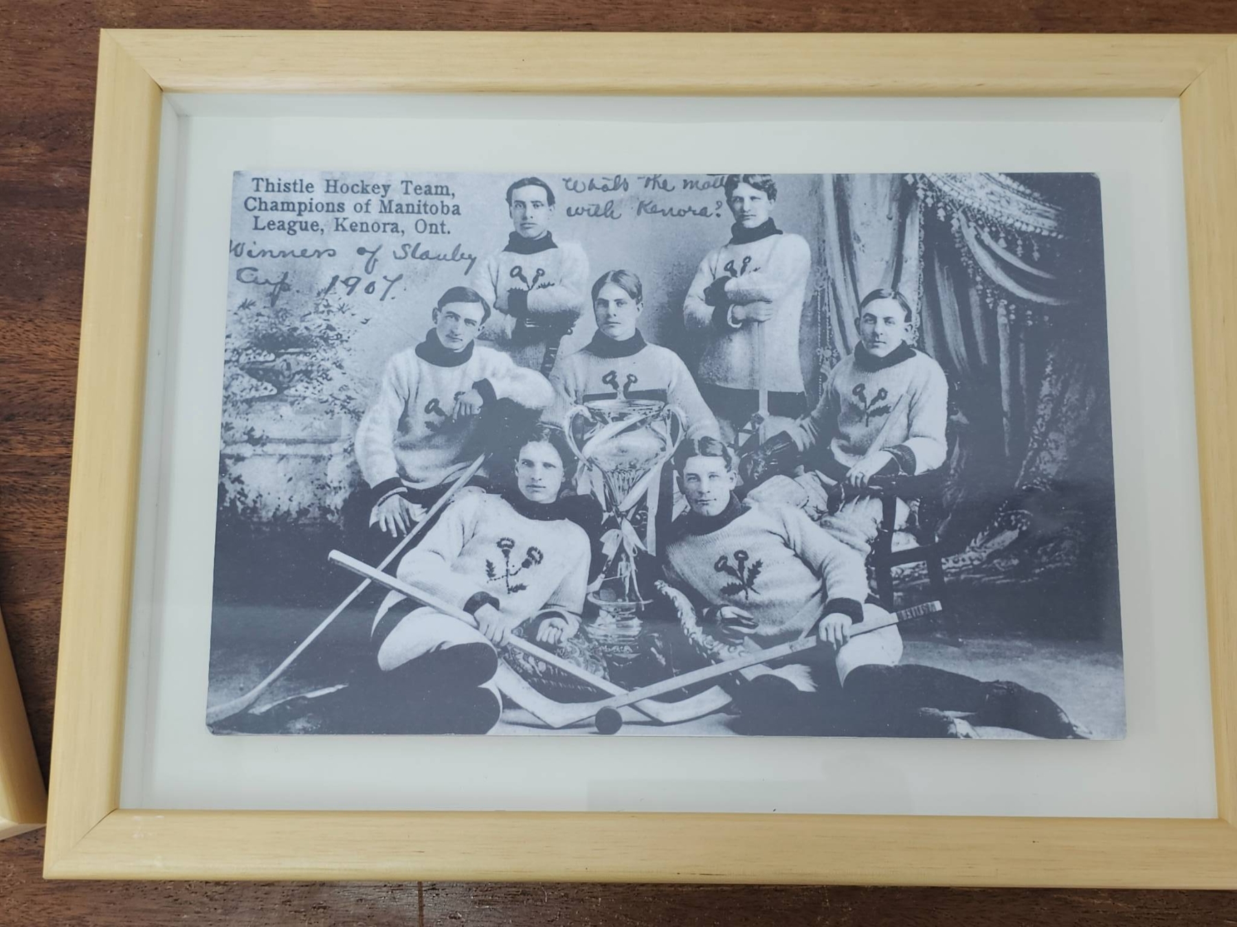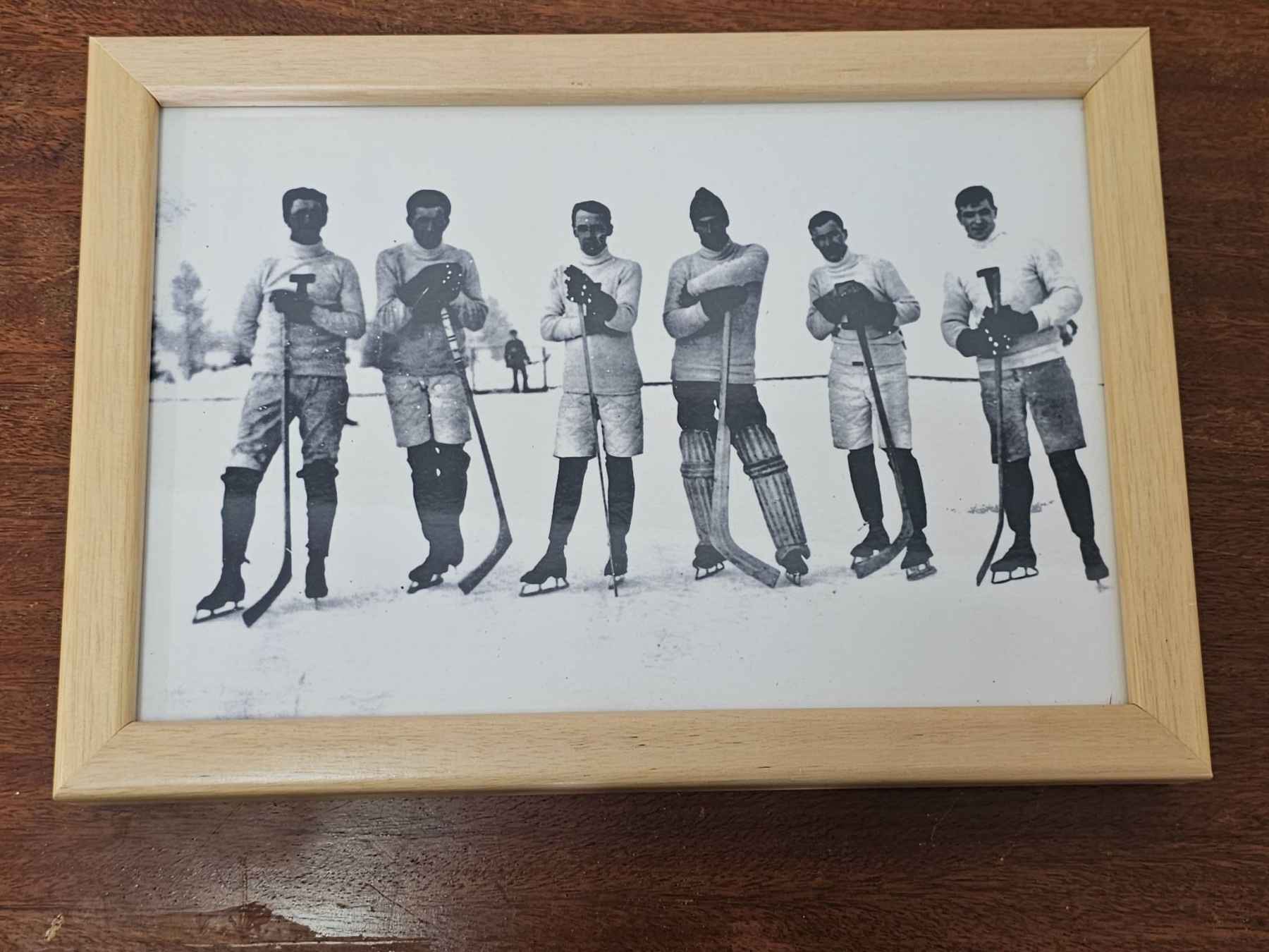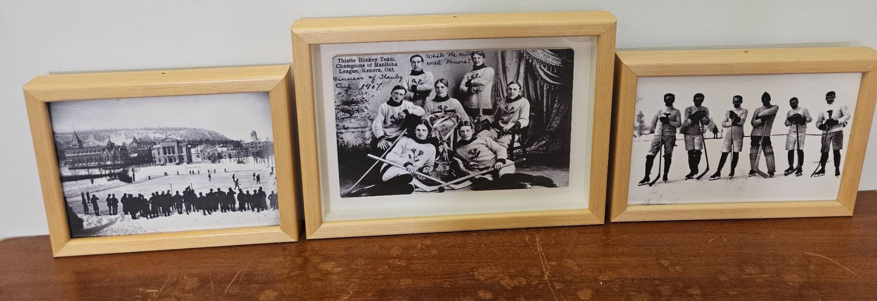 Three black-and-white photographs related to hockey, each framed in a simple light wood frame. Includes images depicting a hockey game, a team portrait, and individual players with hockey sticks. Frames are consistent in style and condition, suitable for display.