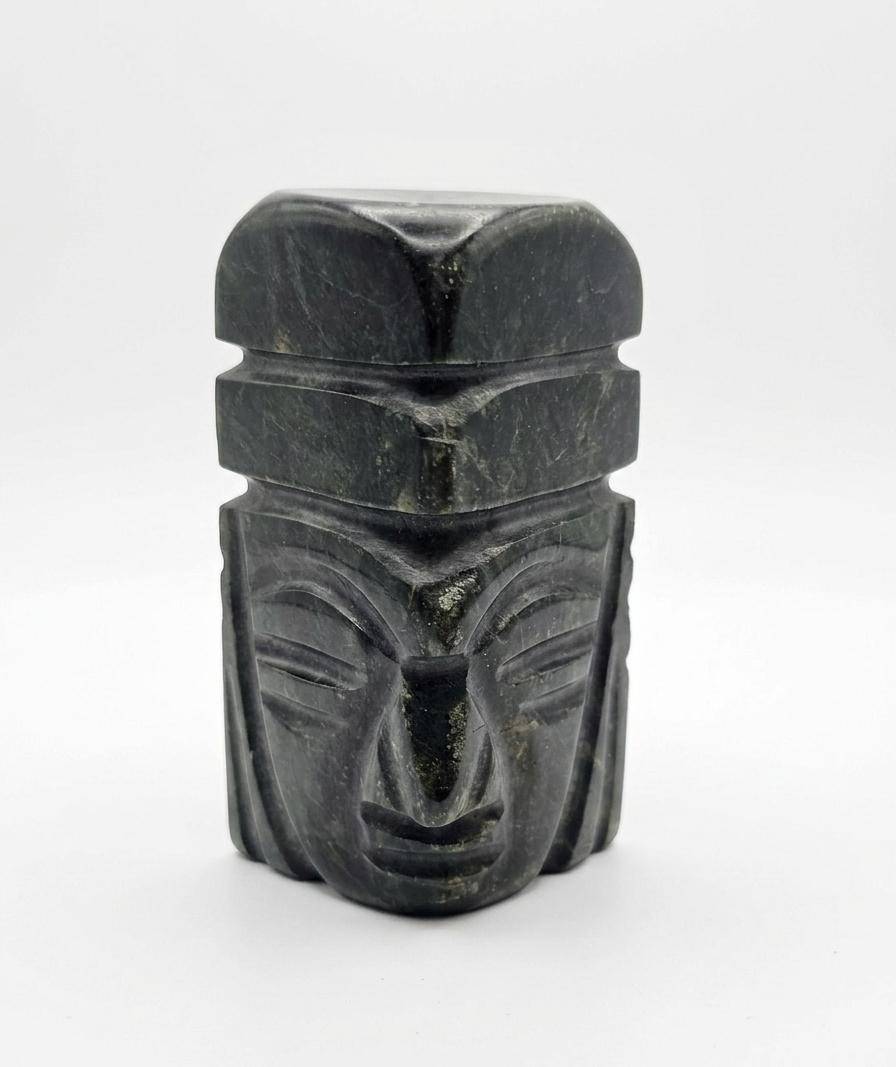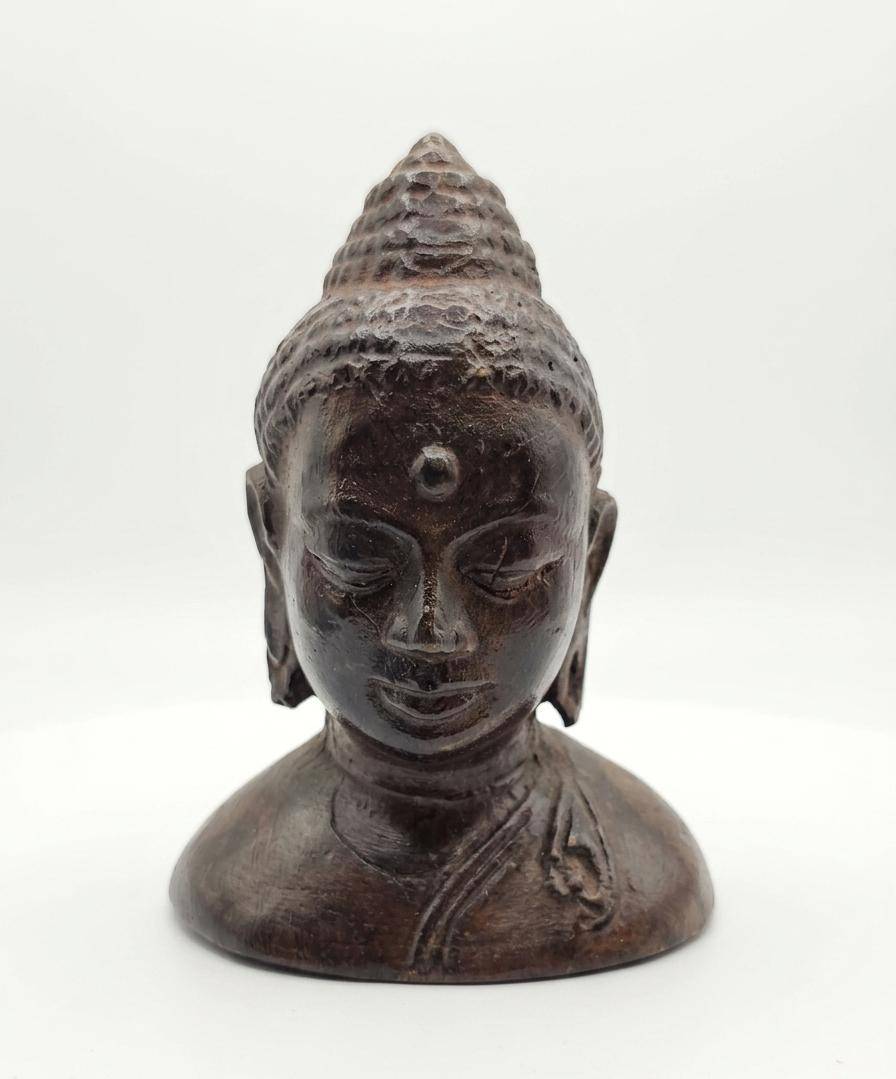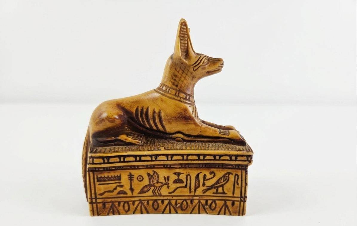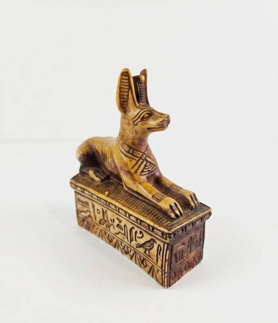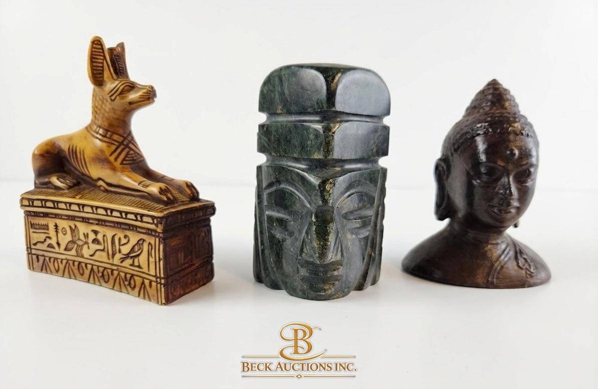 Three decorative figurines crafted from varied materials. The Anubis piece is intricately detailed with hieroglyphics, measuring approximately 4 inches in height, showcasing an ancient Egyptian style. The tribal head figurine, also 4 inches tall, features a robust design with etchings that echo traditional craftsmanship, made from a dark stone-like material. The Buddha figurine, similarly 4 inches in height, presents serene details and a polished finish, evoking a spiritual essence. A unique set ideal for collectors or display.
