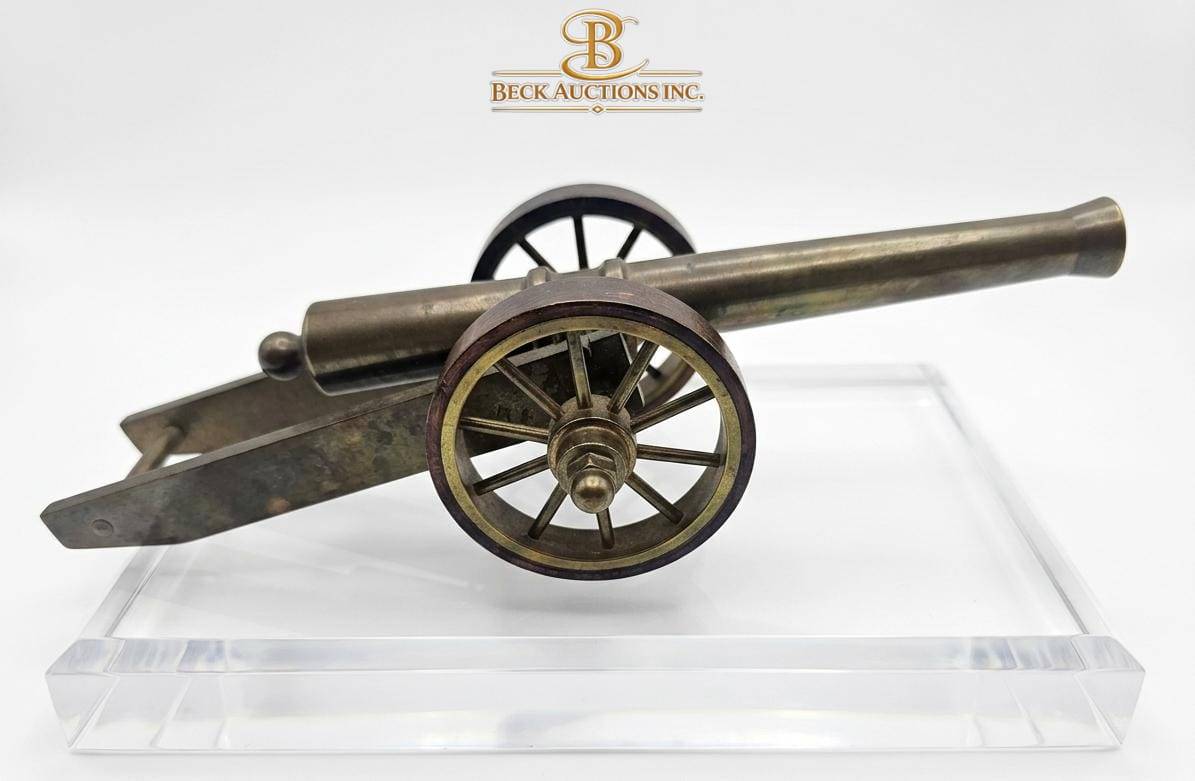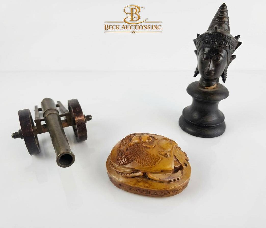 This unique set includes three distinct decorative pieces: a brass cannon (approximately 6.5 inches long, 3 inches wide, and 3 inches tall), a carved ox bone box featuring intricate animal designs (3 inches long, 2 inches wide, and 1.5 inches tall), and a black bust figurine (5 inches tall, base diameter of 2.5 inches). Each item showcases attention to craft and detail, perfect for adding character to a collection or display.