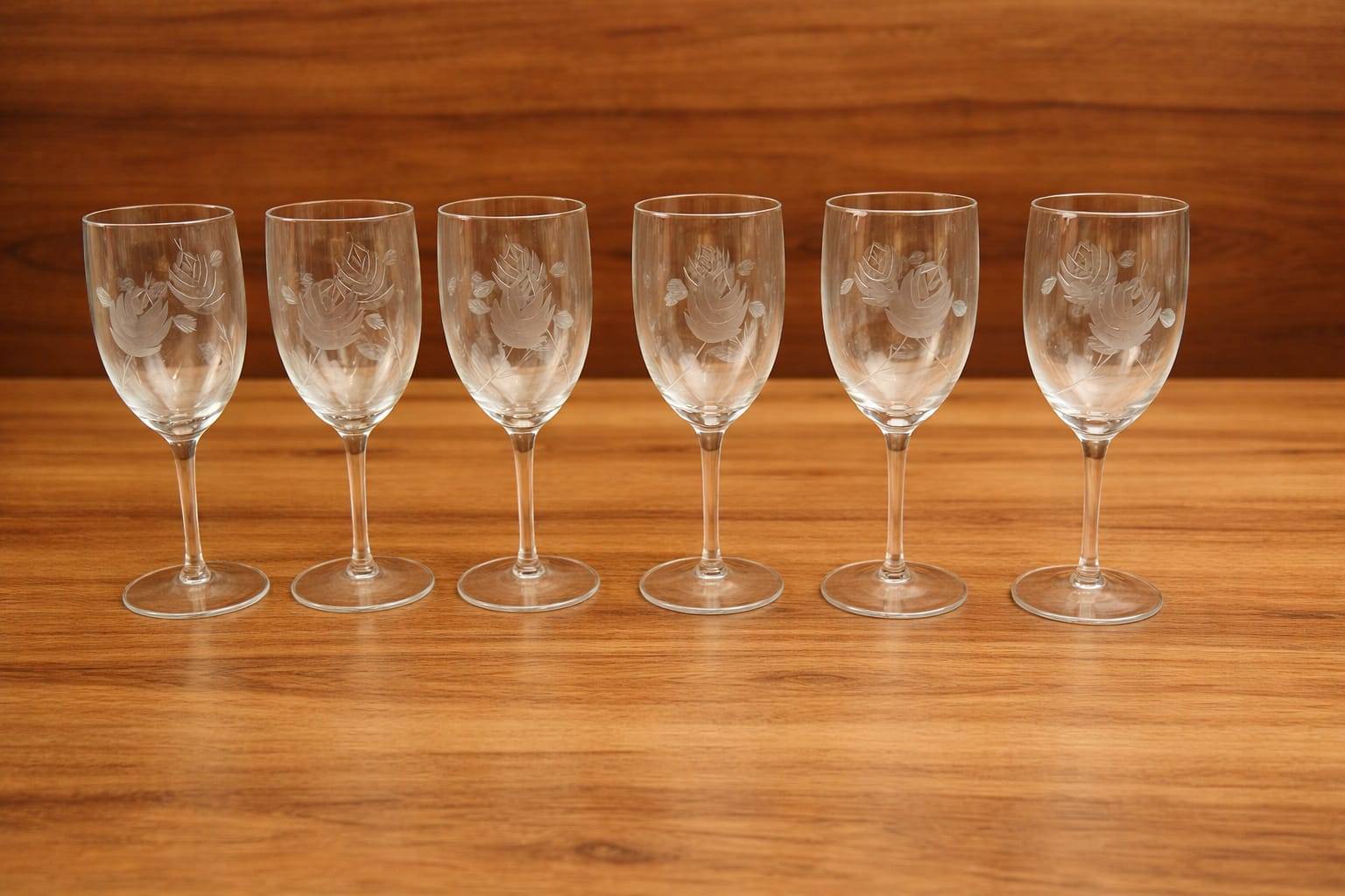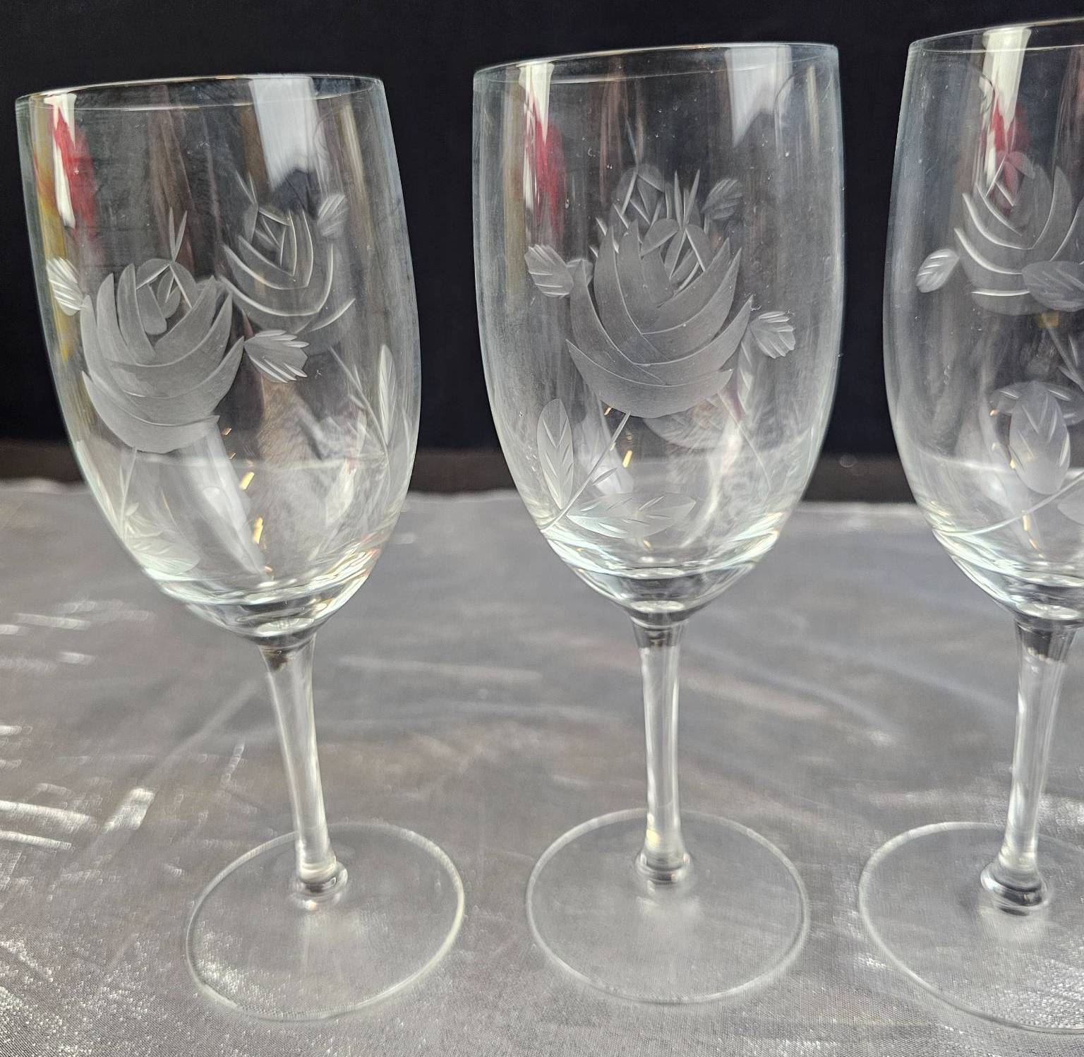 Three elegant wine goblets crafted from clear glass, featuring a delicate etched floral motif. Each goblet is designed with a steady stem Perfect for entertaining or as decorative additions to a glassware collection. Very good condition with no visible chips or cracks.