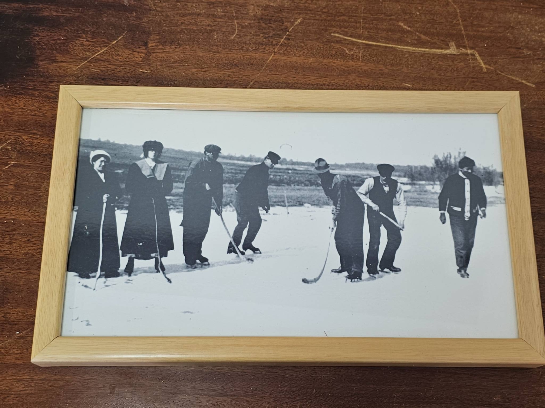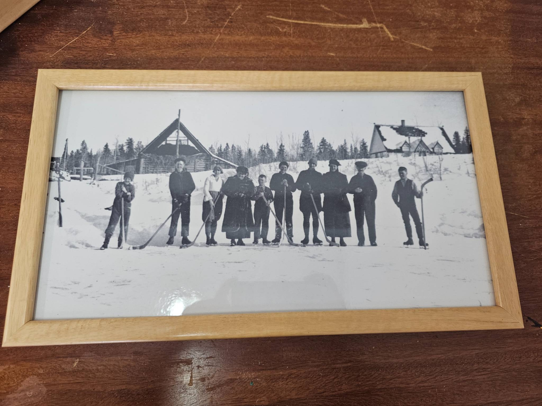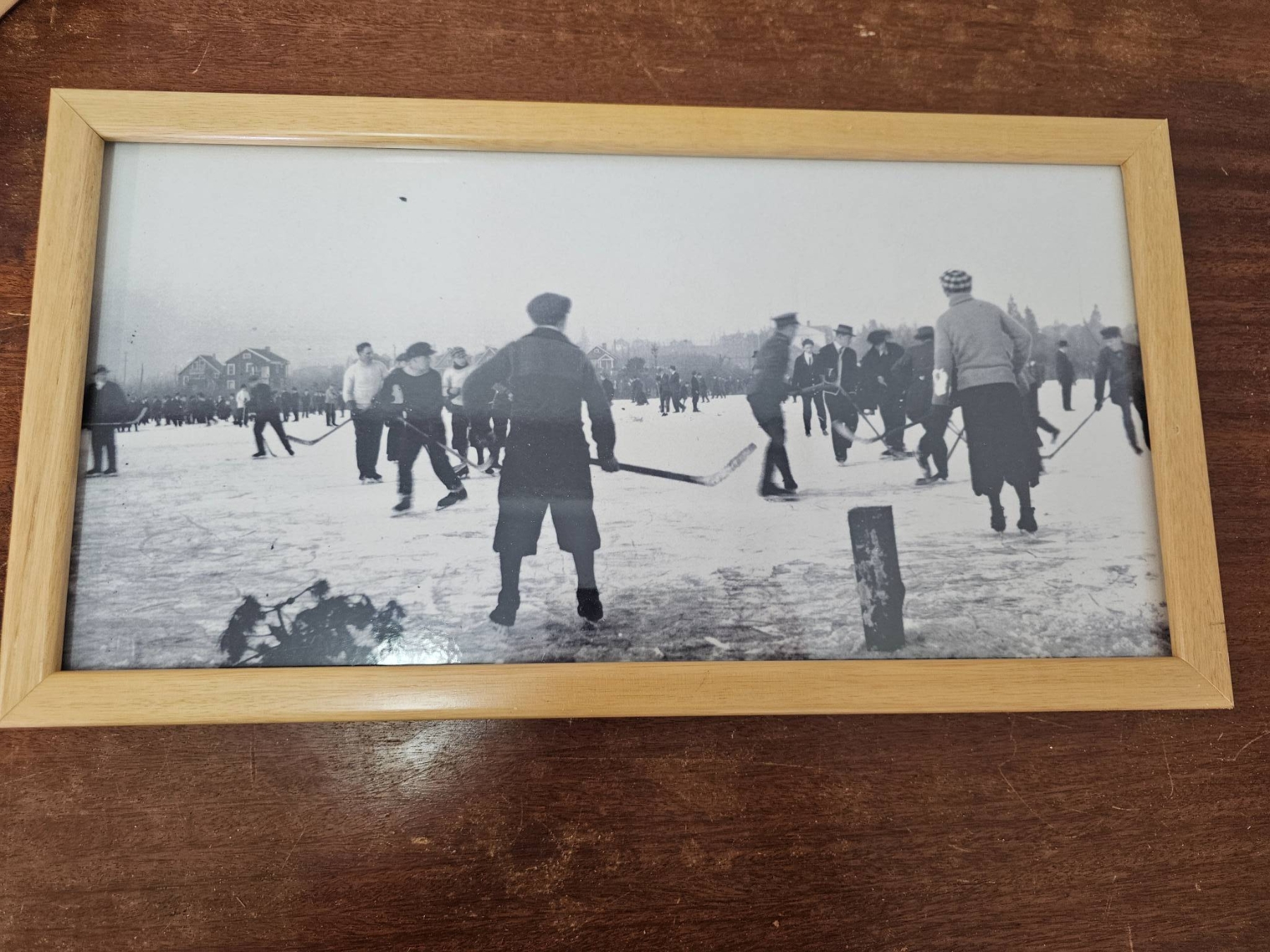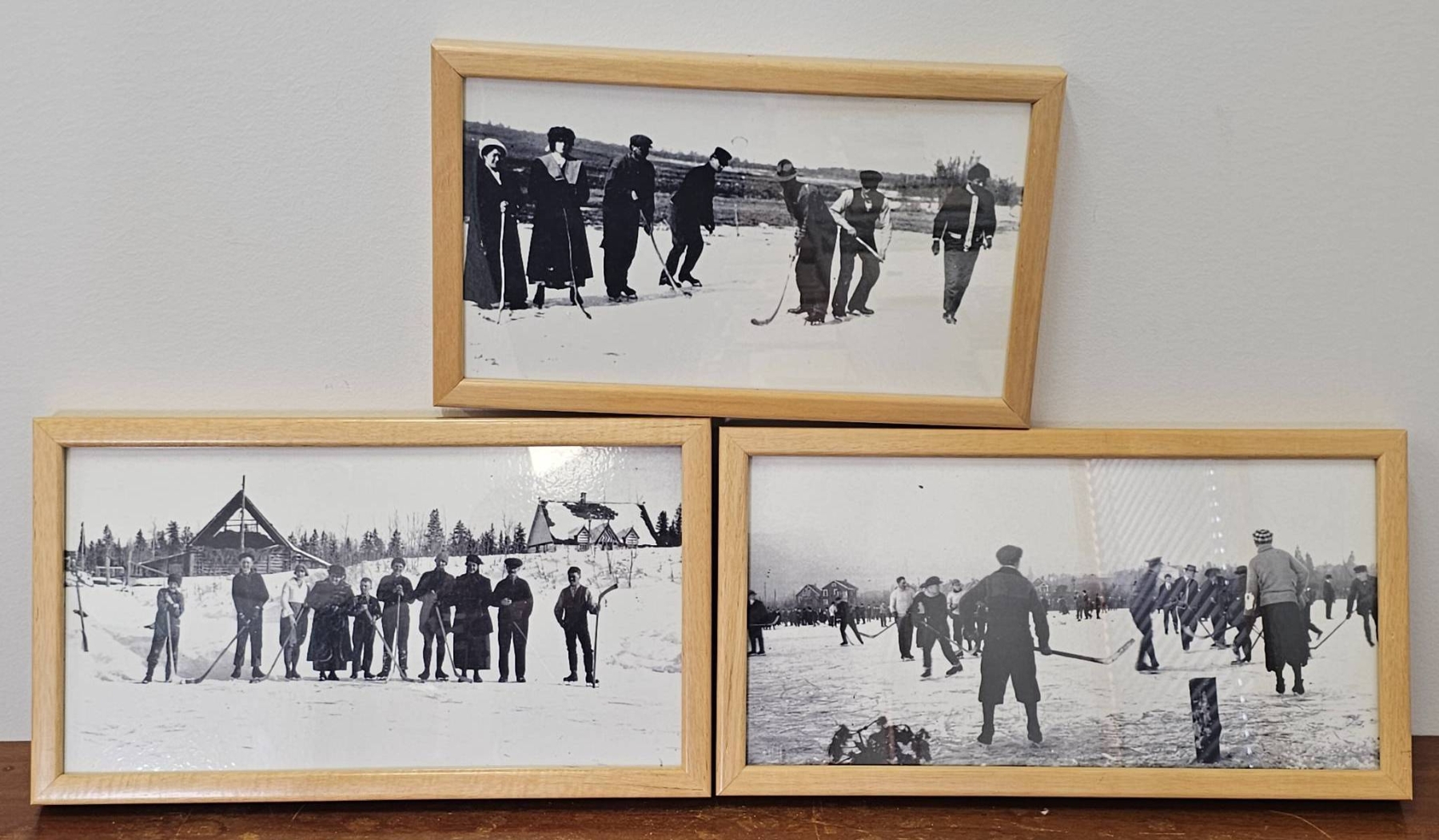 Three framed black and white prints depicting historical hockey scenes. Each photo is mounted in a light wooden frame, showcasing images of players and outdoor rinks in a vintage winter setting. Frames are secured with backing, and each piece is ready for hanging. The pieces are in good condition with minimal wear on the frames.