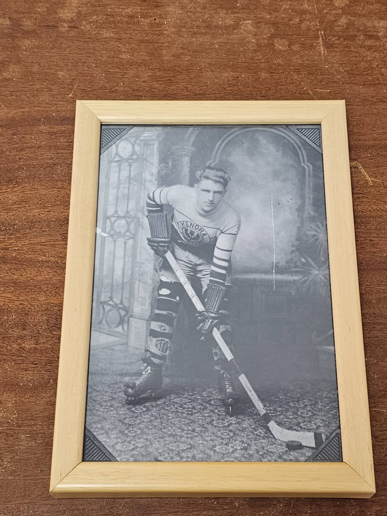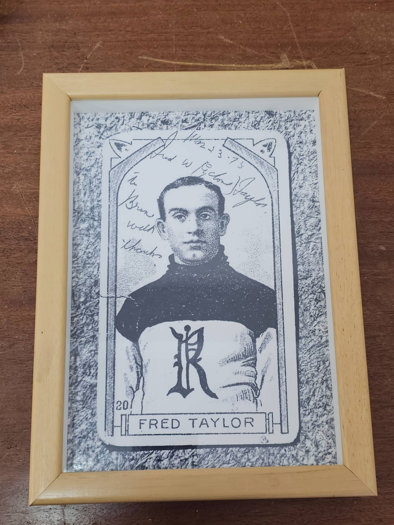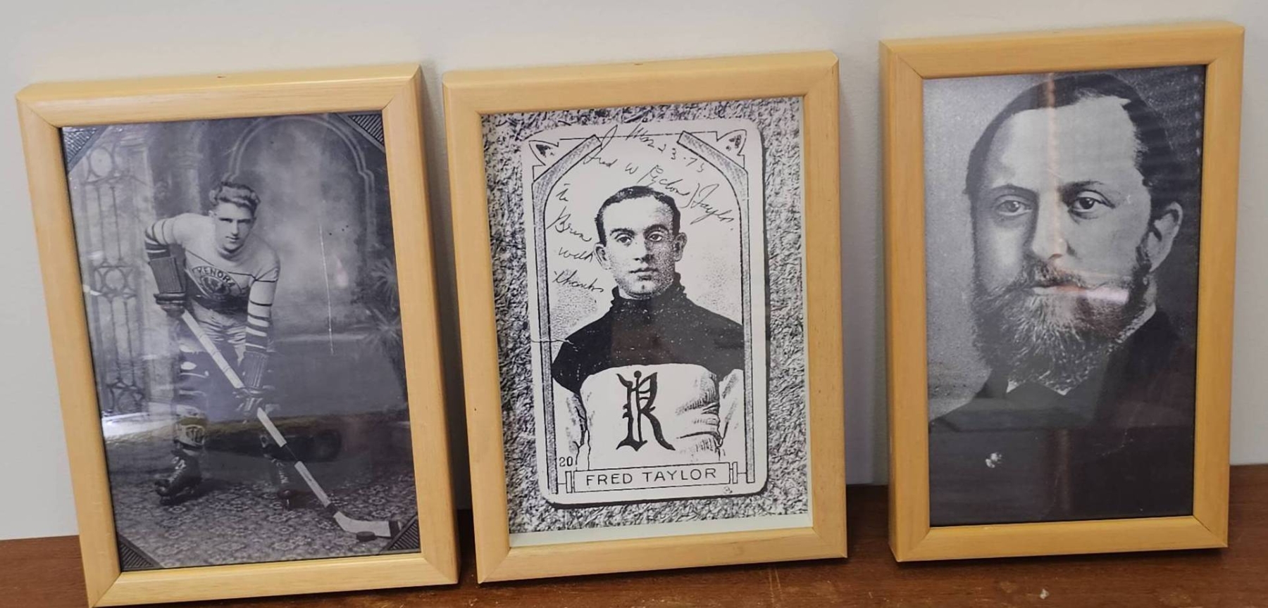 Three framed black-and-white photographic prints related to hockey history. The subjects include a hockey player in gear, a portrait-style image of Fred Taylor, and a formal portrait of an individual. Each is housed in a wooden frame with visible backs, some including handwritten annotations and item numbers. Frames are consistent in design, made of light wood material.