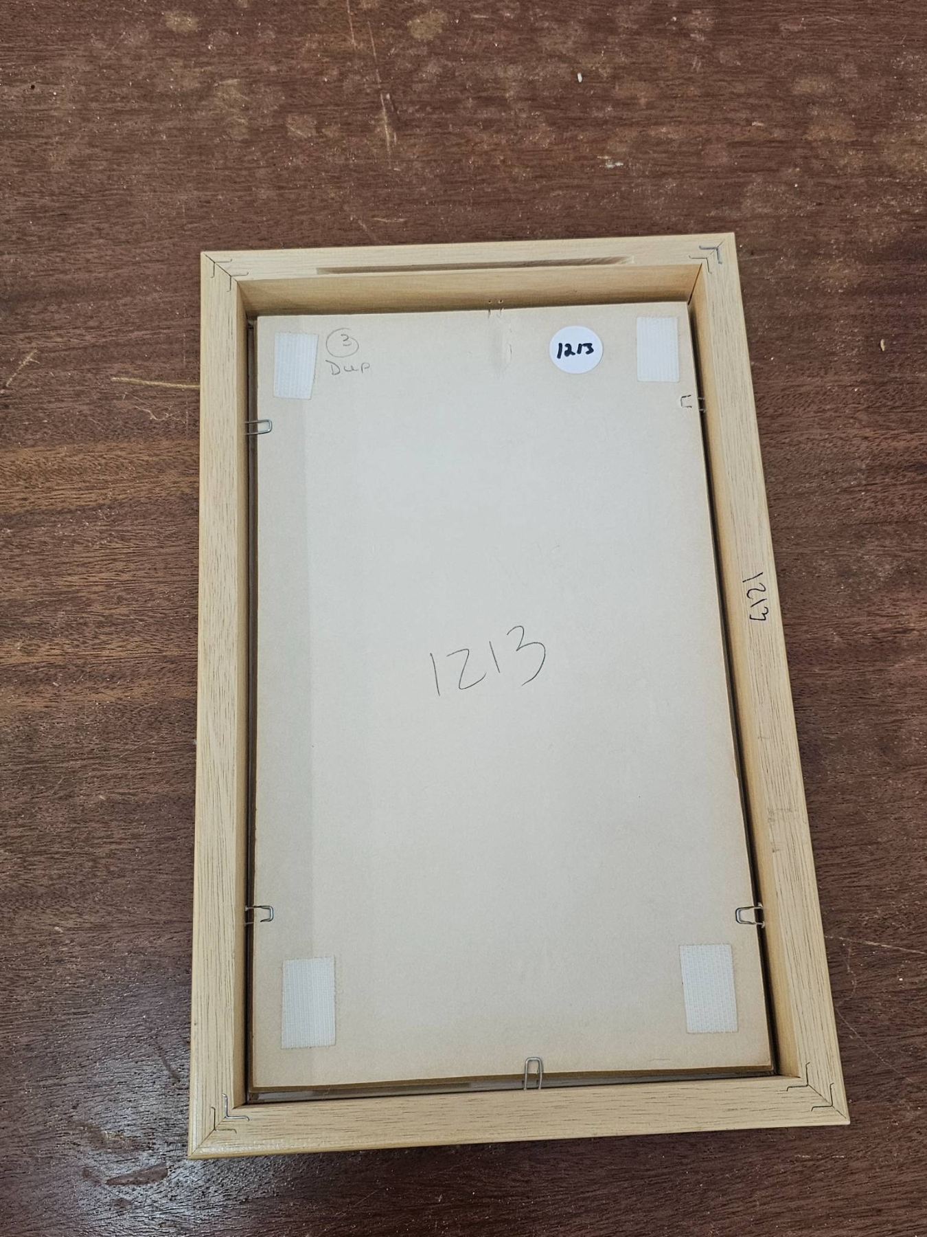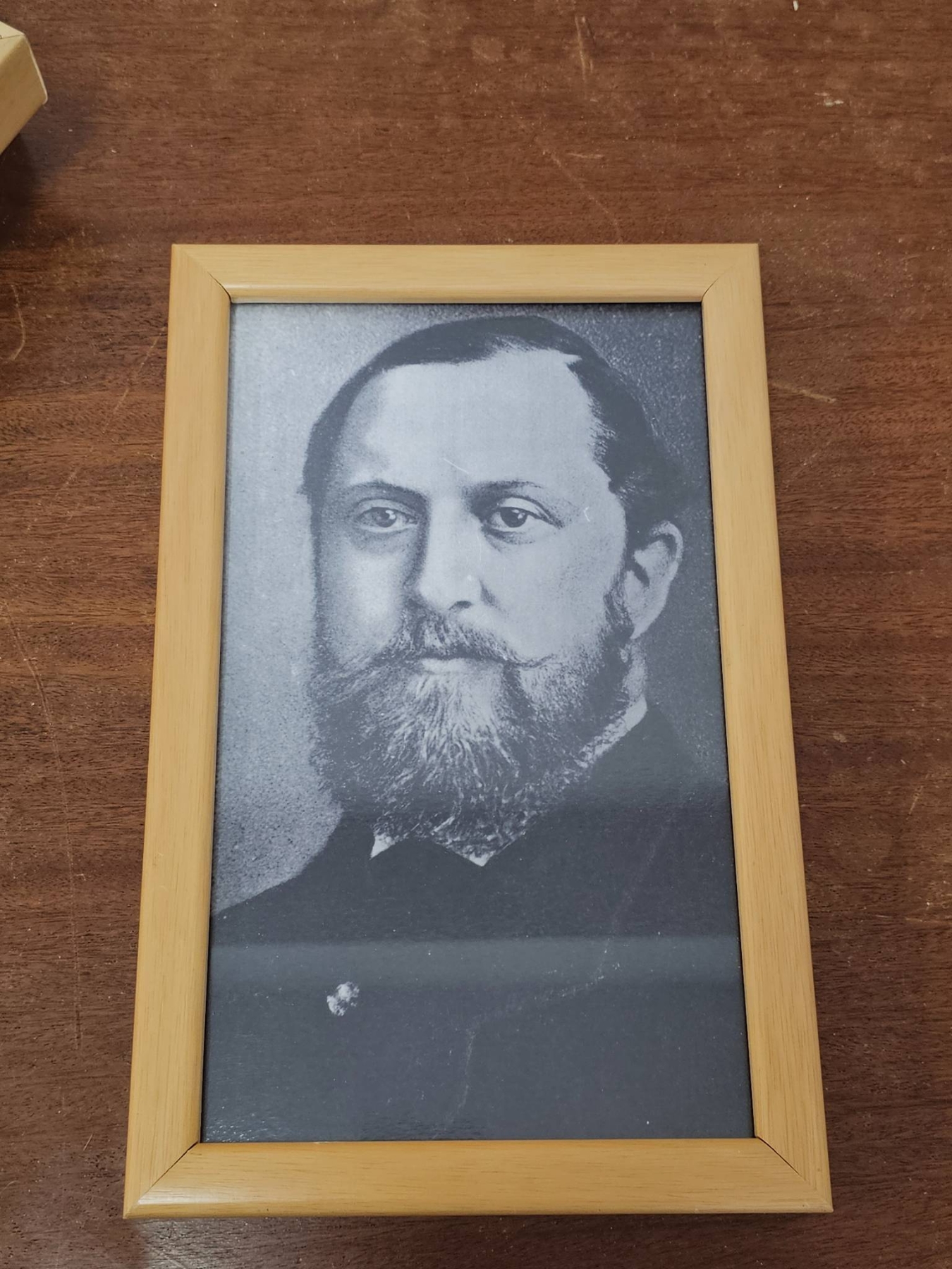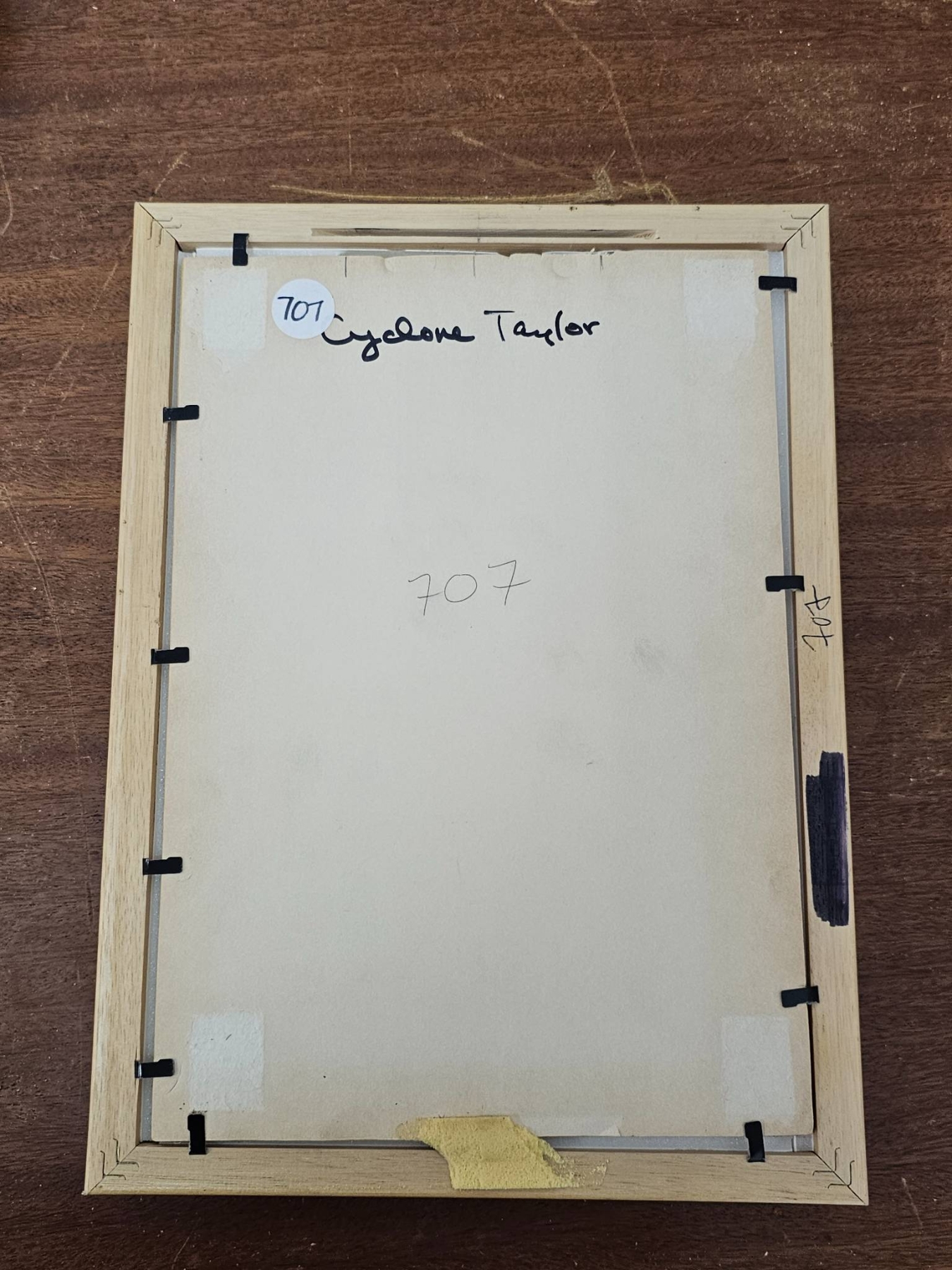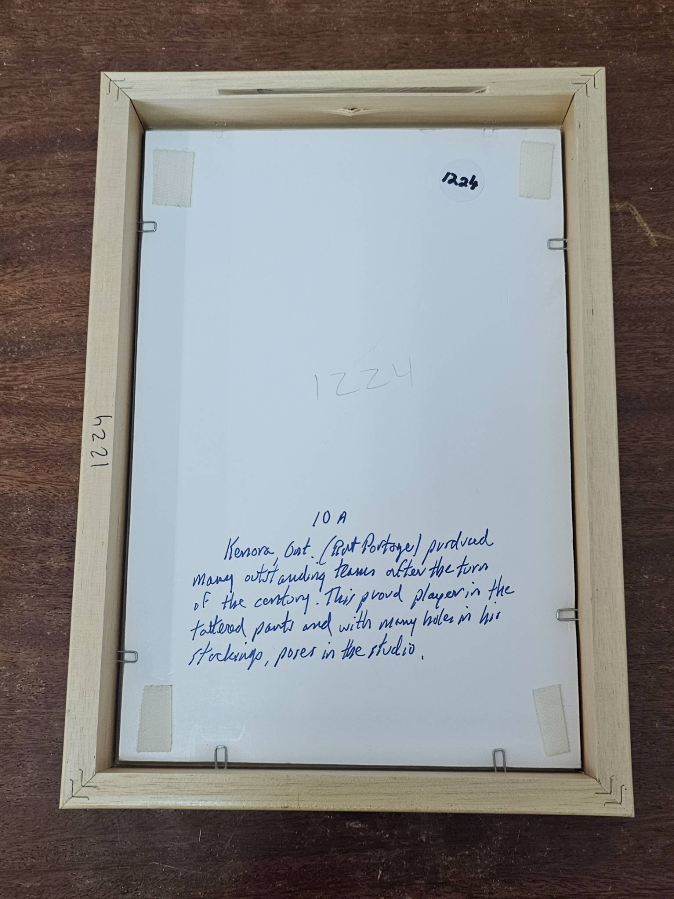 Three framed black-and-white photographic prints related to hockey history. The subjects include a hockey player in gear, a portrait-style image of Fred Taylor, and a formal portrait of an individual. Each is housed in a wooden frame with visible backs, some including handwritten annotations and item numbers. Frames are consistent in design, made of light wood material.