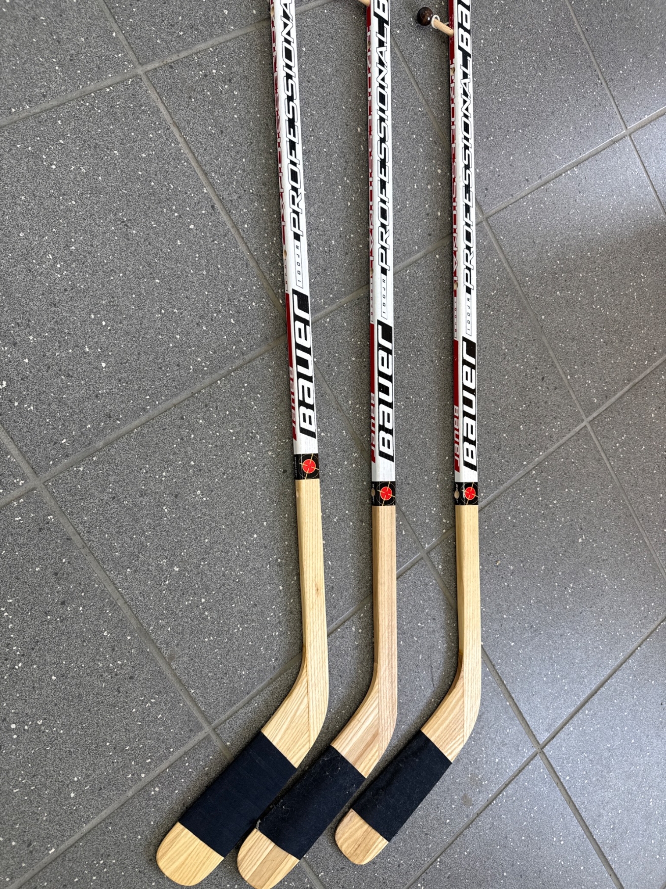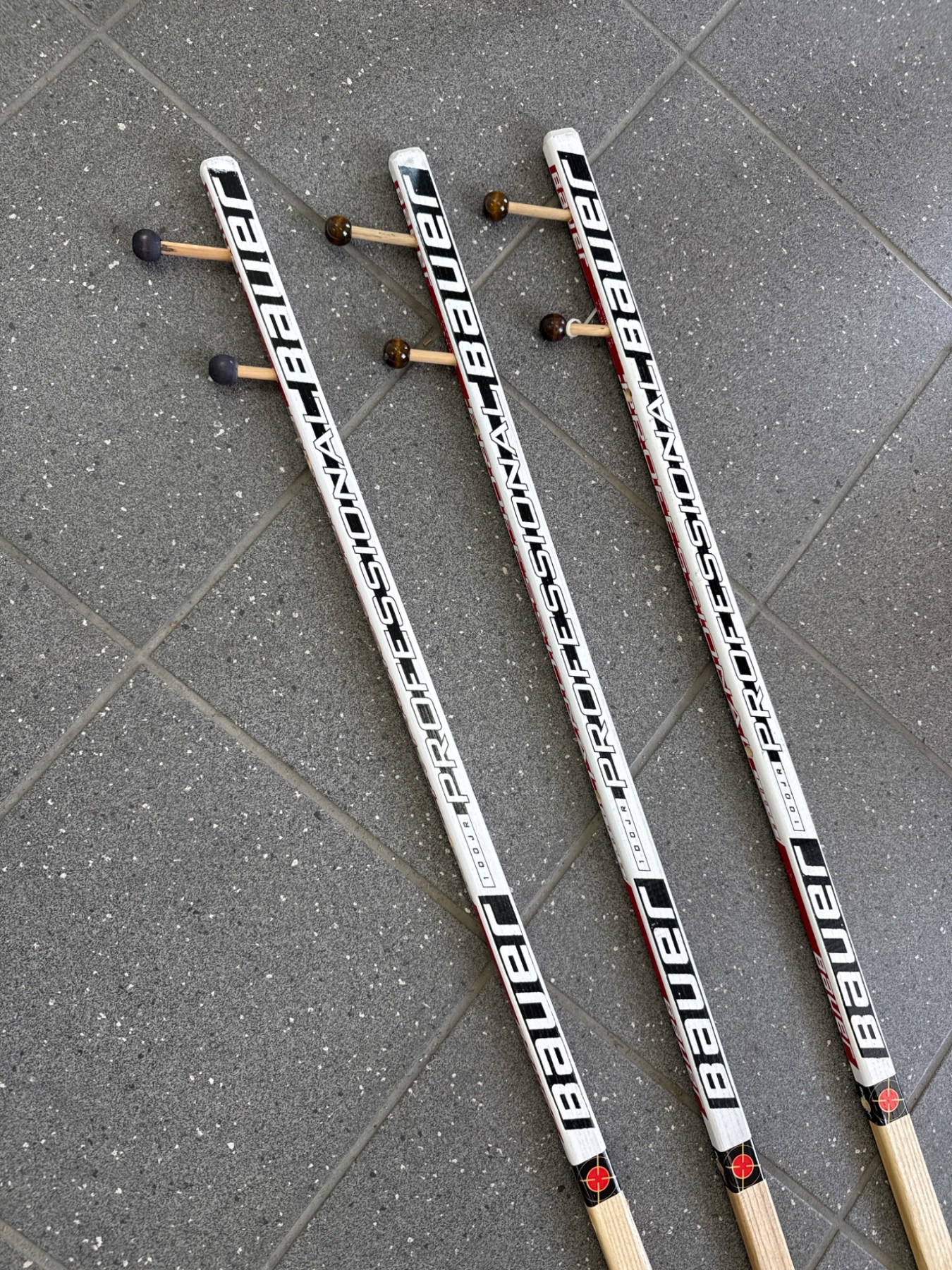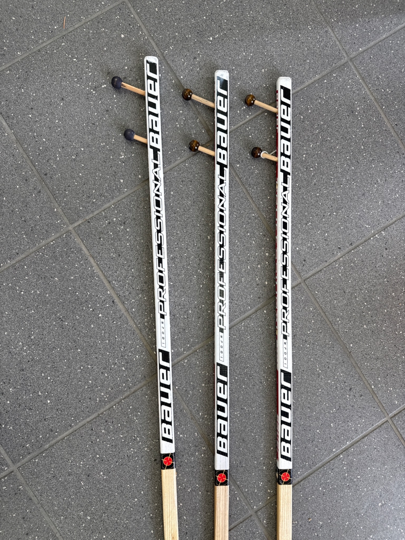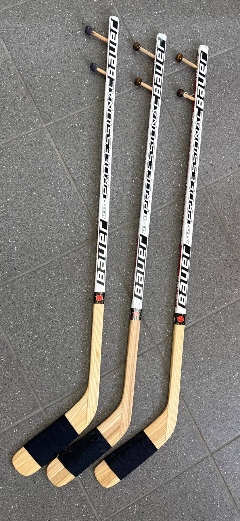 Three Janeb Bauer floorball/hockey sticks featuring wooden shafts and plastic blades. Each stick is designed with standard grip coverings on the blade area for enhanced control. The sticks display signs of use, such as slight wear on the blades and shafts. Suitable for floorball or recreational hockey use. Length and other specific dimensions are not provided.