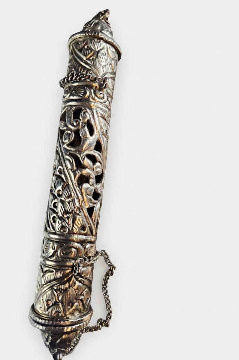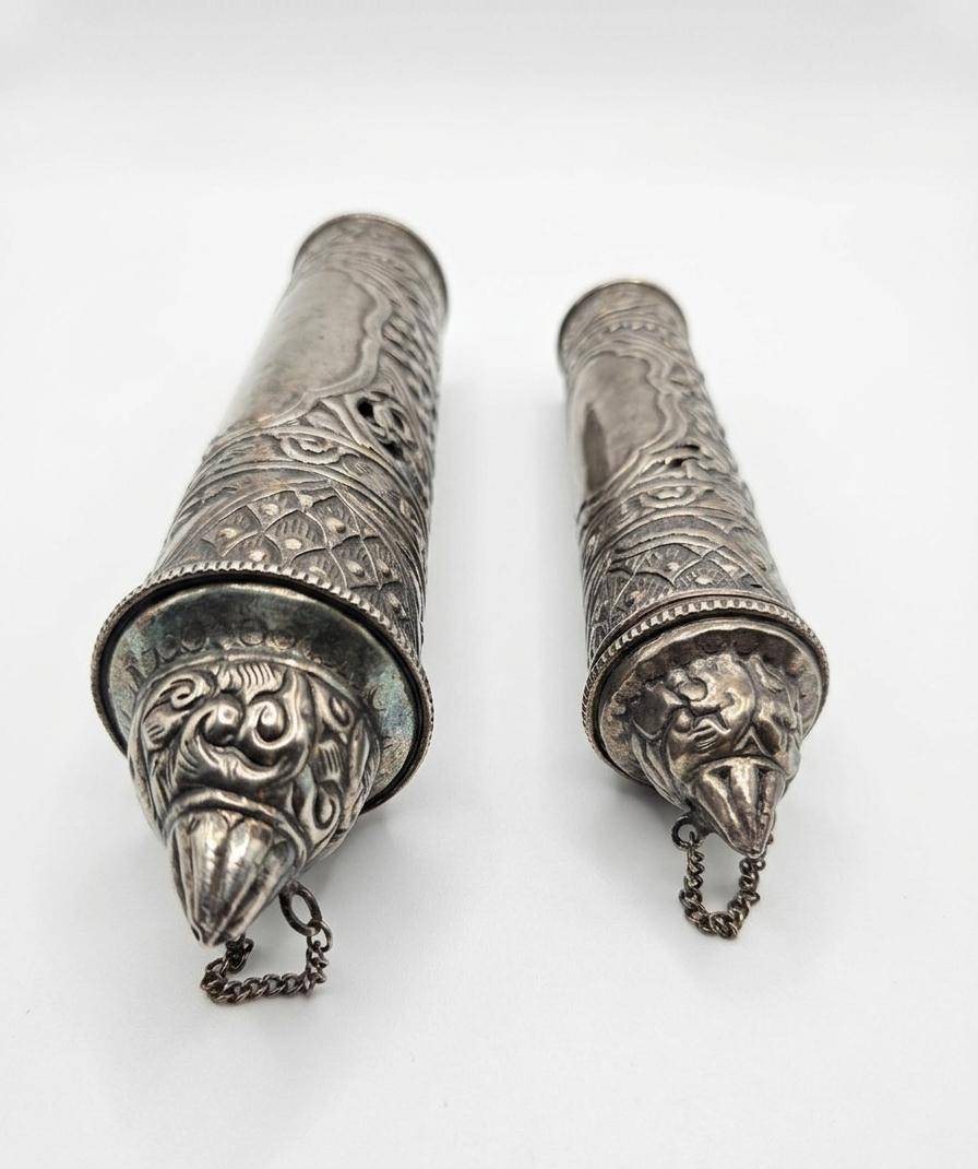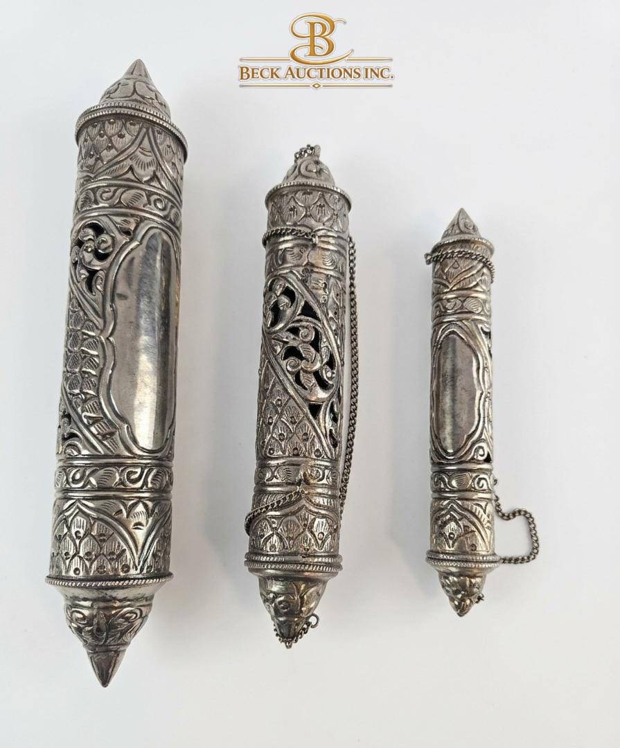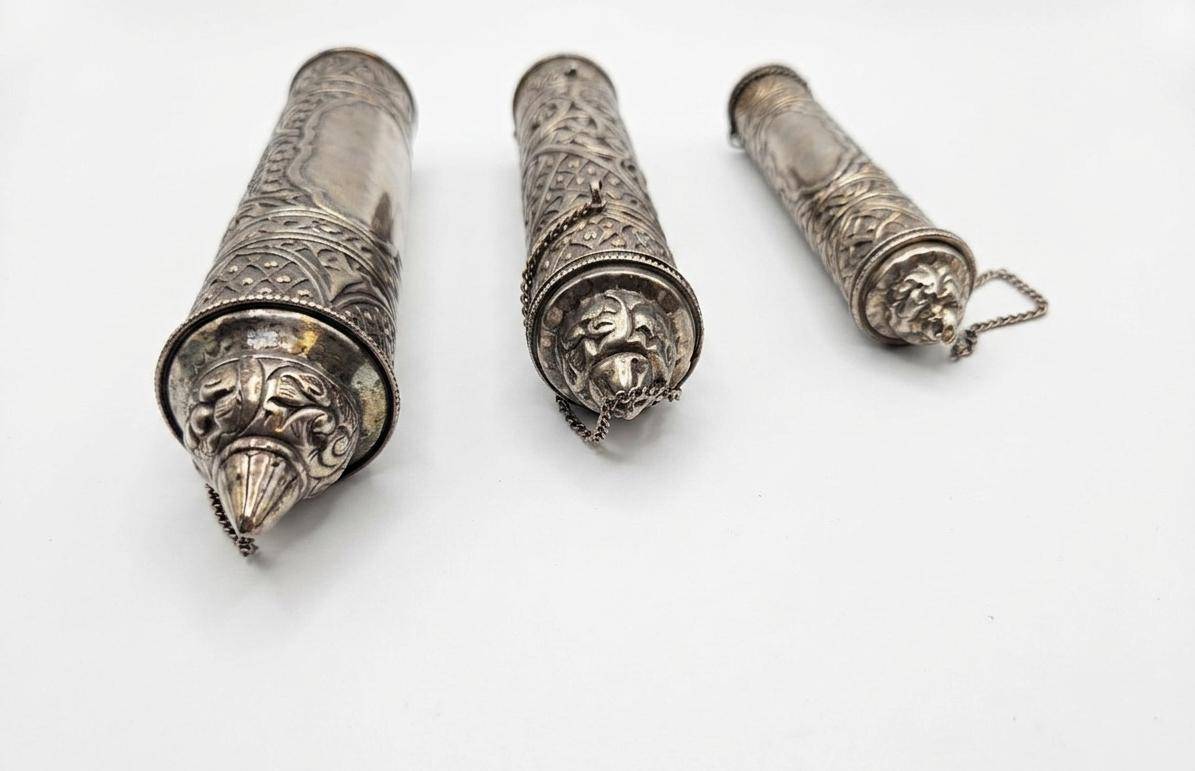 Three intricate silver cases featuring elaborate designs and fine detailing. The cases are structured in cylindrical form with varying heights of 8 inches, 10 inches, and 12 inches. Each piece includes distinctive patterns and a small chain for functional or decorative use. This set is both decorative and collectible, offering a great addition to any connoisseur’s collection.