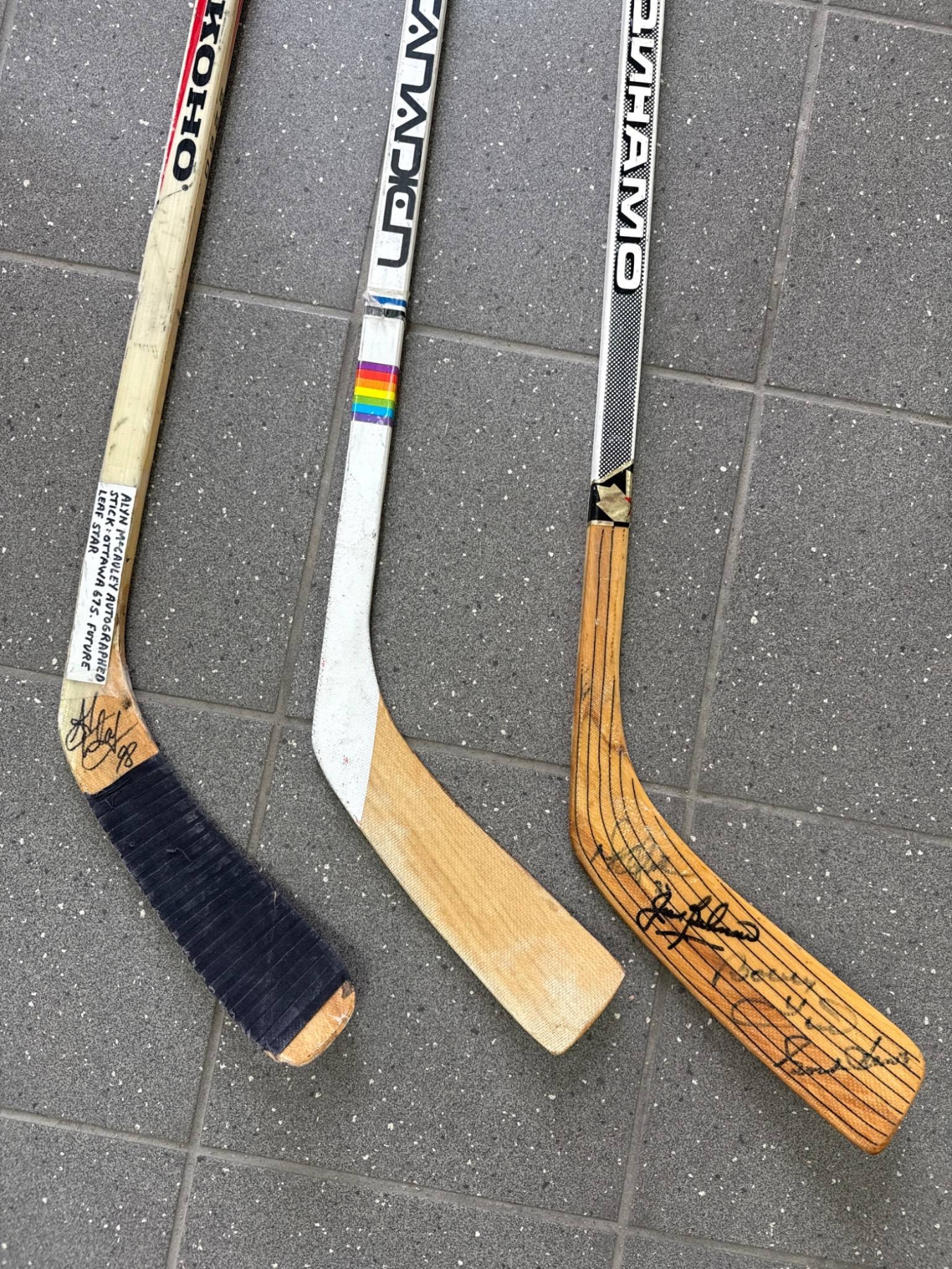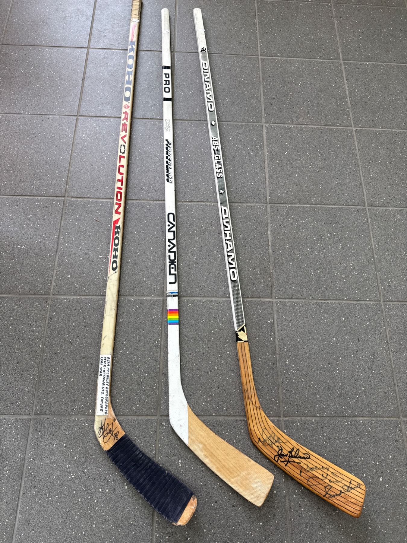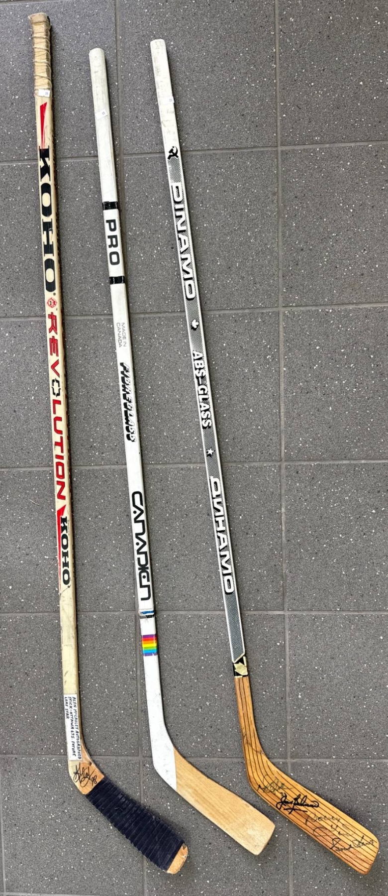 Three signed hockey sticks featuring wooden blades and various branding details. Each stick includes autographs, with signatures located on either the blades or shafts. The sticks display wear consistent with previous use but remain intact. Specific models include brands such as Canadien and Koho Revolution. Great for memorabilia collectors or hockey enthusiasts.