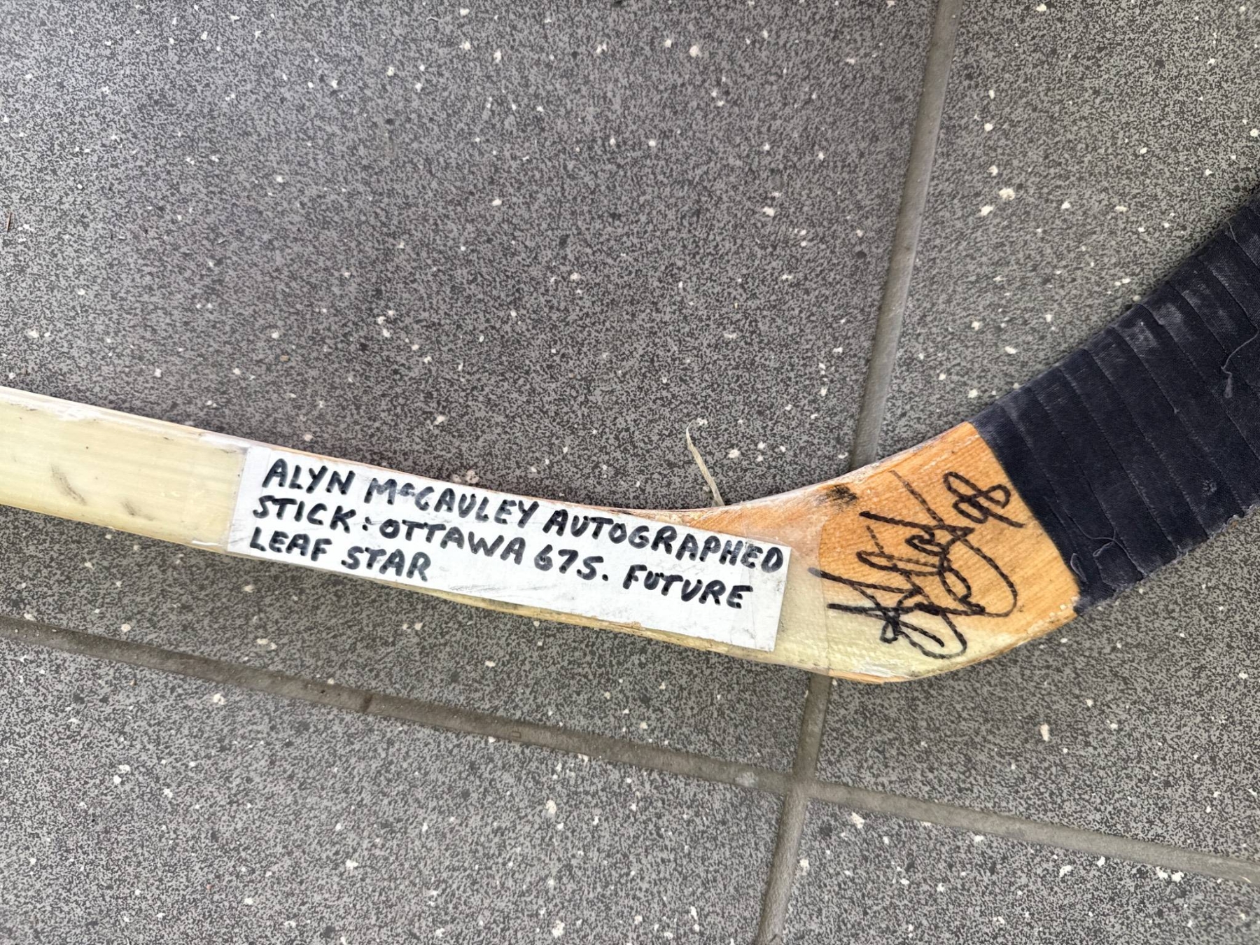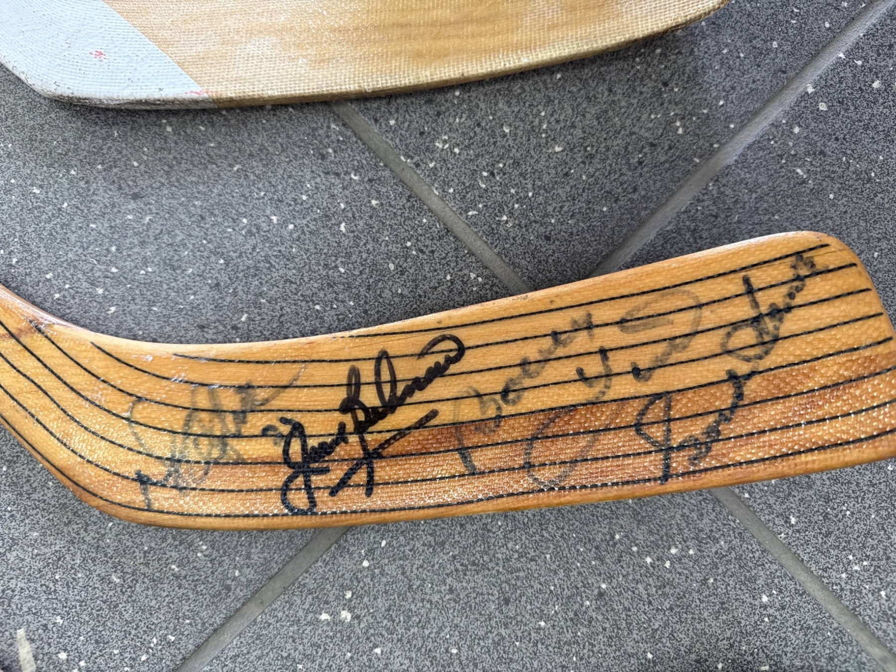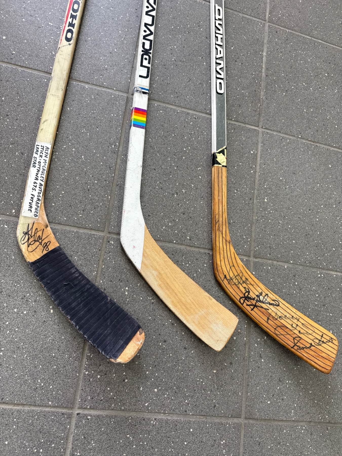 Three signed hockey sticks featuring wooden blades and various branding details. Each stick includes autographs, with signatures located on either the blades or shafts. The sticks display wear consistent with previous use but remain intact. Specific models include brands such as Canadien and Koho Revolution. Great for memorabilia collectors or hockey enthusiasts.