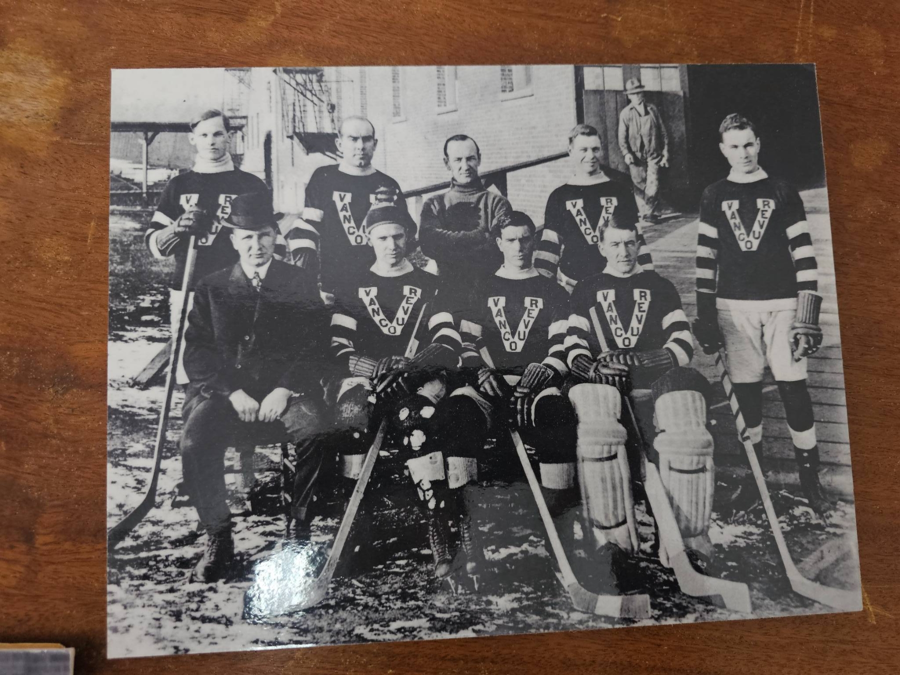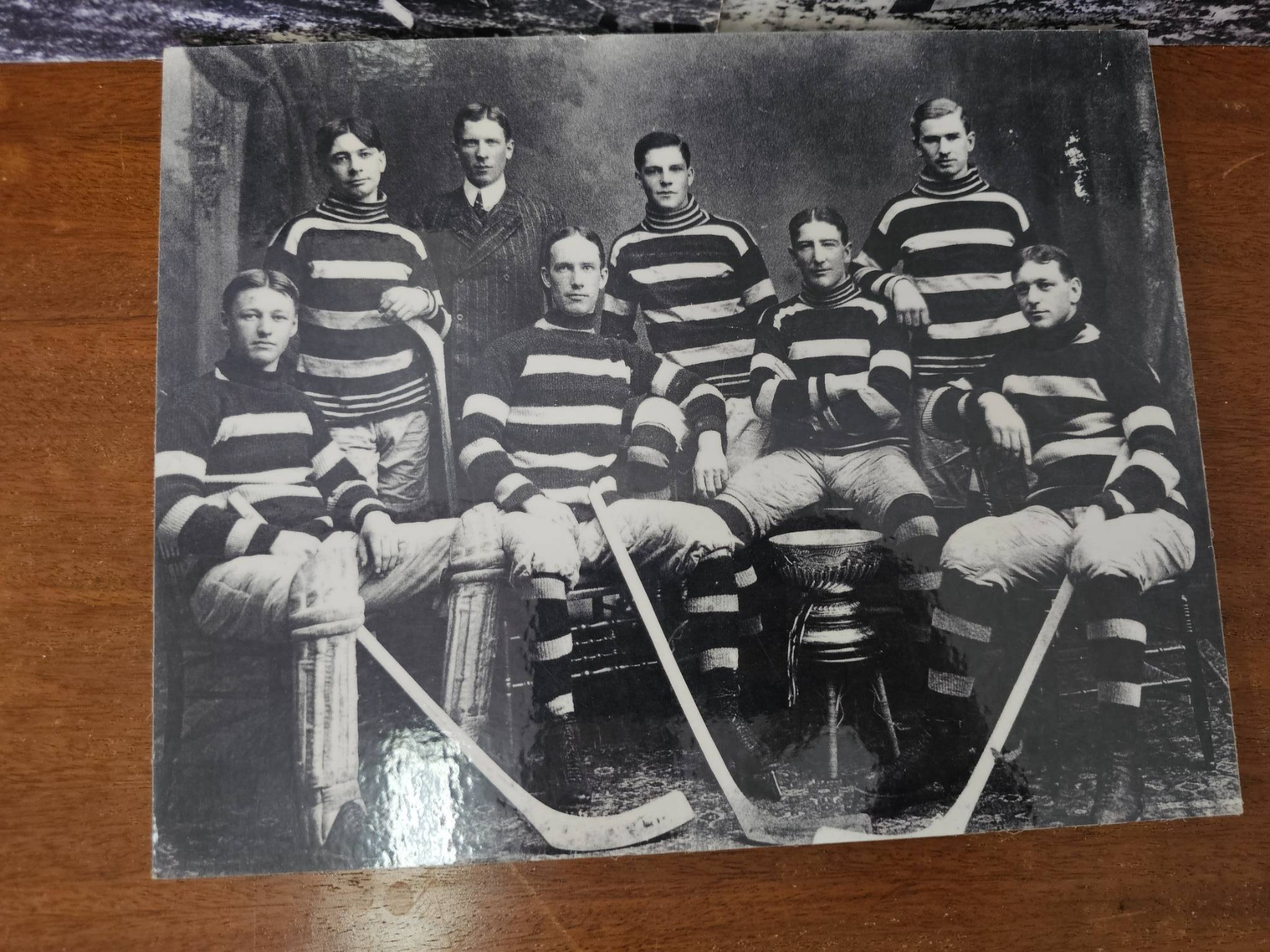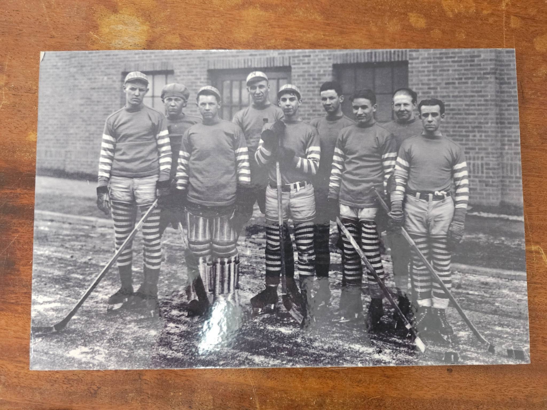 Three black-and-white photos featuring hockey teams. The pictures capture athletes dressed in striped uniforms and holding hockey sticks. Mounted on sturdy backing for preservation, the reverse sides show notation markings but no further details about origins. Condition consistent with preserved vintage items, with visible wear on mounting material.