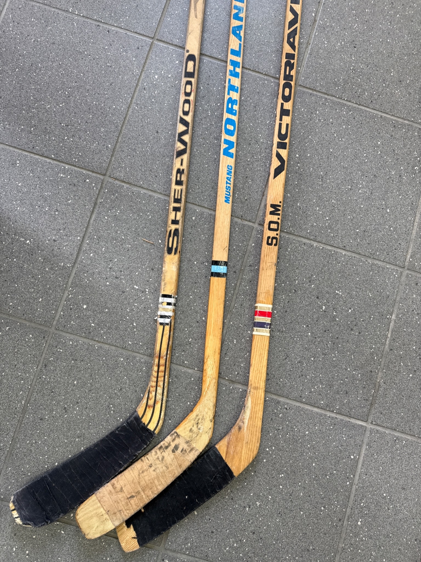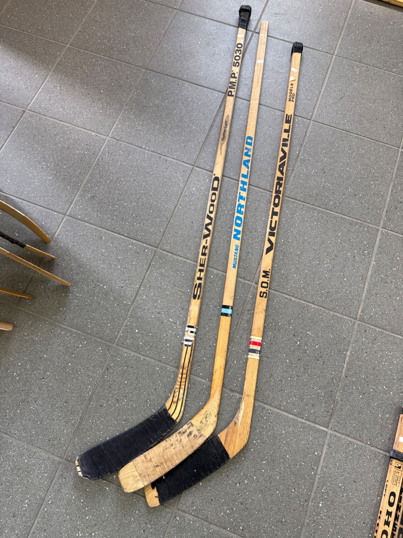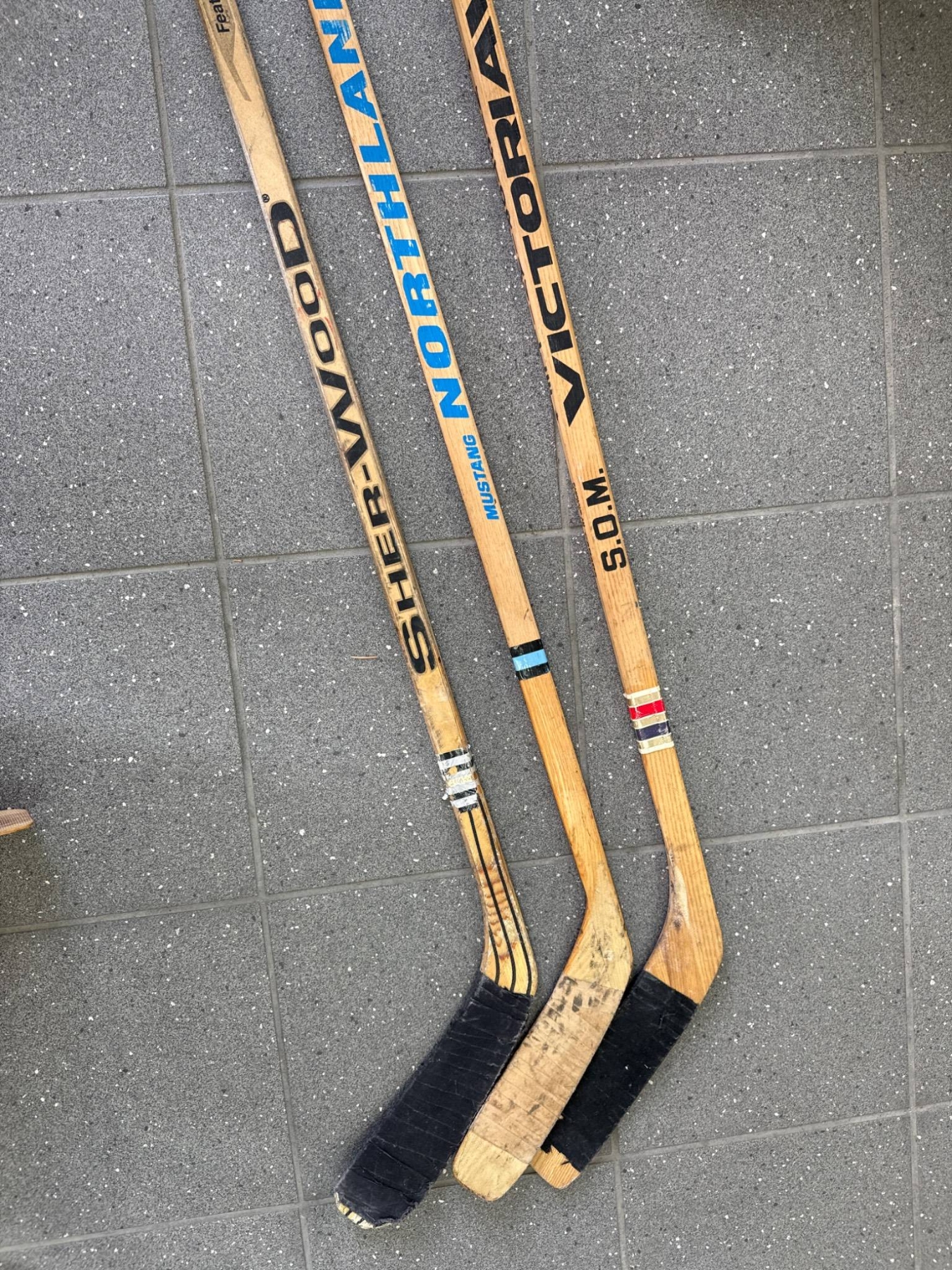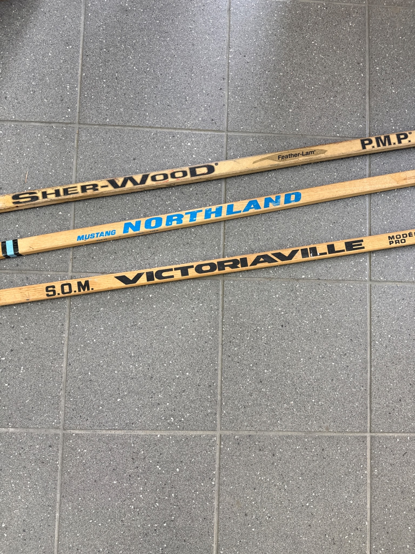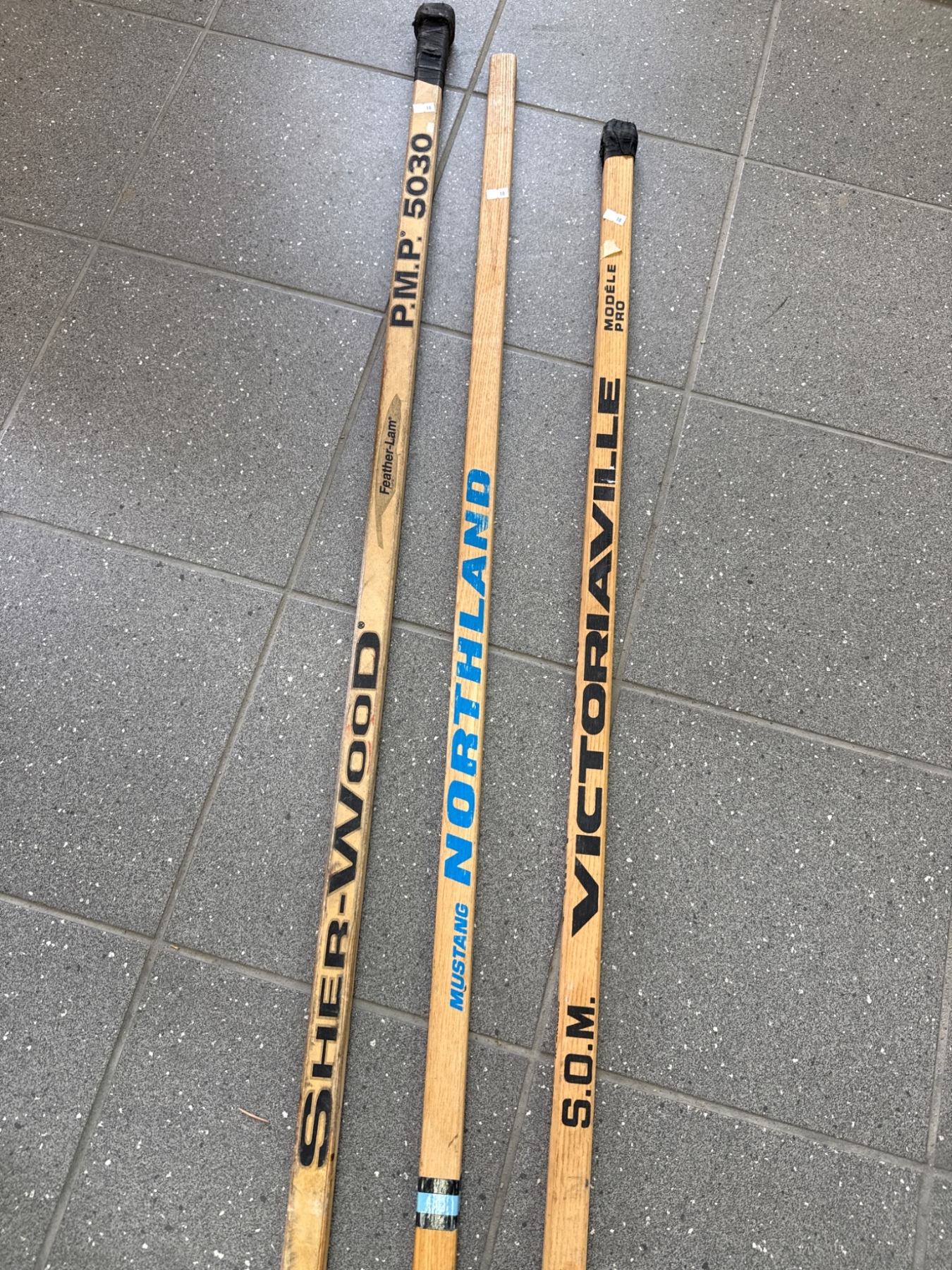 Three wooden hockey sticks from notable brands: Sher-Wood PMP 5030, Northland Mustang, and S.O.M Victoriaville. Each stick is constructed from wood with taped blades. Signs of prior use are evident, including scuff marks and wear, consistent with their usage. A classic selection ideal for sports enthusiasts or collectors.