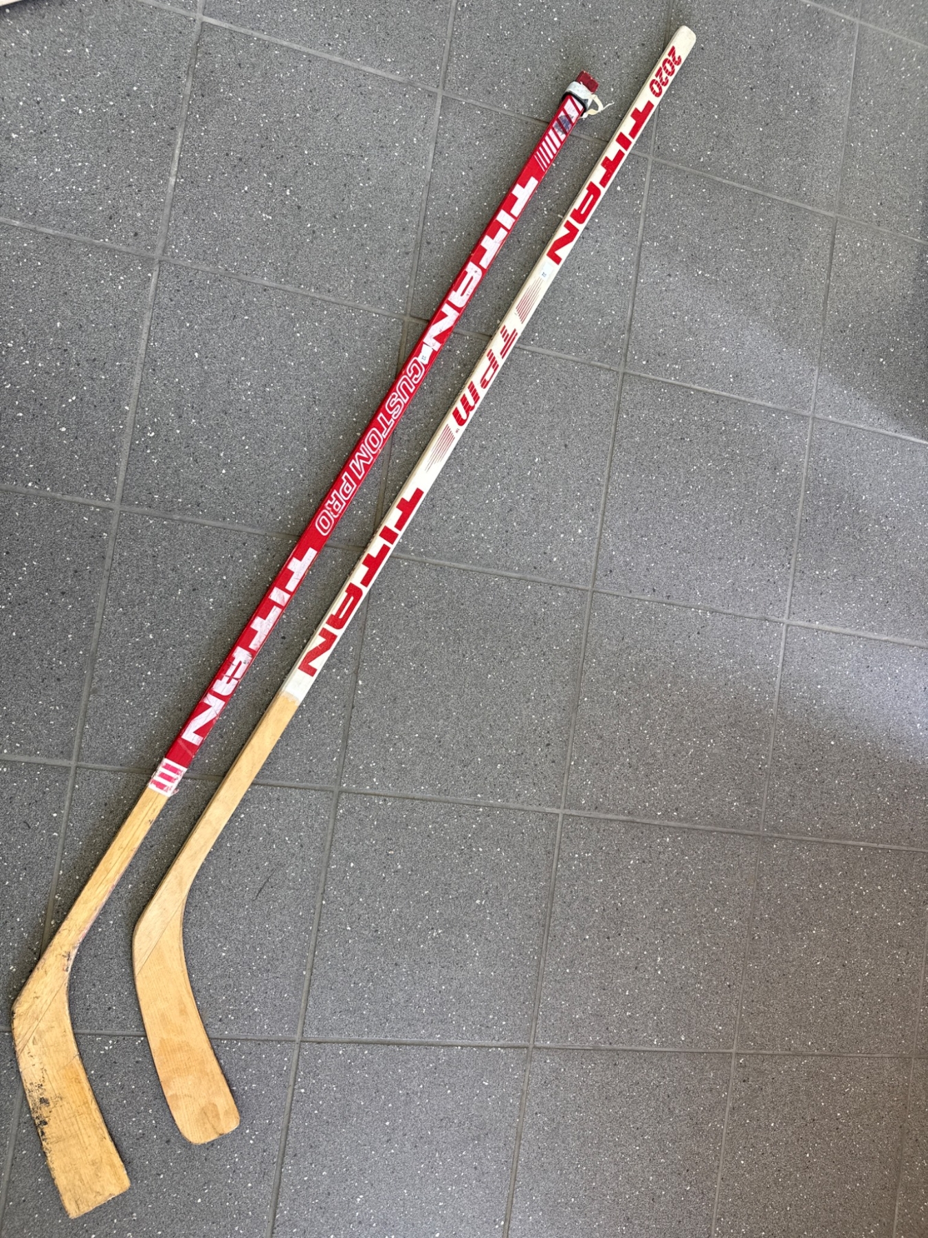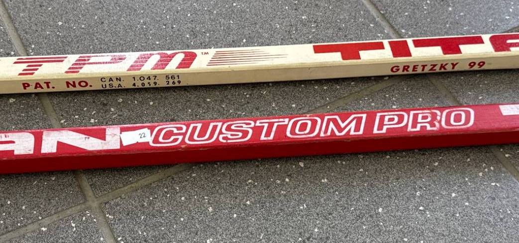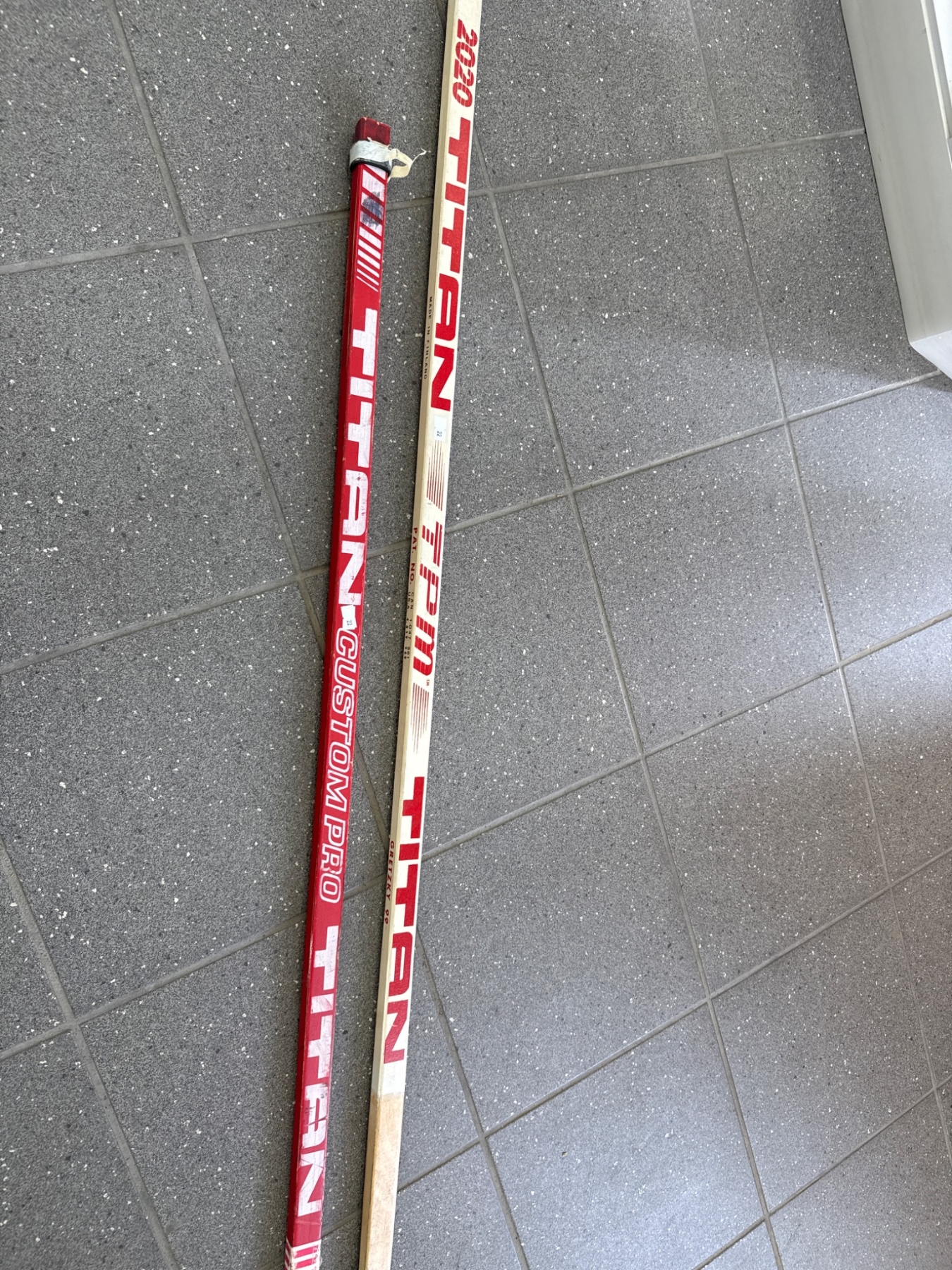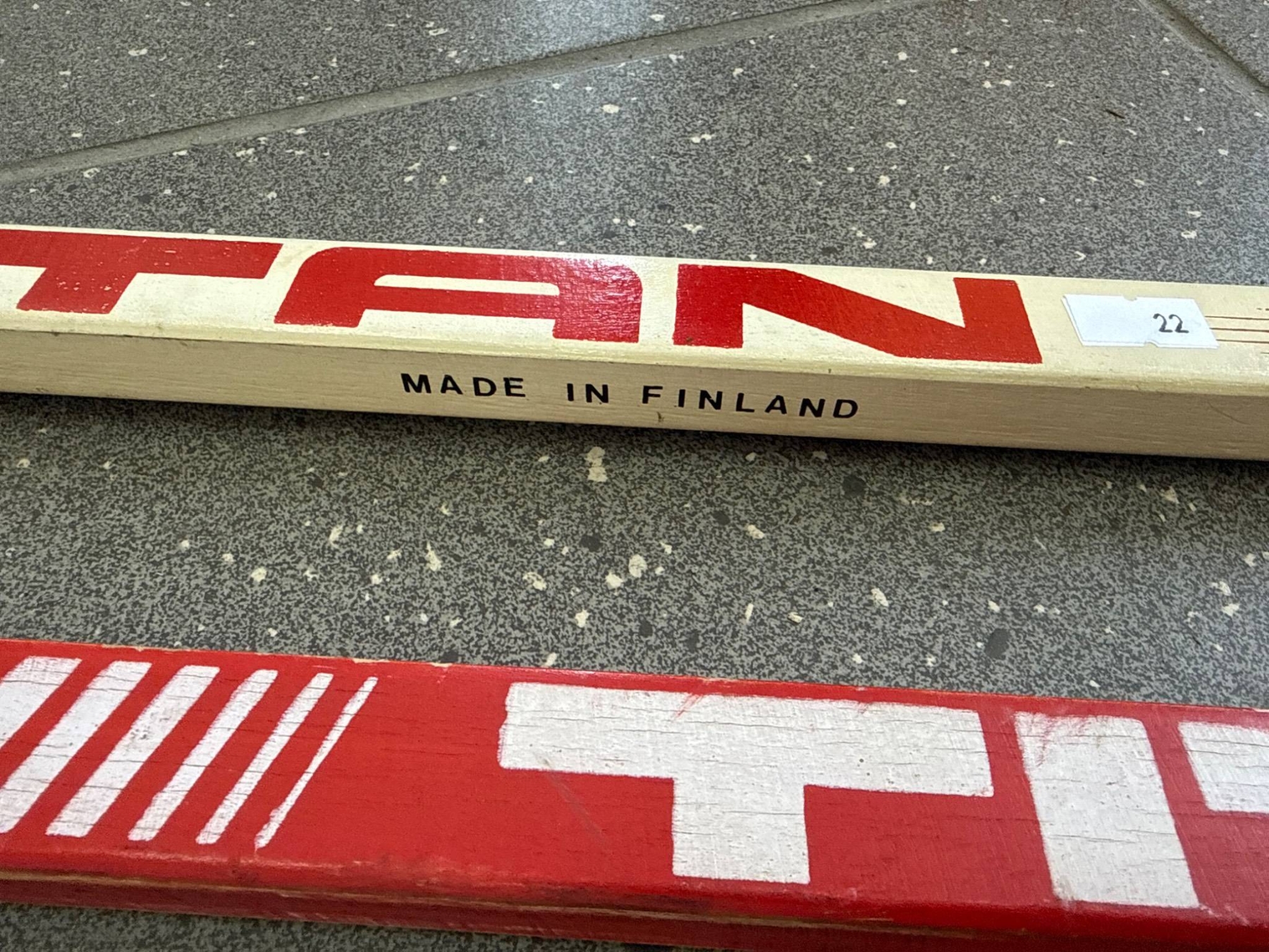 Titan hockey sticks featuring "Made in Finland" markings. Includes a red Titan "Custom Pro" model and a white/red Titan "220" model. Both sticks are constructed from wood and display signs of prior use, including wear to the blades and shafts. Suitable as collectible sports equipment or for display purposes.