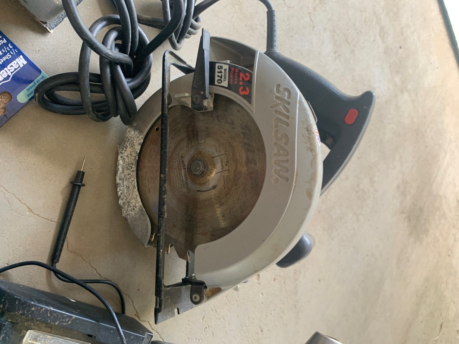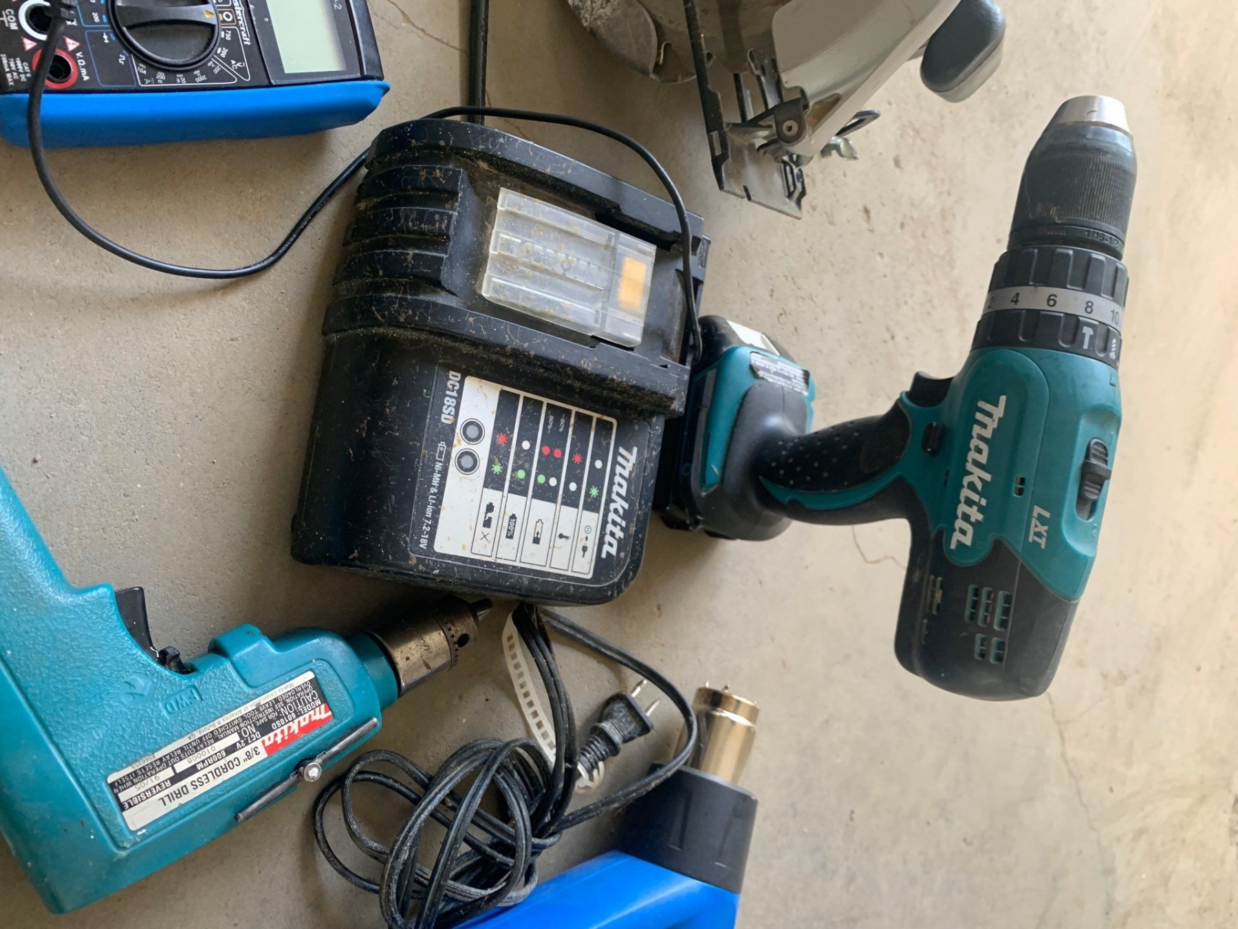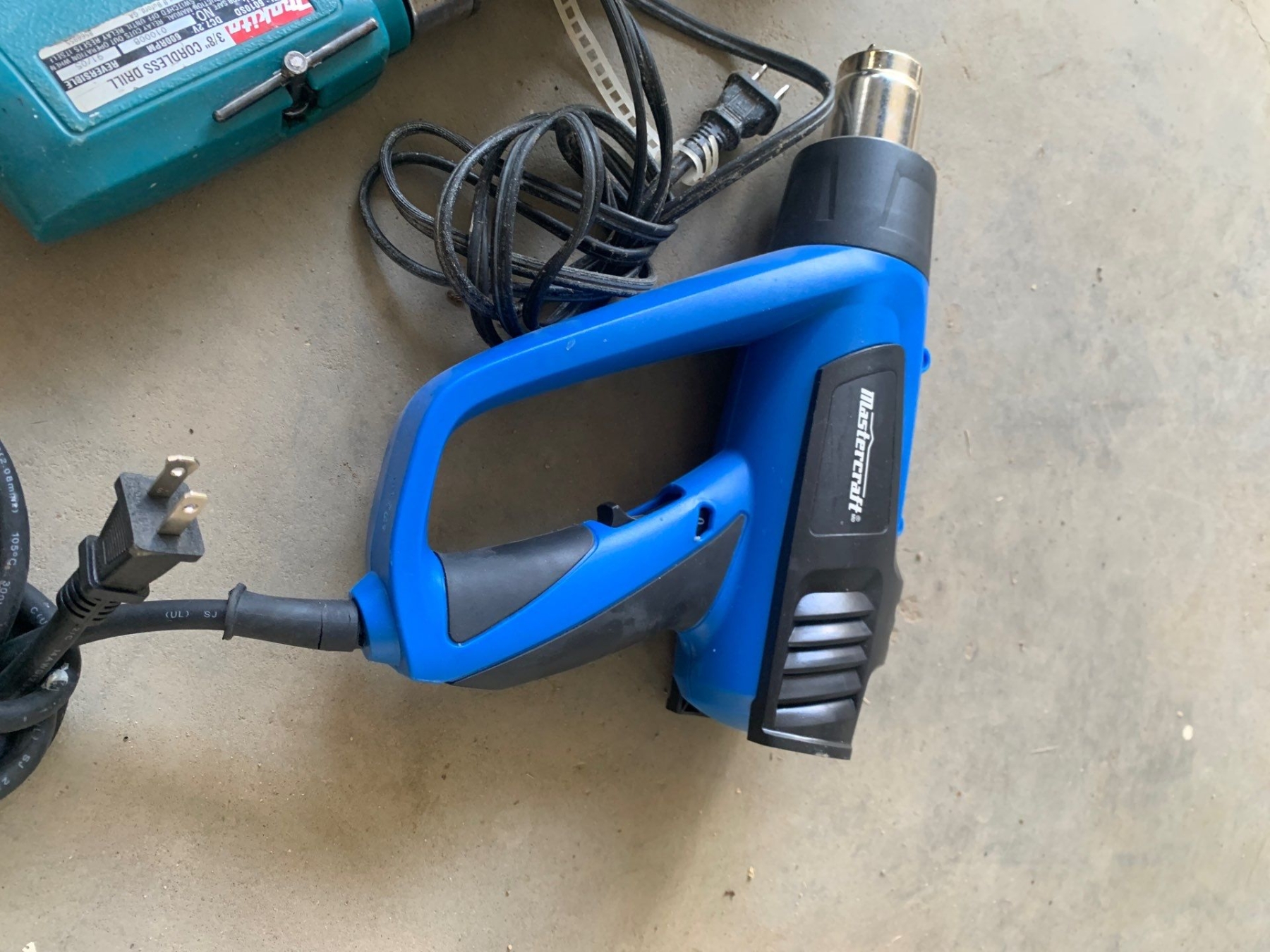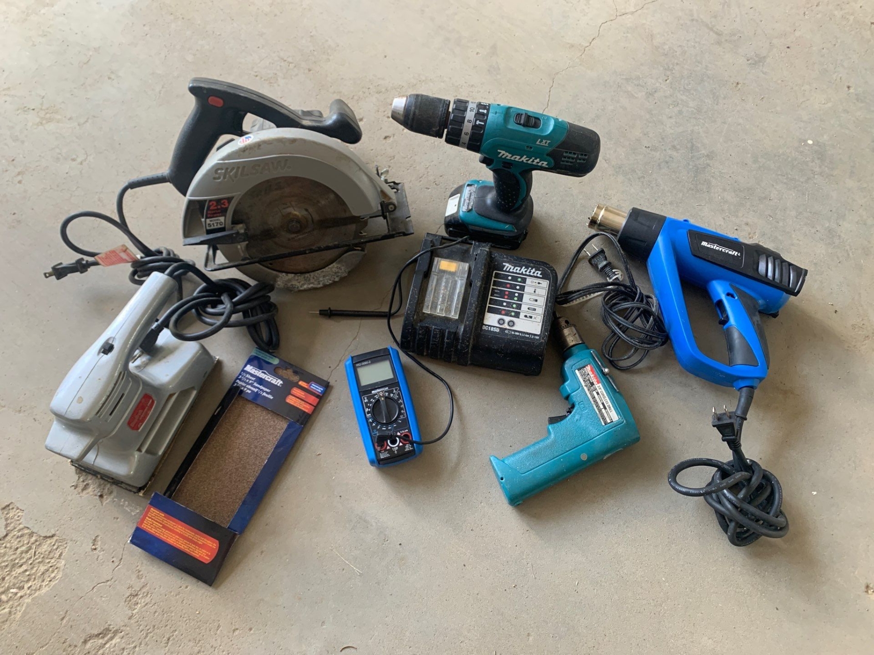 Tool Lot ShopCraft Industrial Orbital Sander, Skilsaw Model 5170, Makita 18V drill with charger LXT, Makita 3/8” cordless drill no charger, Mastercraft Heat Gun, MasterCraft Volt Tester Model 052-0060-2