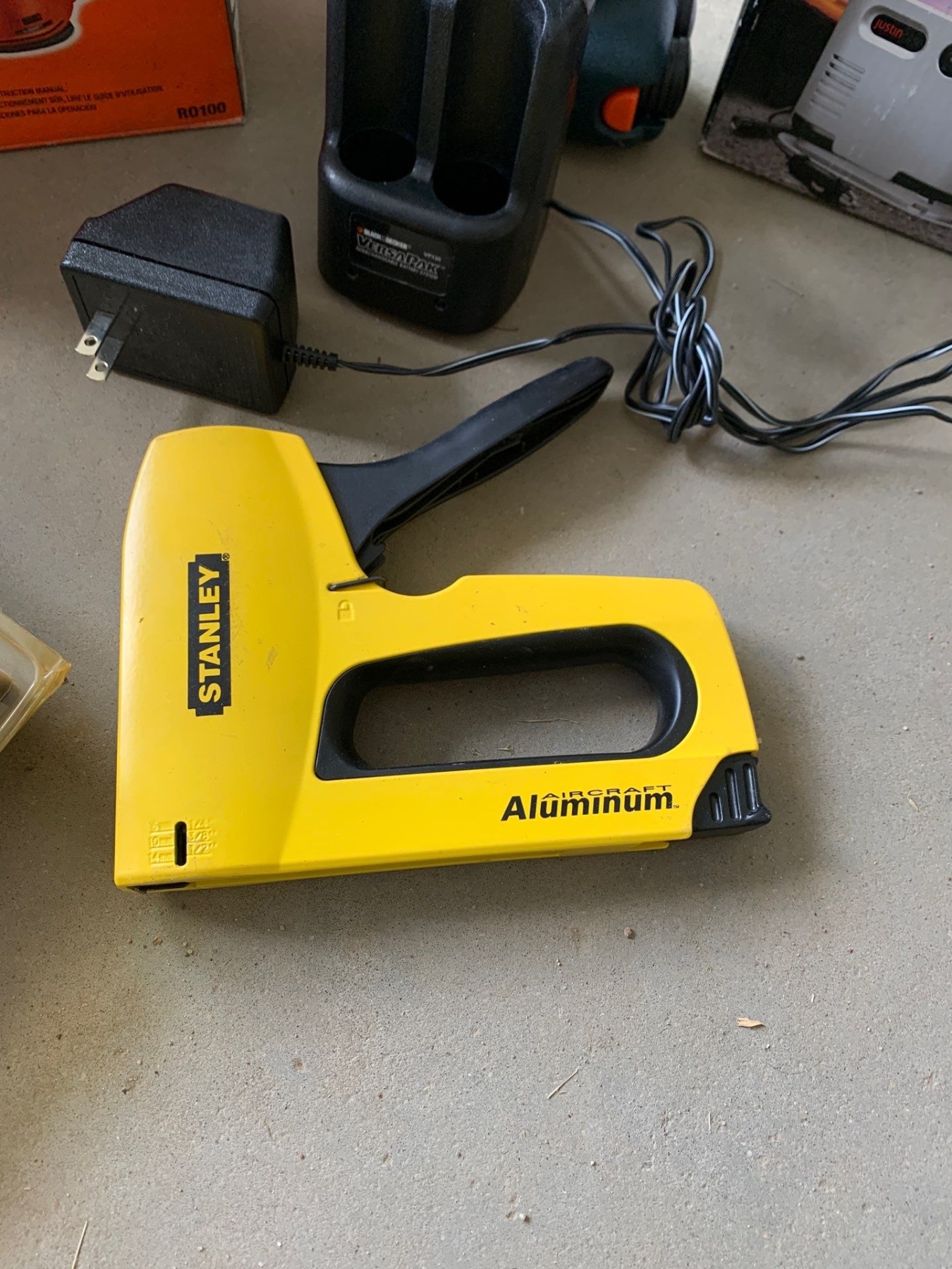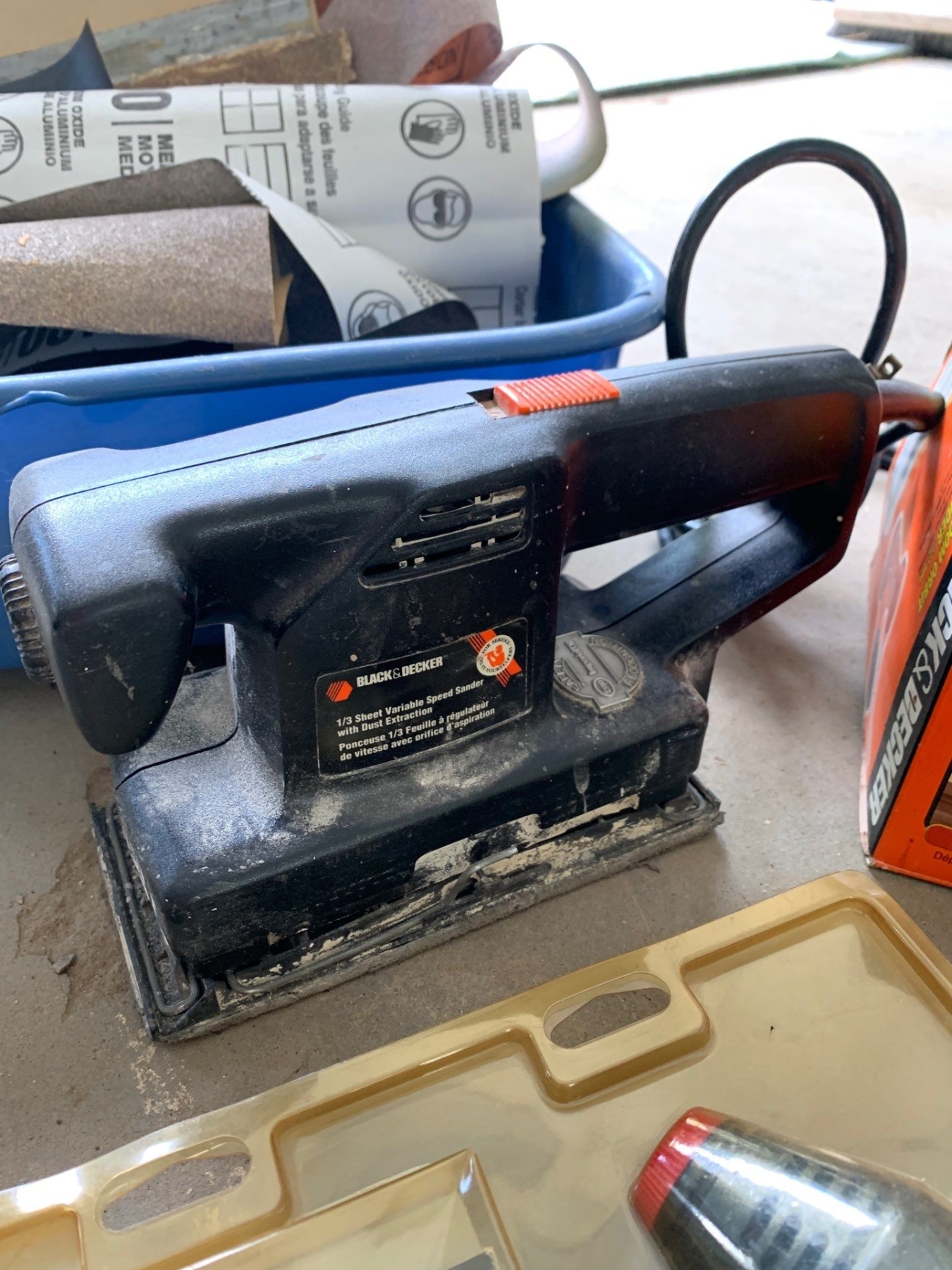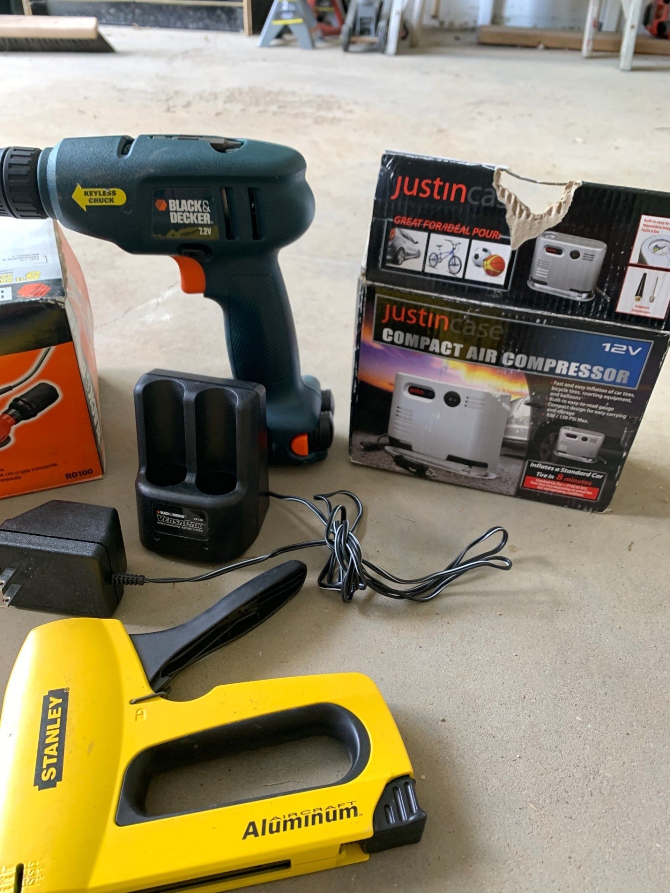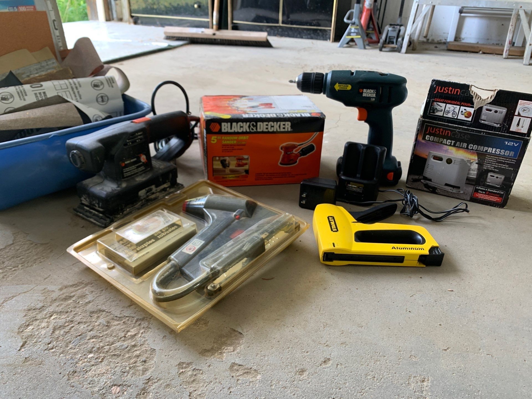 Tool lot Black&Decker Variable Belt Sander, tote of sandpaper, Black and Decker 5” Orbit Sander, Black&Decker 7.2V drill with charger, JustinCase 12V compact air compressor, Stanley Staple Gun, Sears Heavy Duty Electric Staple Gun New in Box