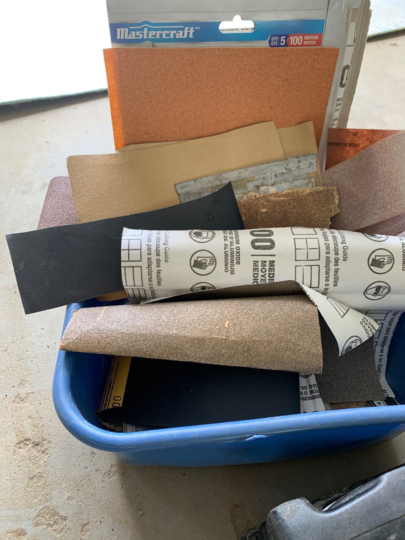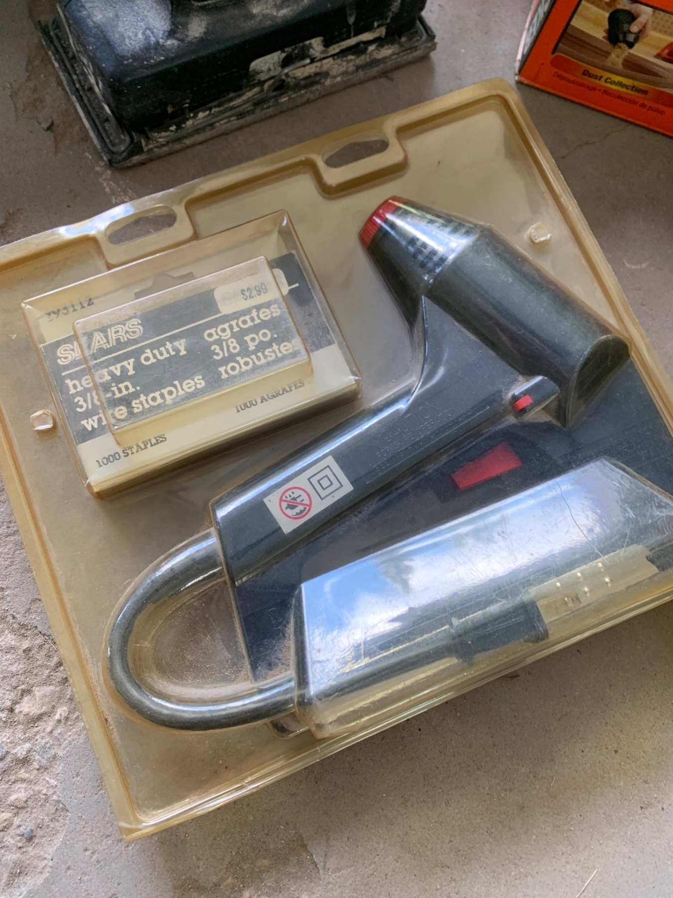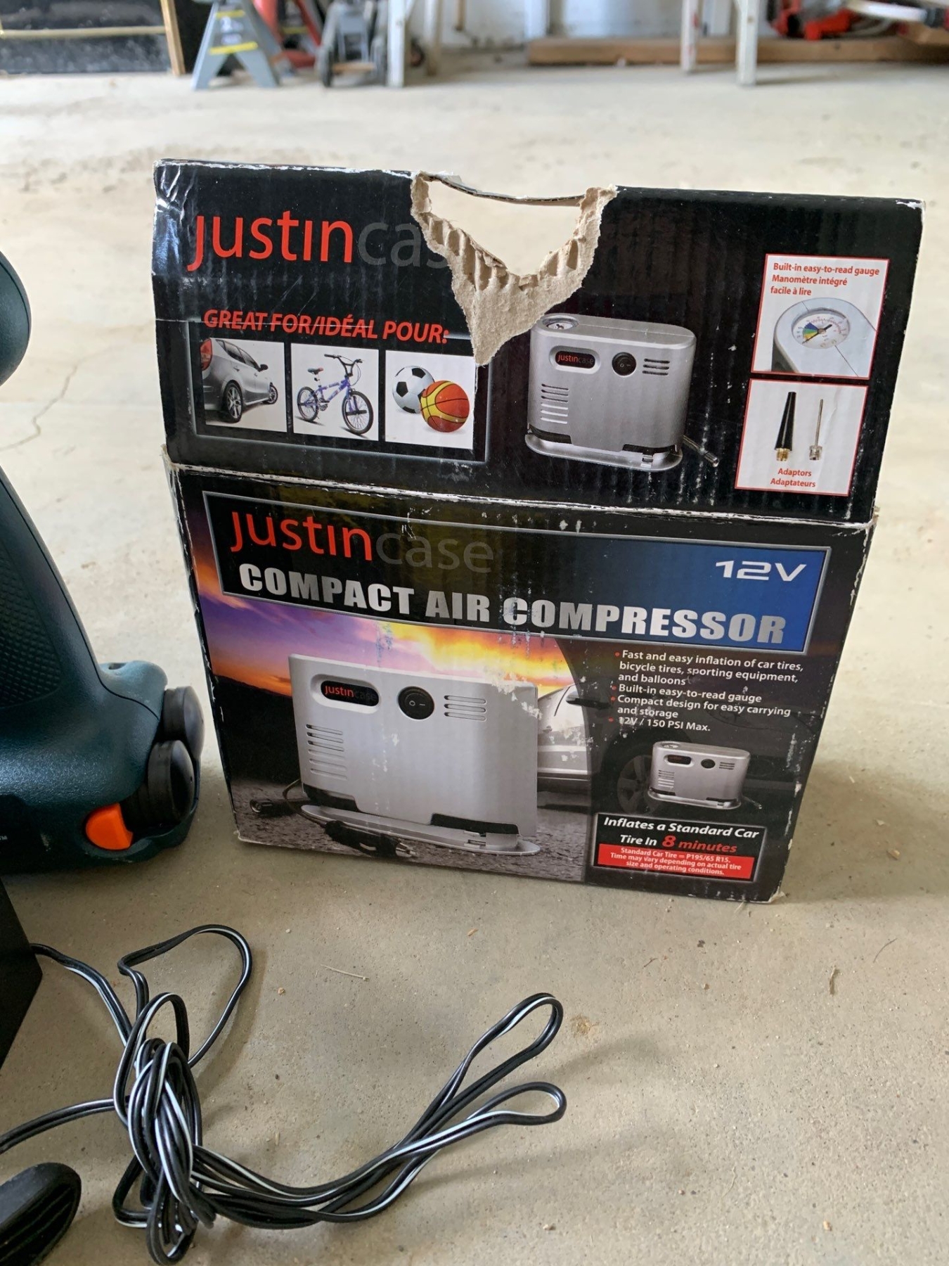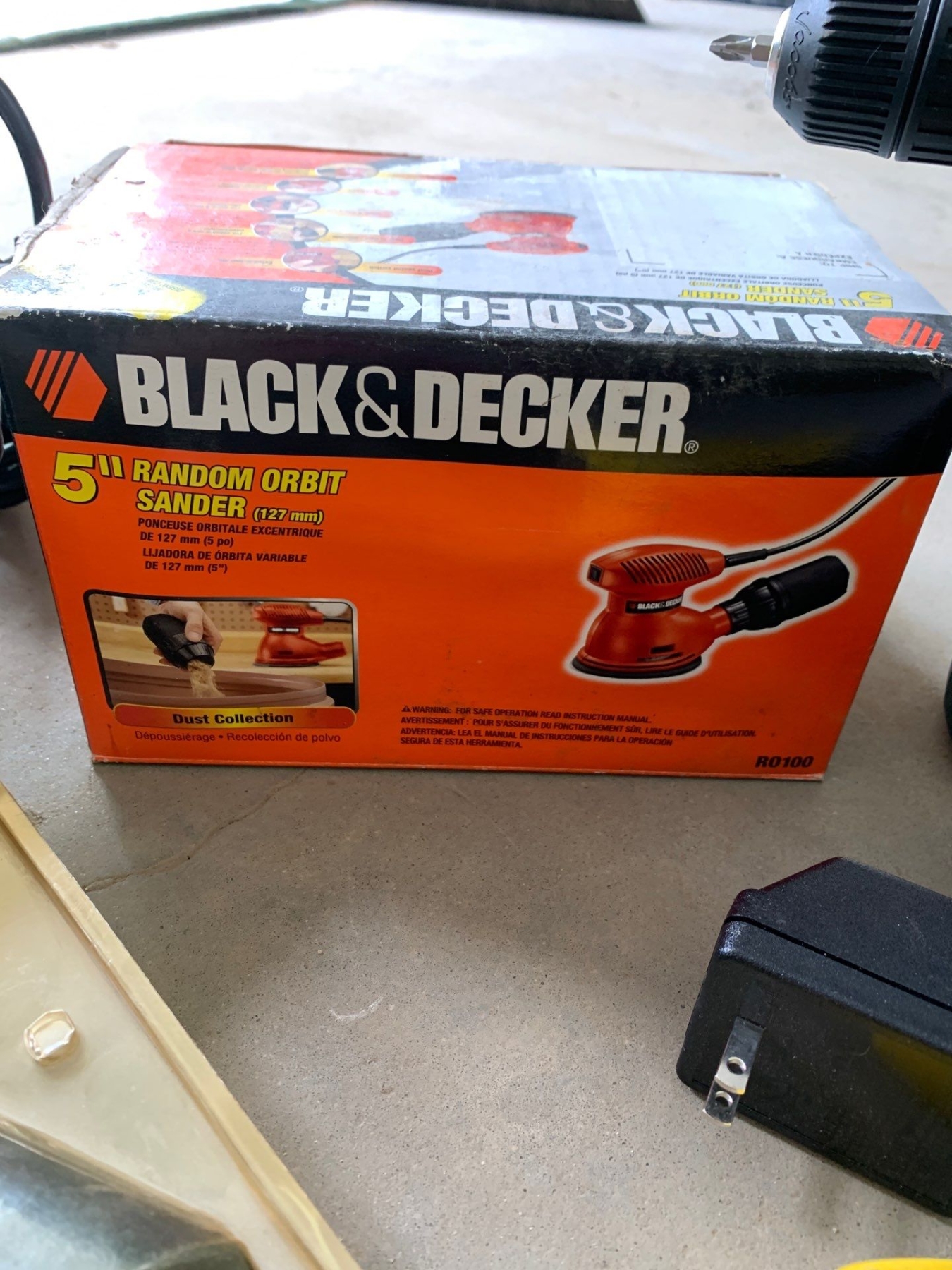 Tool lot Black&Decker Variable Belt Sander, tote of sandpaper, Black and Decker 5” Orbit Sander, Black&Decker 7.2V drill with charger, JustinCase 12V compact air compressor, Stanley Staple Gun, Sears Heavy Duty Electric Staple Gun New in Box